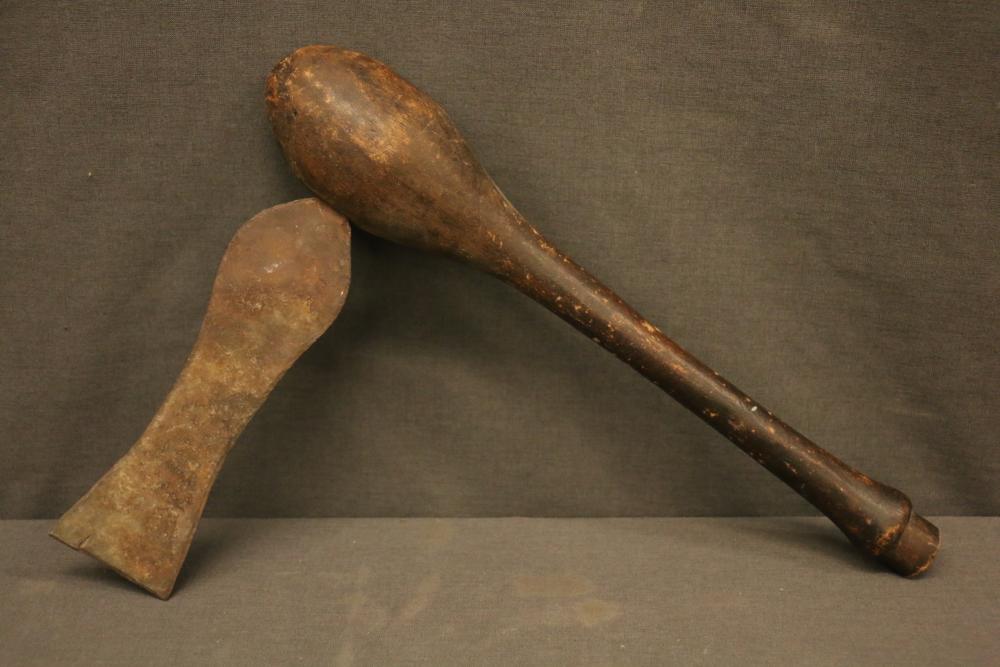 ZAPOZAPO CEREMONIAL AX. Luba people, Democratic Republic of Congo. Used as an insignia of status and wealth, and sometimes bride wealth. The handle of this example has the typical bulb top of Luba Zapozapo axes and a tulip-shaped blade. Handle H 14.25in. Blade L 7.25in. Wood, iron.