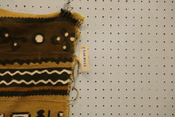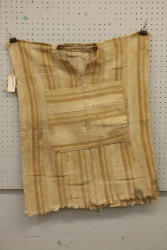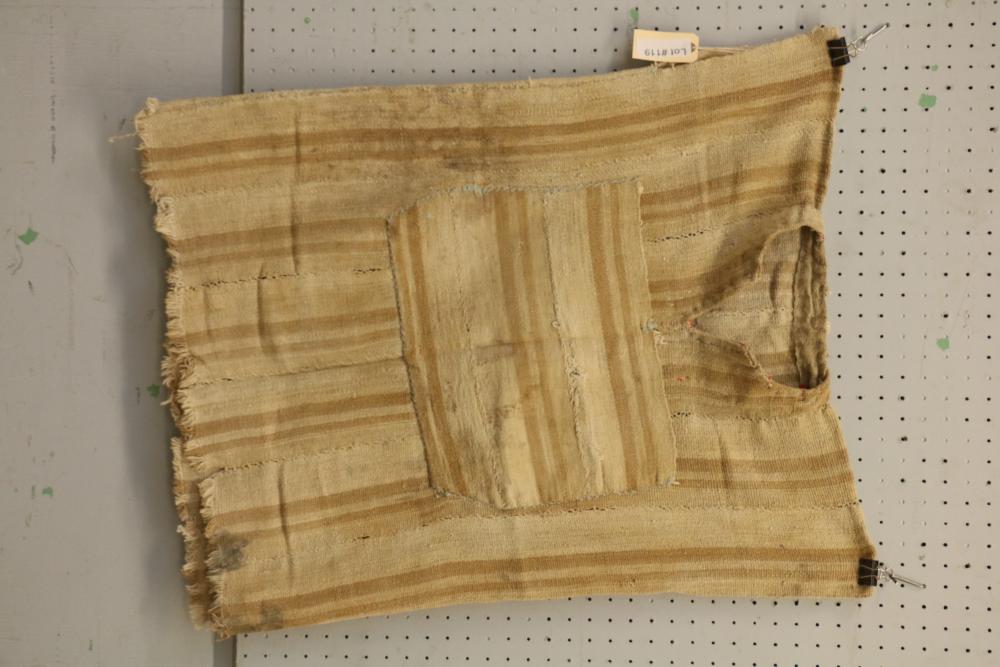 MAN’S VEST OR HUNTING SHIRT. Mende people, Sierra Leone. This garment was created from 12 hand sewn strips, hand woven with hand spun cotton. It has an asymmetrical beige warp stripe design characteristic of this type of Mende country cloth. The beige color comes from the use of natural brown cotton. Heavy cloth such as this provides protection against mosquitoes. Textiles woven using hand spun cotton are no longer made. Collected in Sierra Leone in 2005. It was estimated to be at least 50 years old. L 36.5in. W 24.5in. Hand spun cotton. See lamb 1984 pp. 100-104.