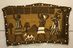 Pictorial bogolan (“Mudcloth”) textile depicting two women with head loads of fire wood followed by a farmer with a hoe on one shoulder. 10 strips of hand woven country cloth machine sewn. 71in. x 46in. Bamana people, Segou, Mali. See “Bogolanfini Mud Cloth” by S. Hilu and I. Hersey.