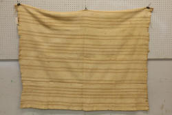 COUNTRY CLOTH WRAP. Mende people, Sierra Leone. This old fringed cloth was made from 12 hand sewn strips that were hand woven from hand spun cotton. This old lappa country cloth has the traditional Mende warp stripe pattern derived from the use of unbleached brown cotton yarn. L 64in. W 52in. Cotton. See Lamb 1984 p. 102.