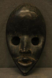 GUNYEYA FACE MASK. Dan people, Liberia. Characterized by a prominent, protruding forehead that occupies half of the face, large round eyes, prominent lips, and a triangular chin. Masks such as this were worn by men in races. H 9in. Wood, pigment. See Bacquart 1993 p36-37 and Rosen, Rosen 2013 p22-23.