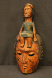 FACE MASK. Anang (Ibibio) people, Nigeria. The arms of the female figure seated on top of this mask are articulated at the shoulders with nails. She has the same hair style with braids hanging on either side of the face as the mask. The mask is decorated with typical facial tattoo designs. Custom wall mount. H 18in. Wood, pigment, nails. See Rosen, Rosen 2013 p.147 Fig 205 for similar example.
