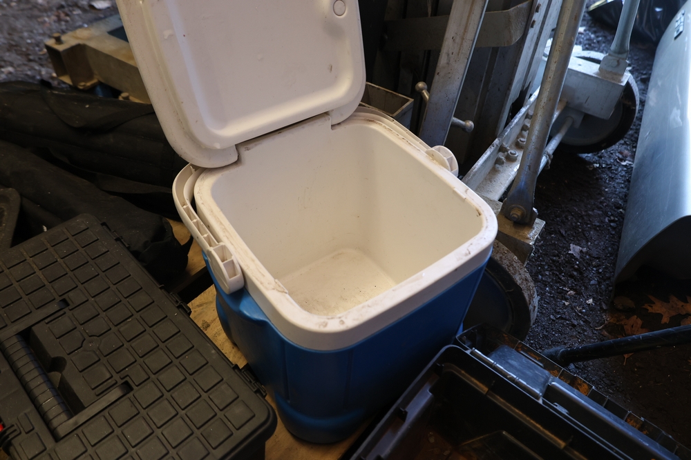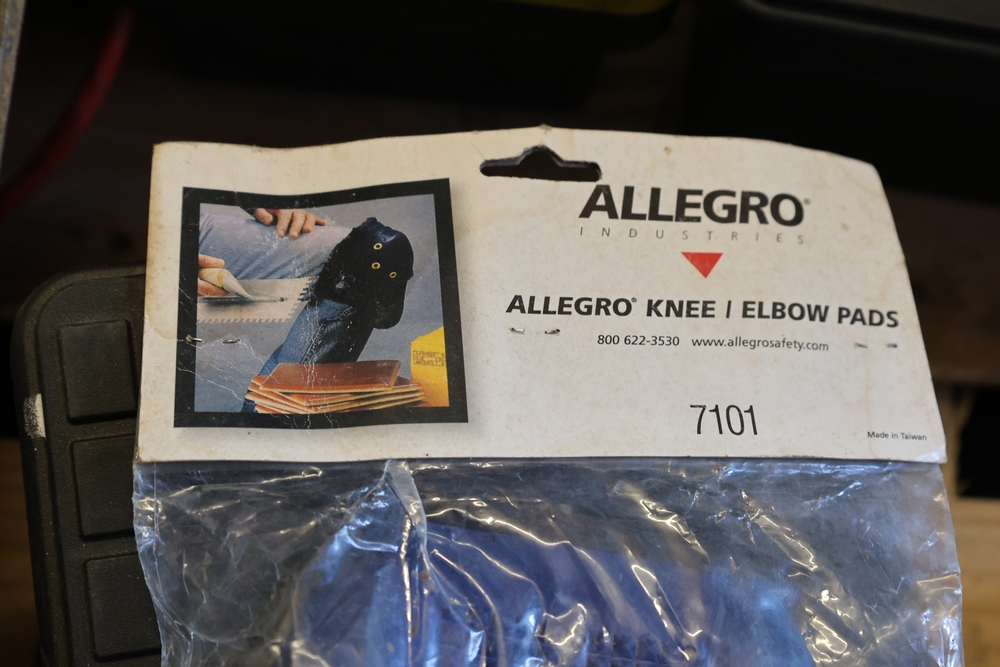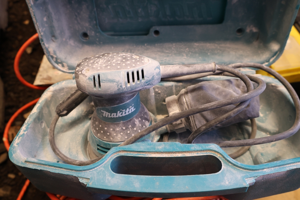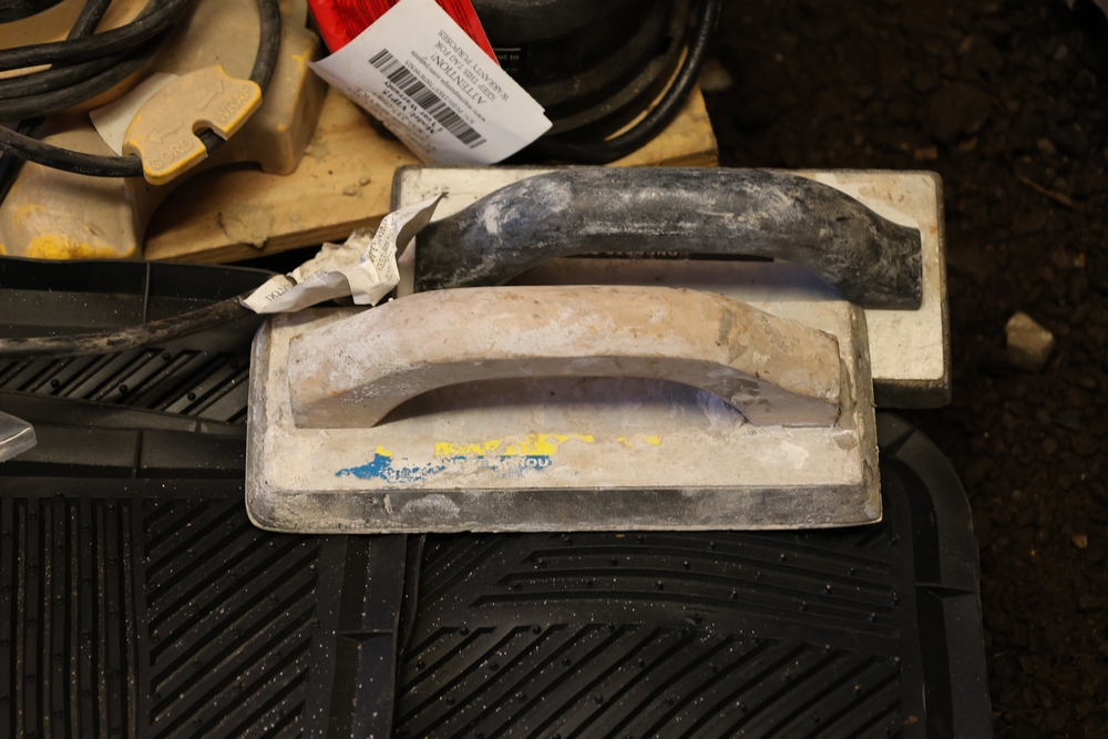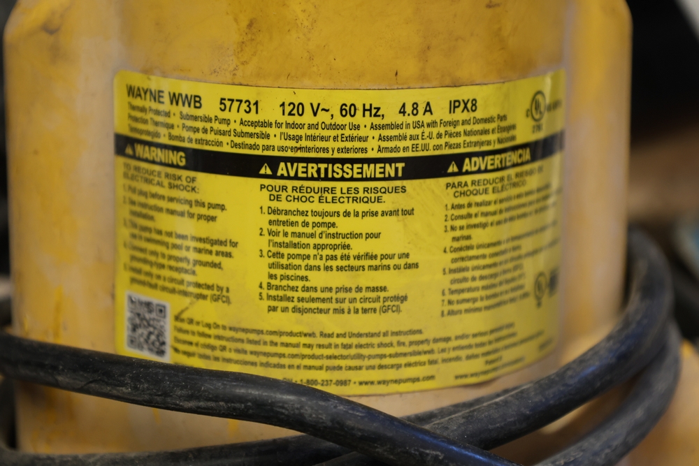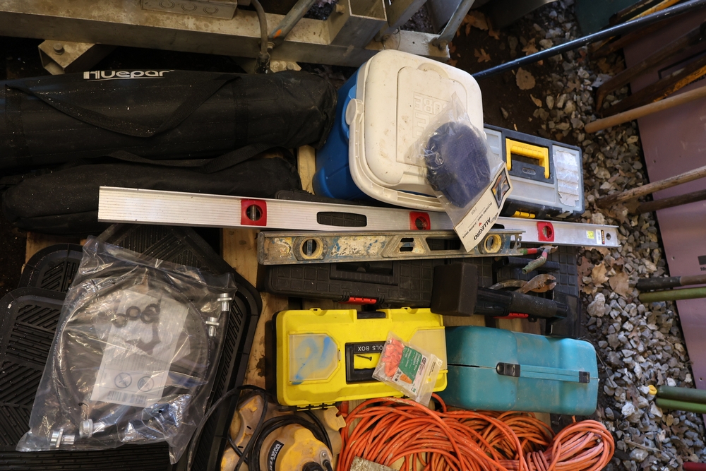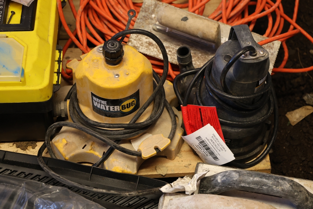 Assorted tools and shop items including Genie components, Wayne WaterBUG submersible pump, Wayne 1/5 HP utility pump, Makita BO5030 sander, Allegro knee/elbow pads, extension cords, toolboxes, levels, cooler, and floor mats.