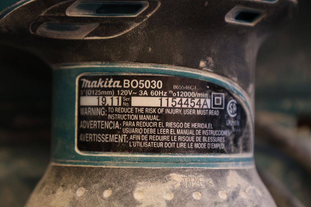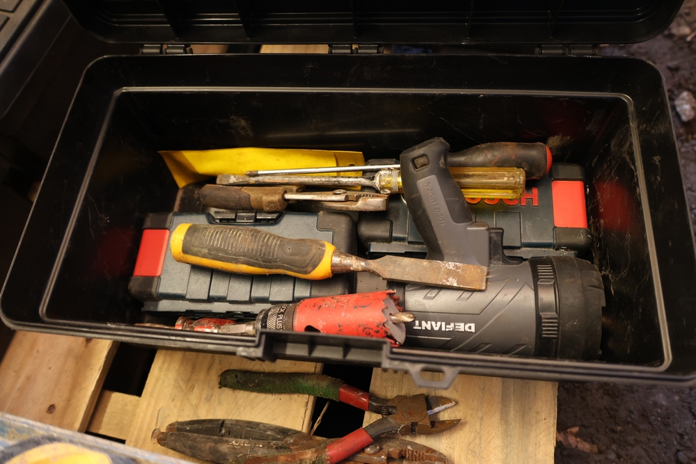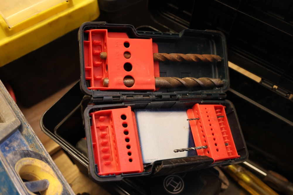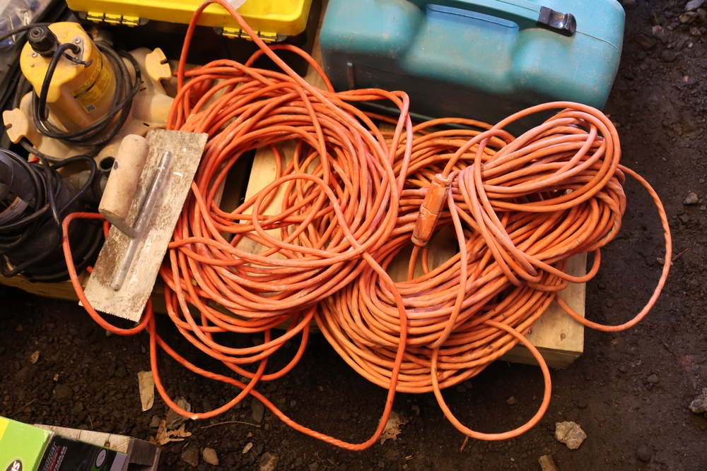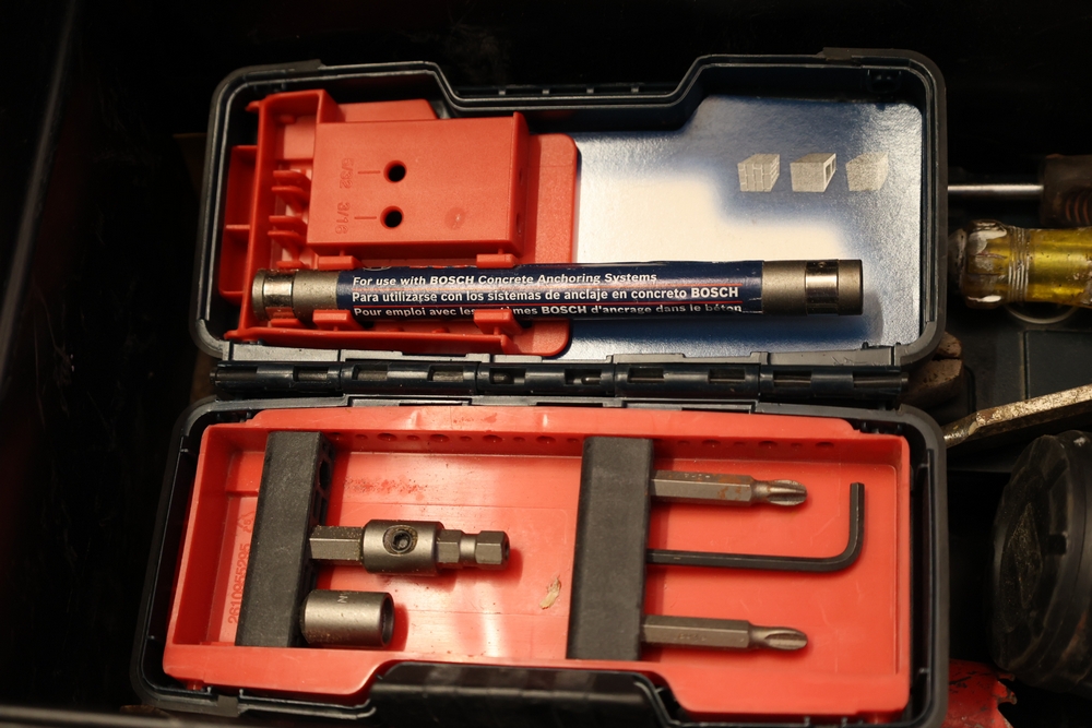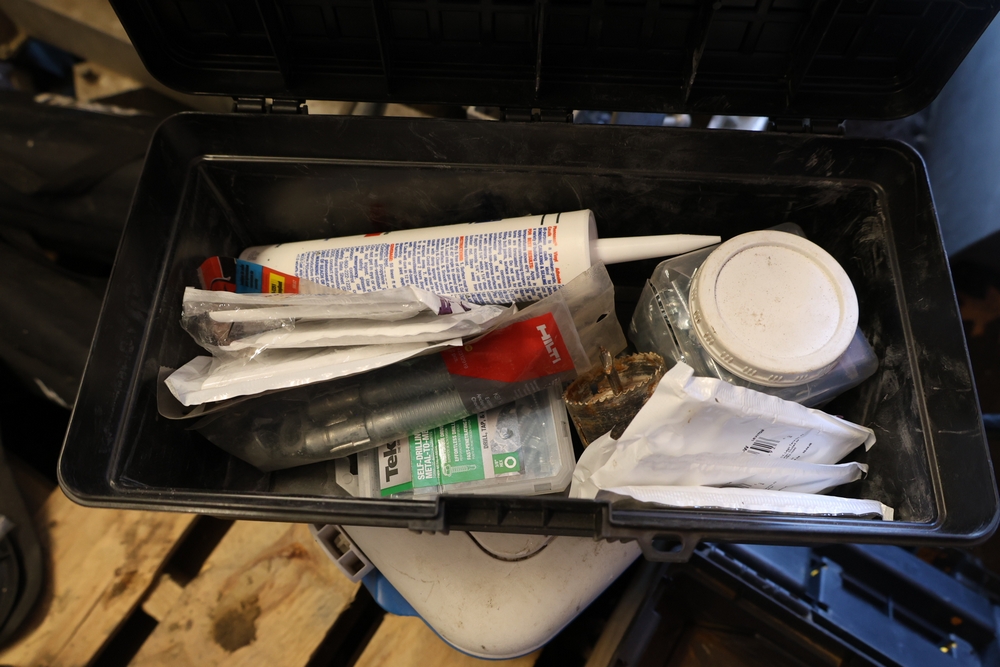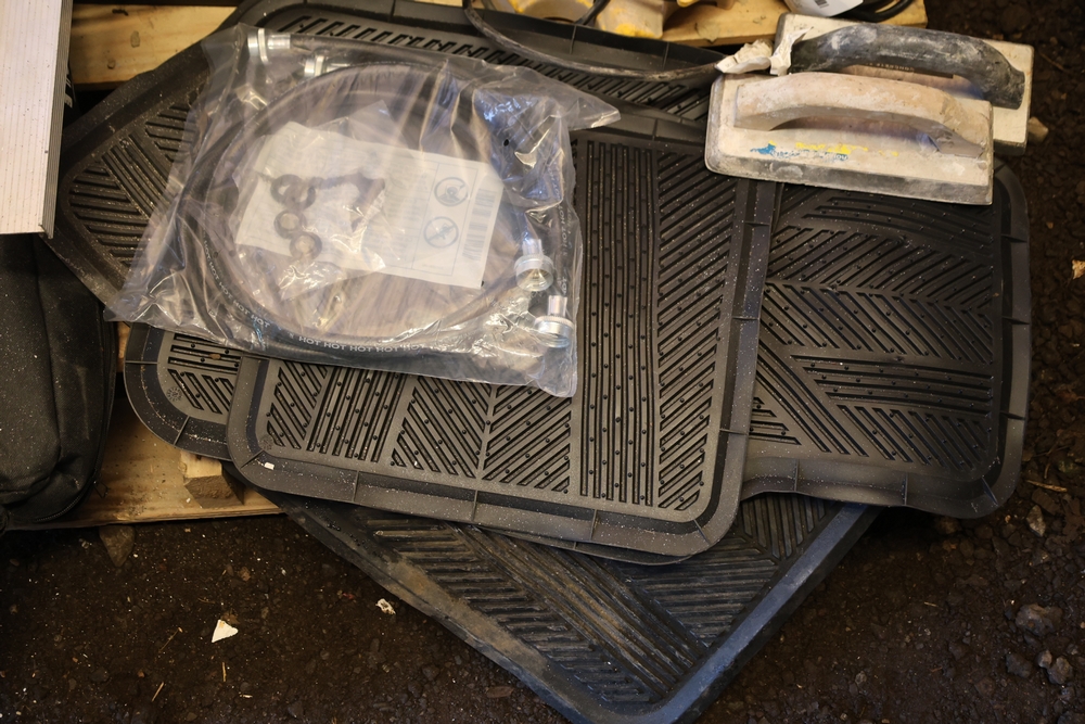 Assorted tools and shop items including Genie components, Wayne WaterBUG submersible pump, Wayne 1/5 HP utility pump, Makita BO5030 sander, Allegro knee/elbow pads, extension cords, toolboxes, levels, cooler, and floor mats.