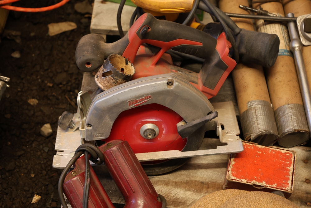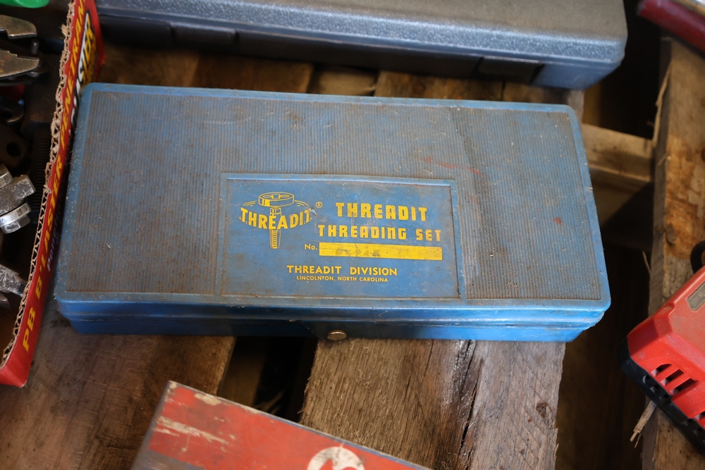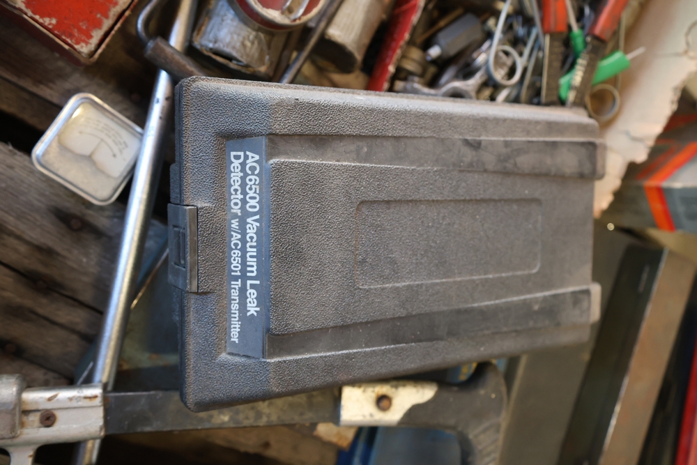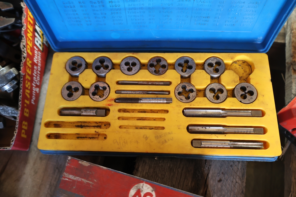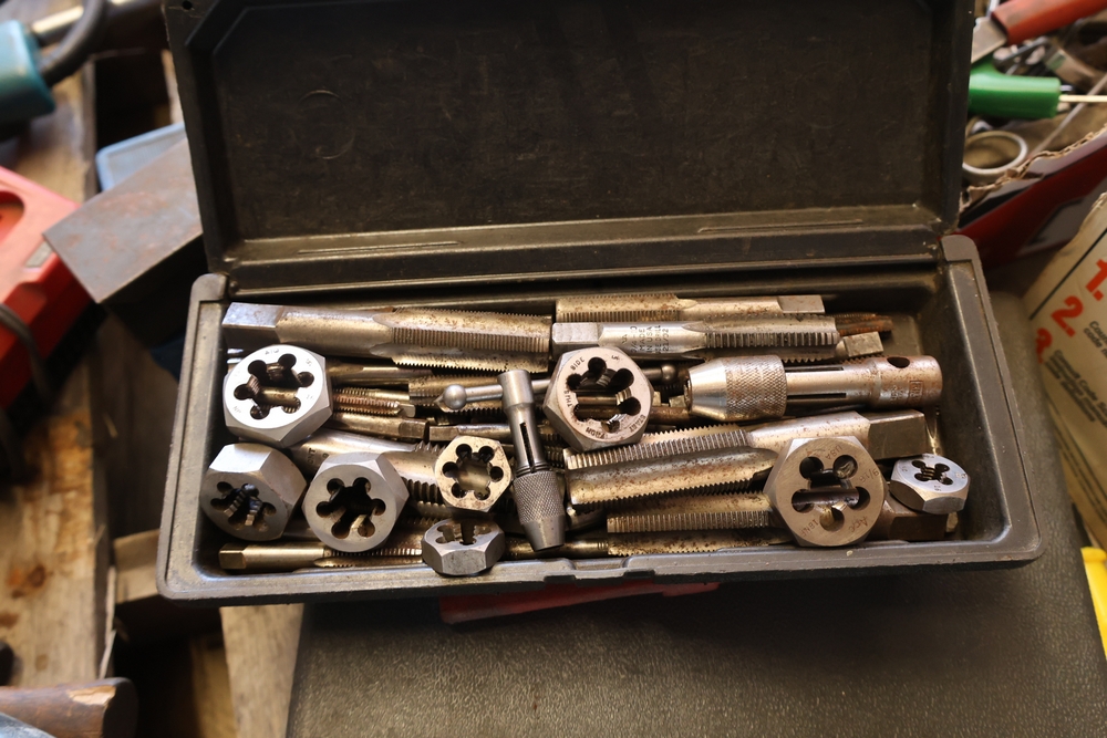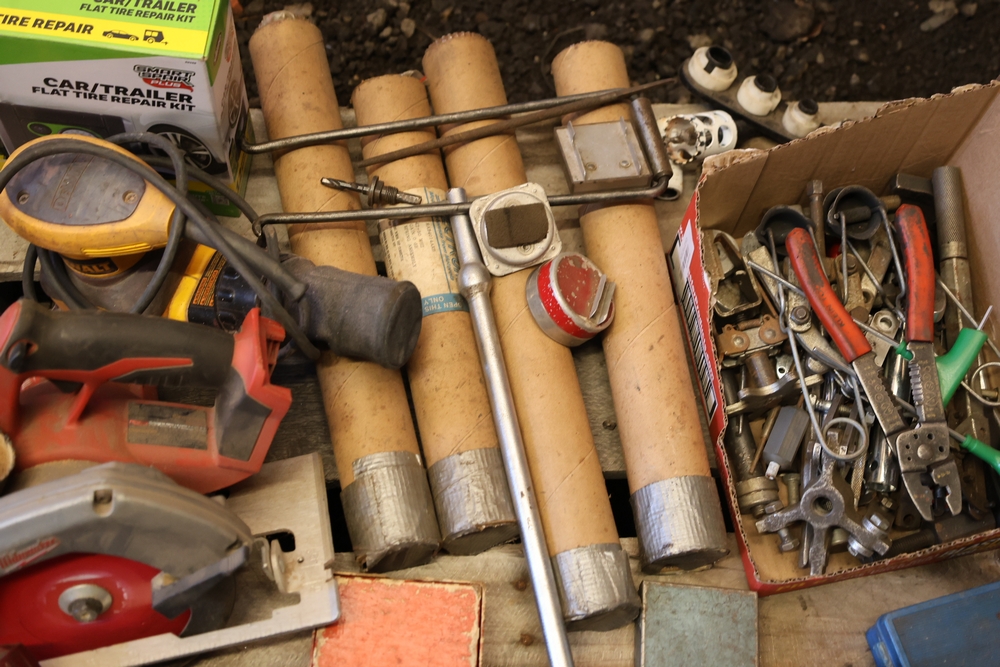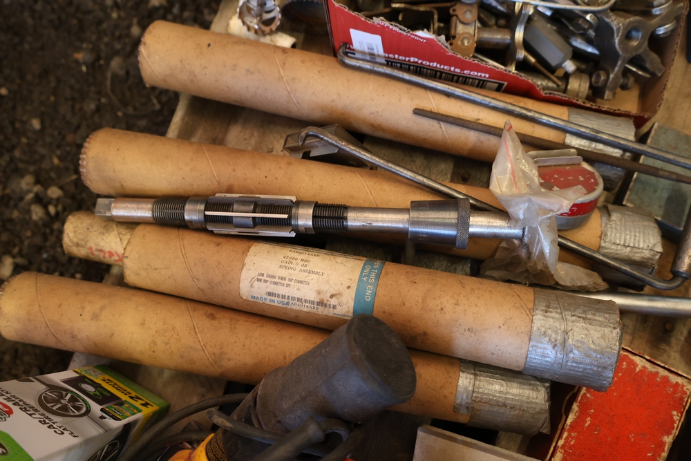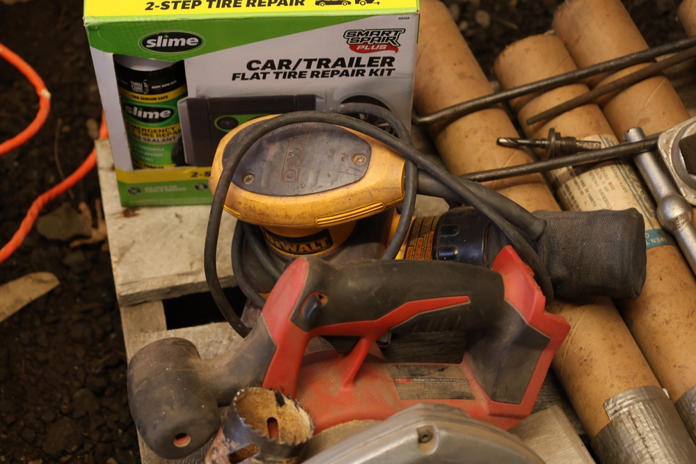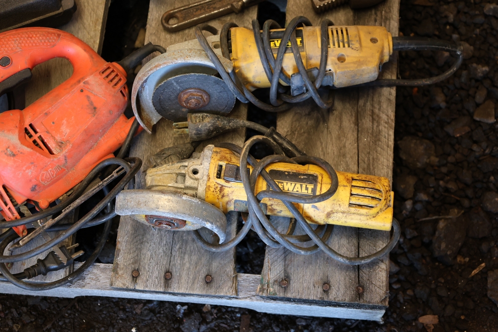 Assorted tools and shop items including DeWalt angle grinders, circular saw, reciprocating saw, drills, pipe threading set, Snap-on double flaring tool kit, micrometer set, AC 6500 tester, Spectrum mobile antenna components, hardware, and compressed gas cylinder.
