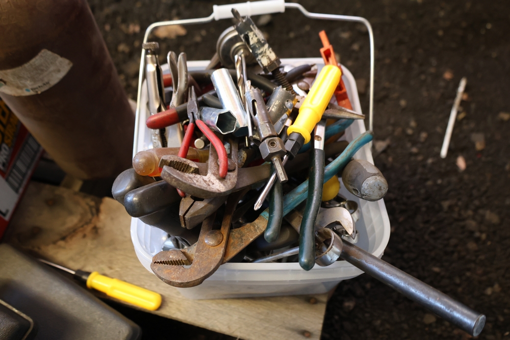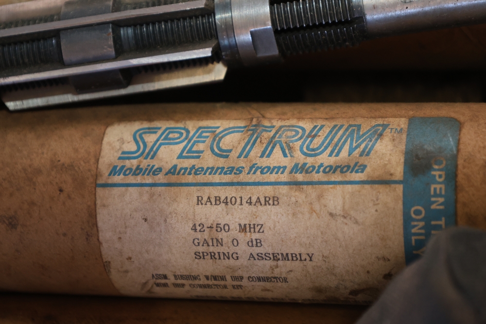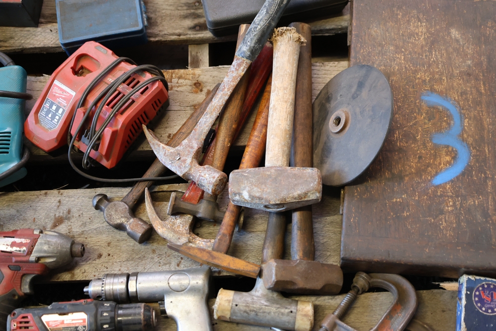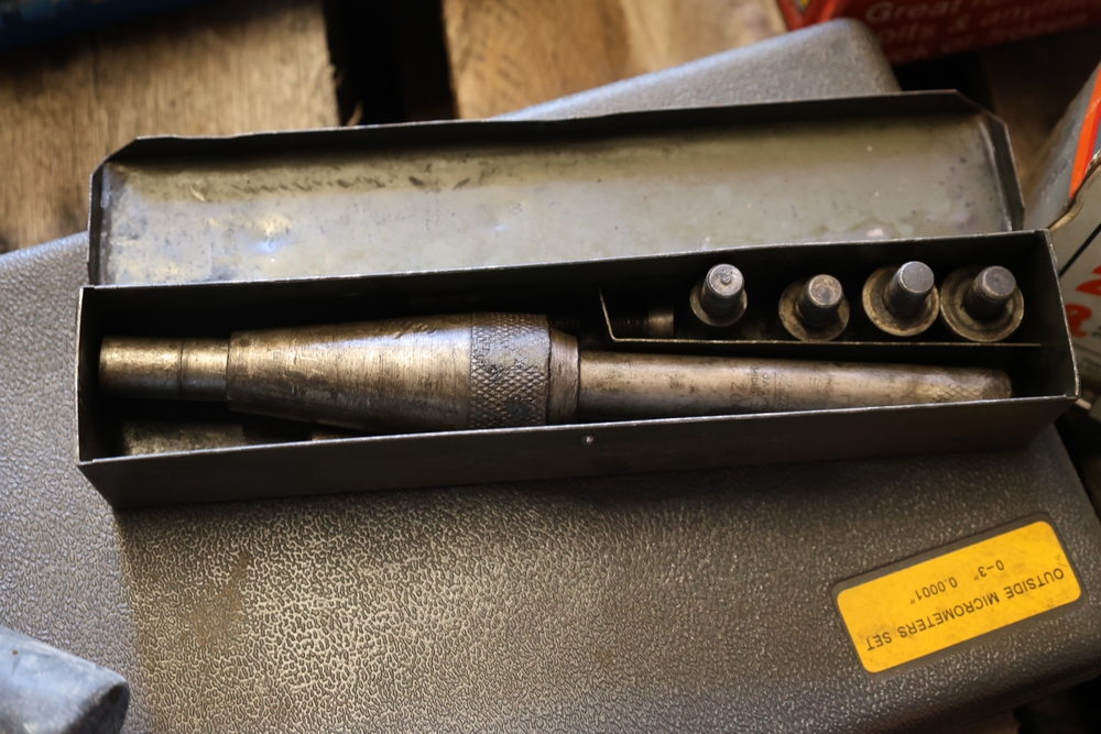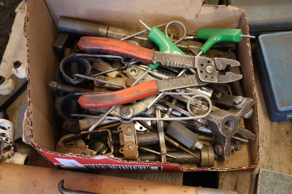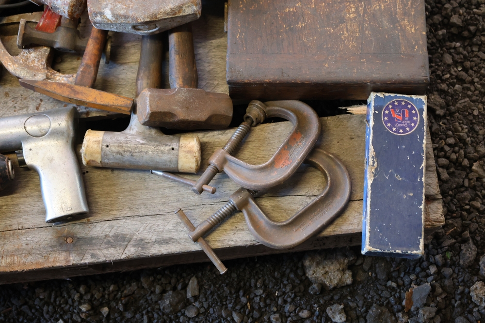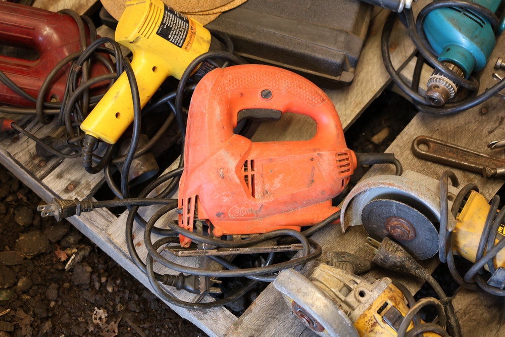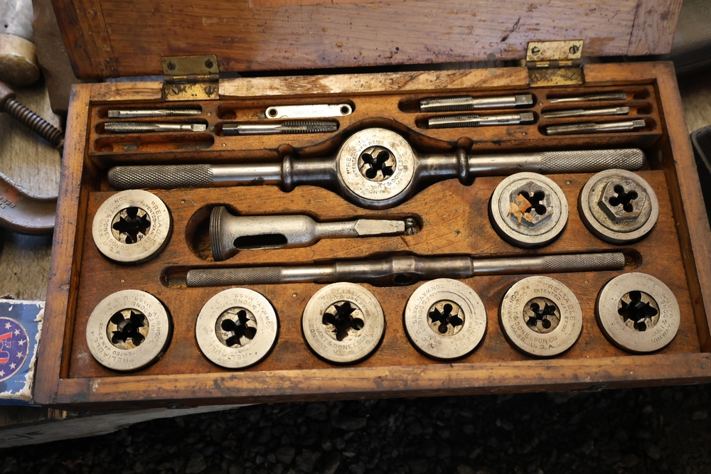 Assorted tools and shop items including DeWalt angle grinders, circular saw, reciprocating saw, drills, pipe threading set, Snap-on double flaring tool kit, micrometer set, AC 6500 tester, Spectrum mobile antenna components, hardware, and compressed gas cylinder.