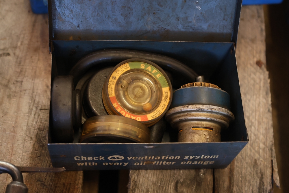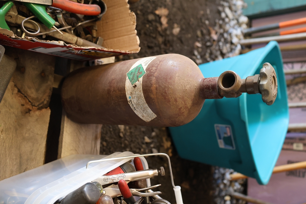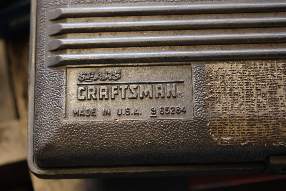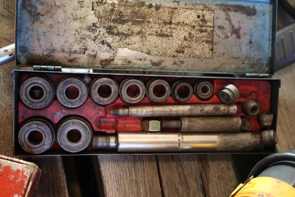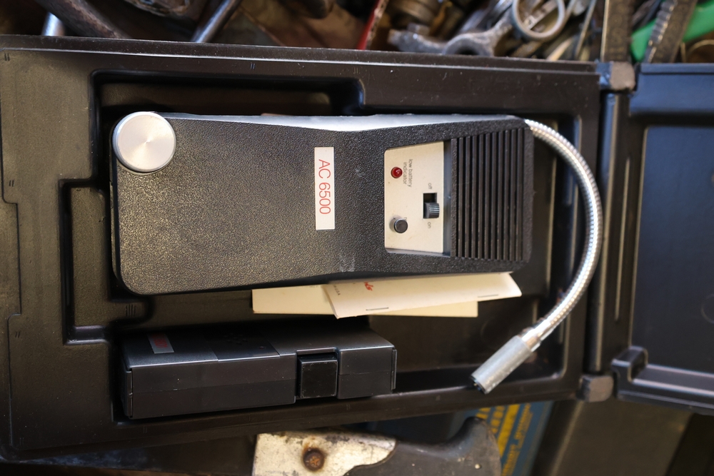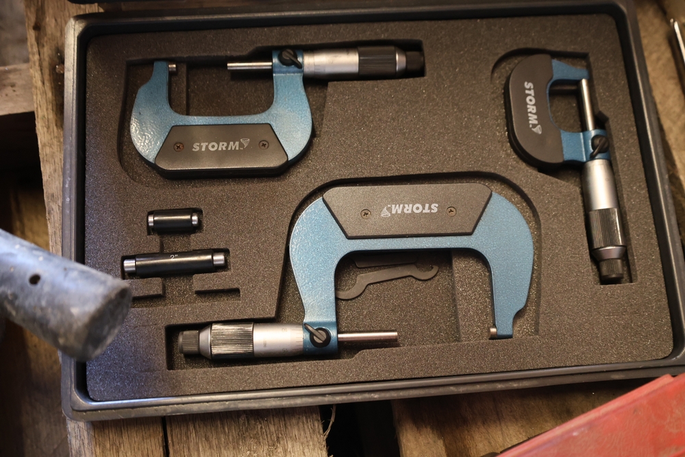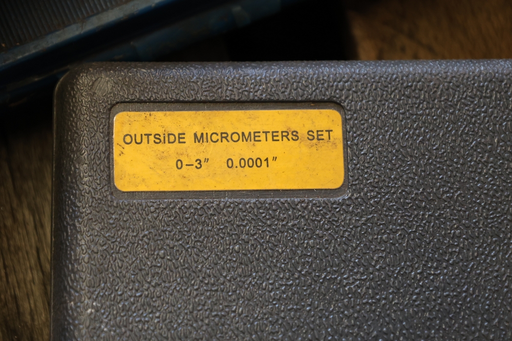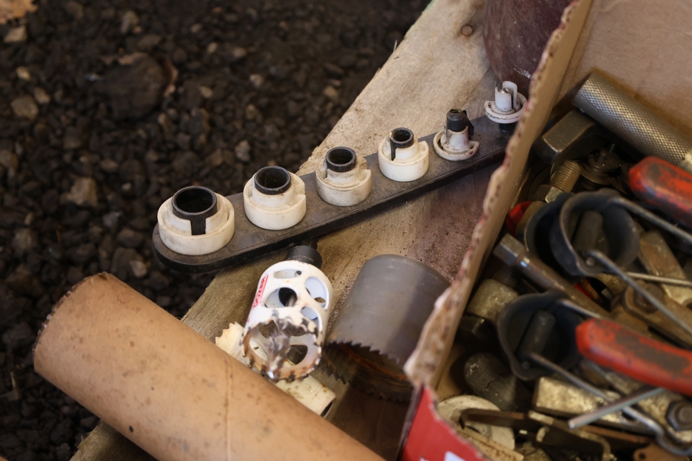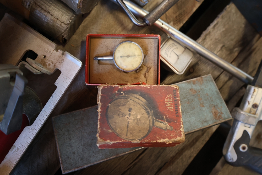 Assorted tools and shop items including DeWalt angle grinders, circular saw, reciprocating saw, drills, pipe threading set, Snap-on double flaring tool kit, micrometer set, AC 6500 tester, Spectrum mobile antenna components, hardware, and compressed gas cylinder.