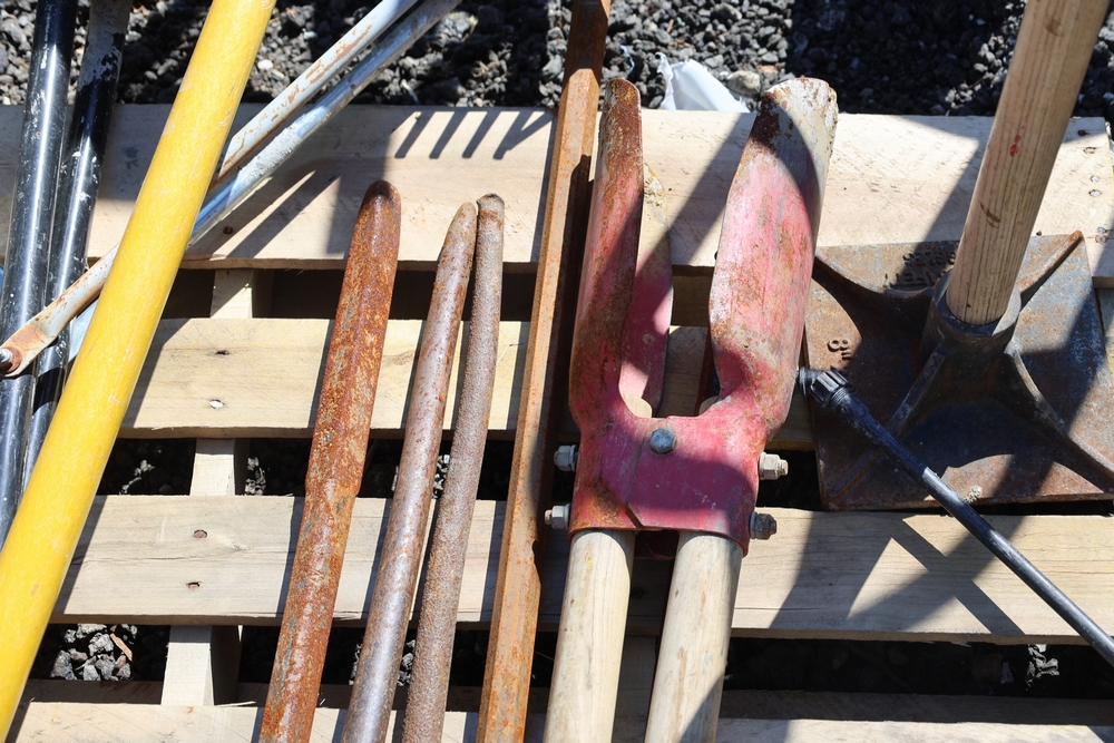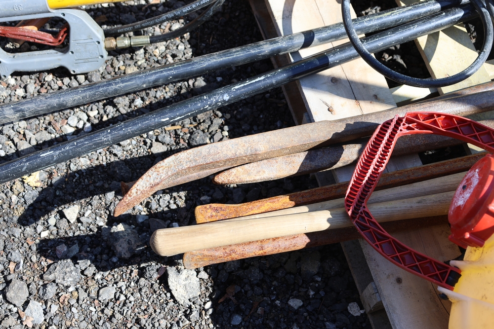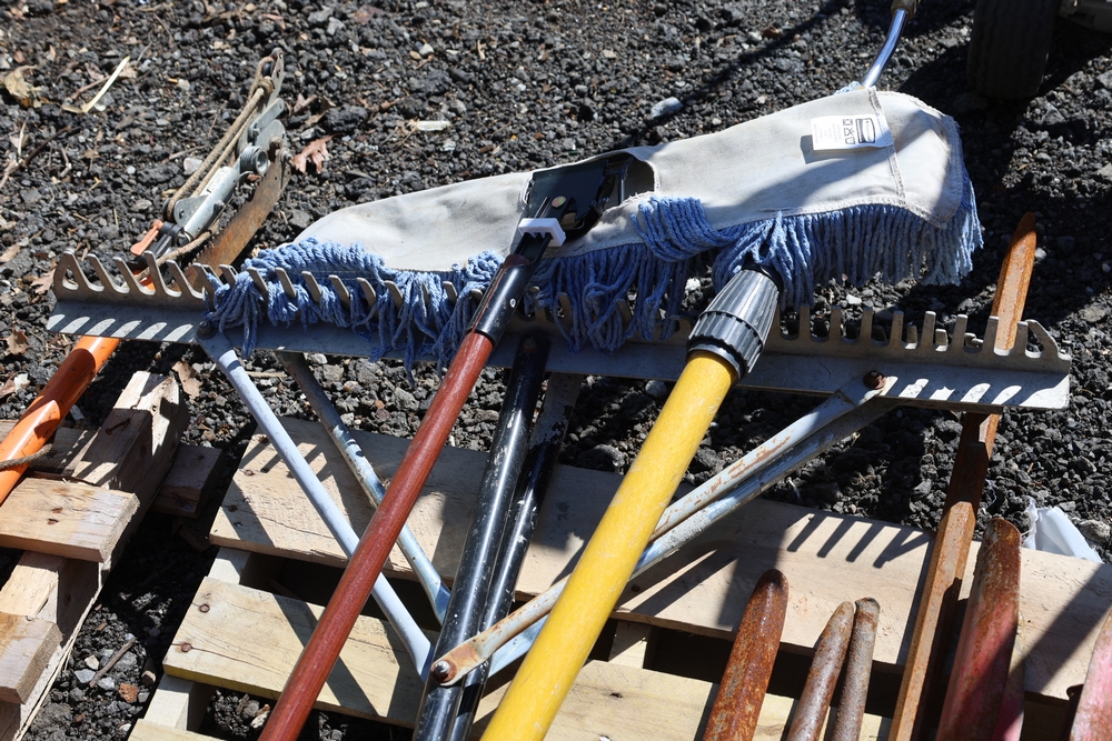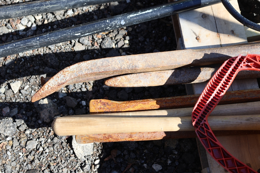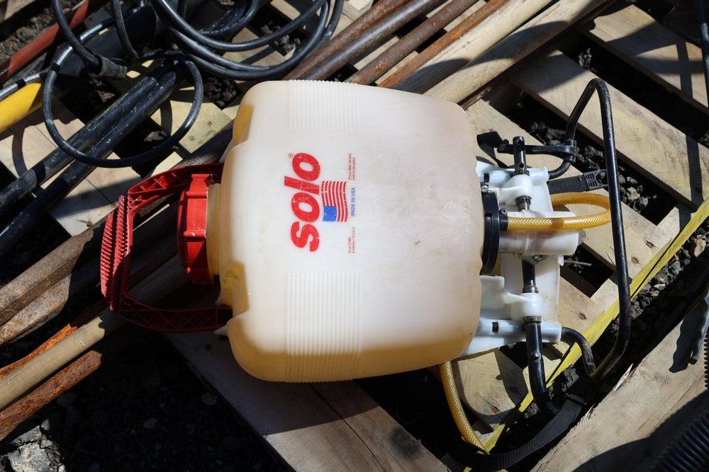 Assorted tools and equipment including Solo backpack sprayer, long-handled tools, hoses, and metal bars.