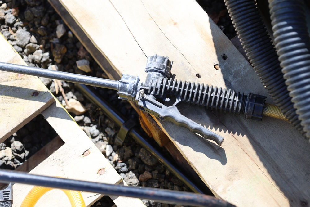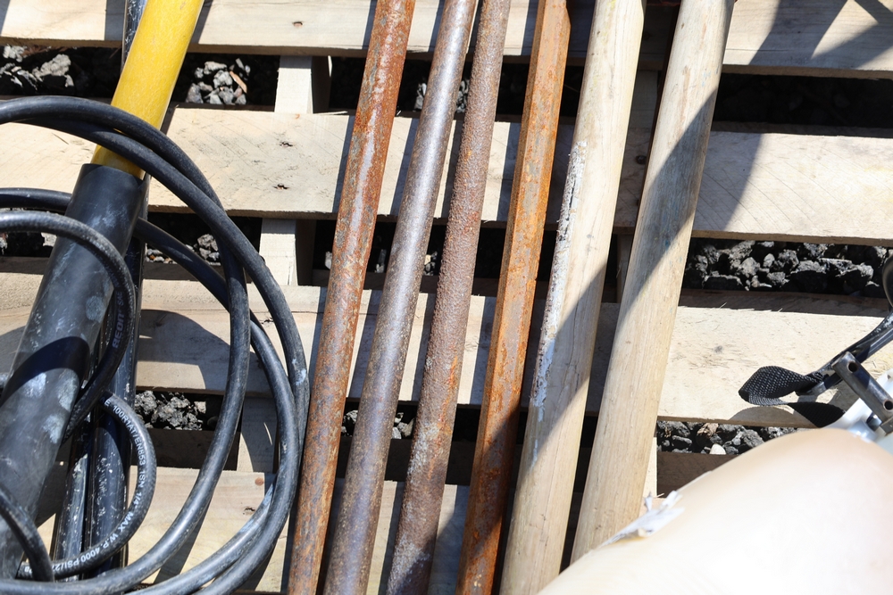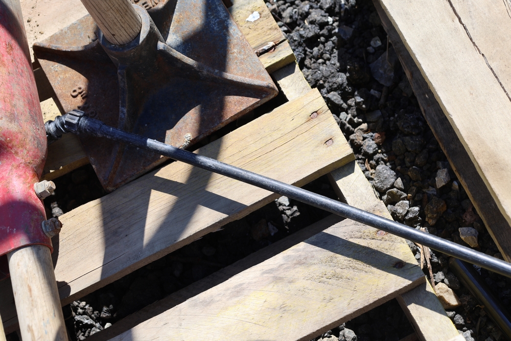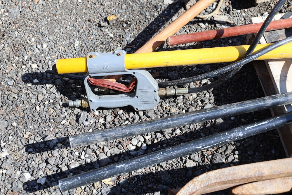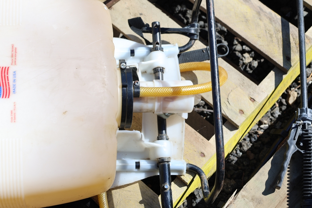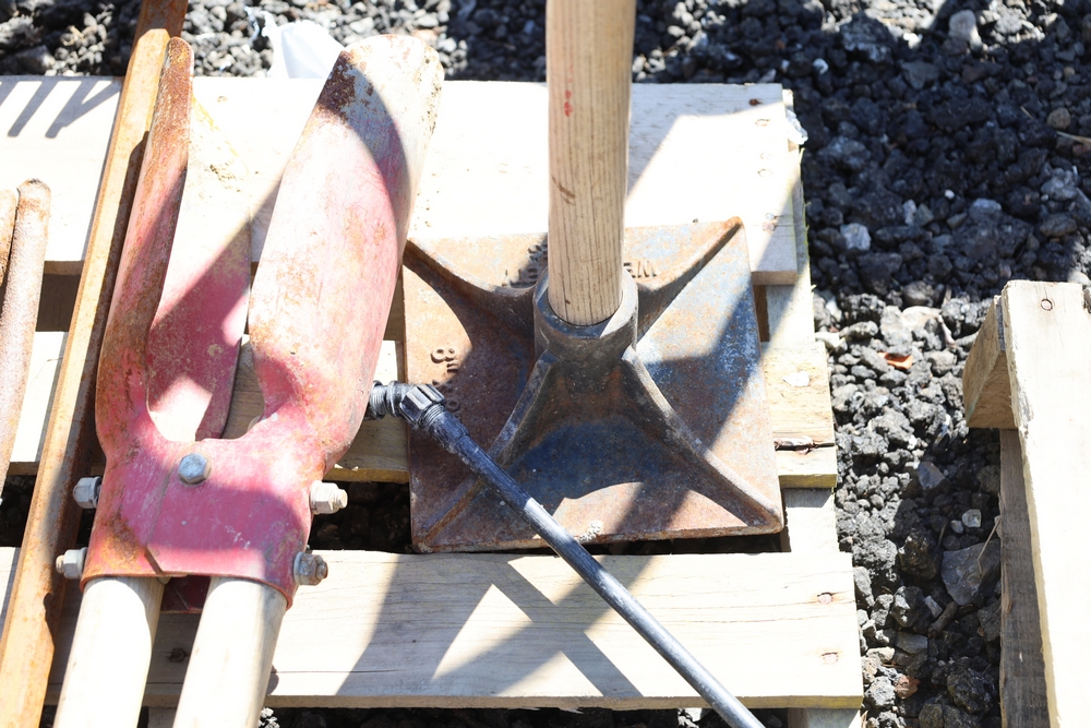 Assorted tools and equipment including Solo backpack sprayer, long-handled tools, hoses, and metal bars.