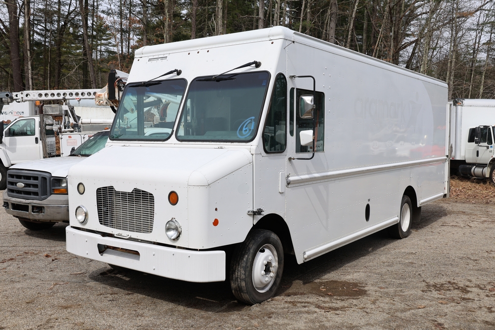 2009 Freightliner MT45 step van with Morgan Olson body. 6.7L diesel engine. Automatic transmission. Odometer reading 275,156 miles. Enclosed cargo area with rear roll-up door, side access door, interior shelving rails, and bulkhead door to cab. Runs and drives. Transfer will be done through NJ dealership paperwork. May not pass NYS Inspection.