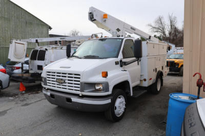 2006 Chevrolet C4C042 bucket truck with a 8.1L V8 OHV 16V engine. VIN: 1GBE4C1G06F424425. Odometer reading: 189880. Body: chassis and cab. Utility body with side compartments, Versalift boom and bucket, rear platform area, dual rear wheels, control panel at rear, interior controls, and dash-mounted control unit. Runs and drives. Transfer will be done through NJ dealership paperwork. May not pass NYS Inspection.
