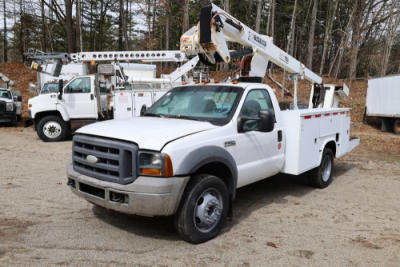 2005 Ford F-450 Super Duty Regular Cab 2WD DRW chassis cab with a 6.0L V8 OHV 32V turbo diesel engine. VIN: 1FDXF46P85ED06412. Odometer reading: 211051. Body: utility truck with Versalift SkyTel boom. Equipped with service body, rear platform, and onboard power outlets. Runs and drives. Transfer will be done through NJ dealership paperwork. May not pass NYS Inspection.