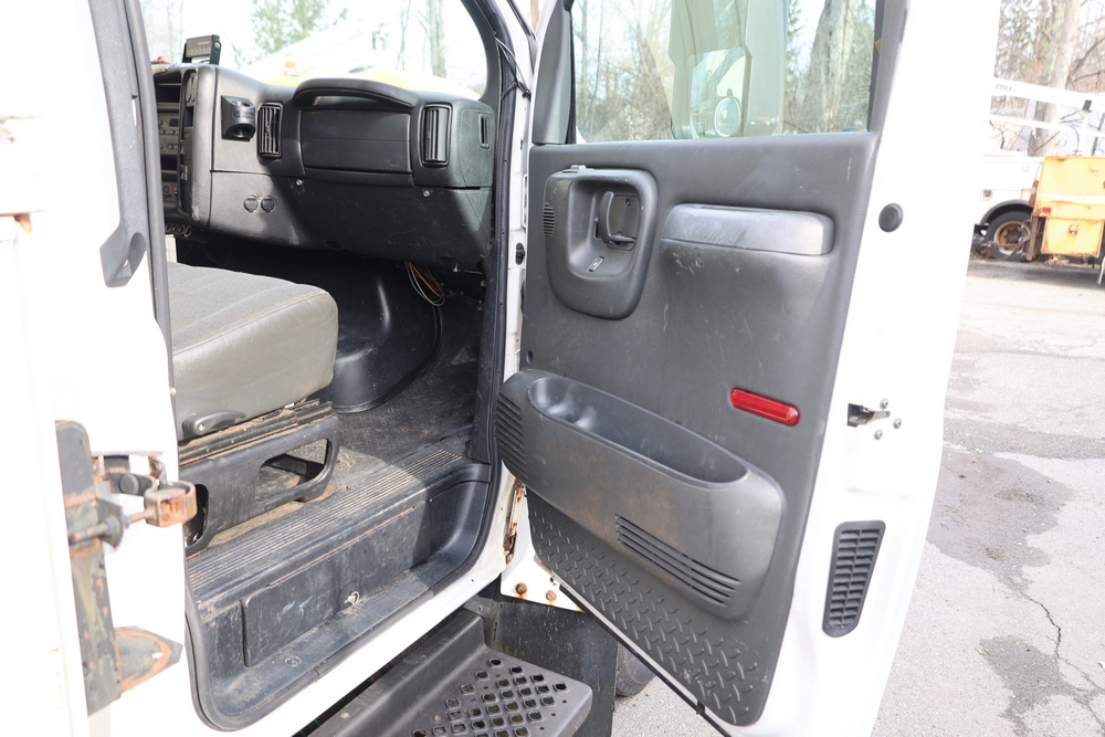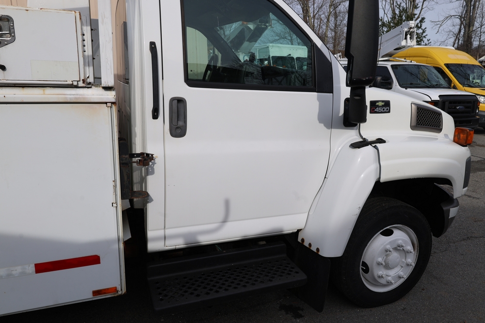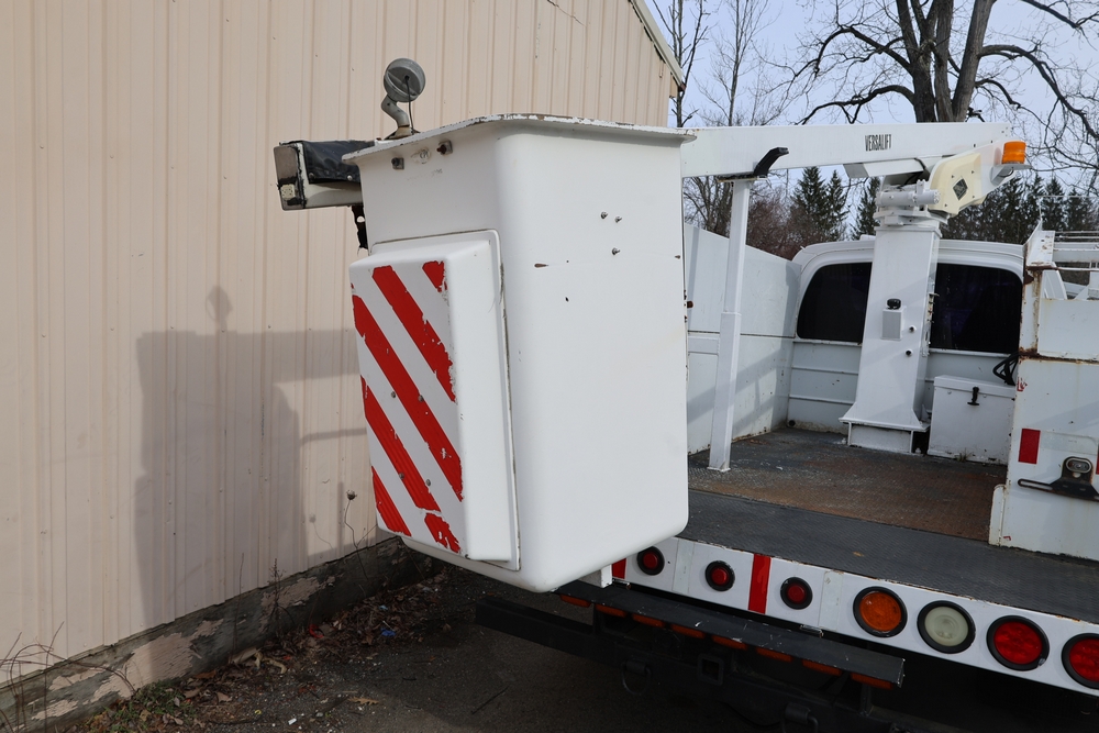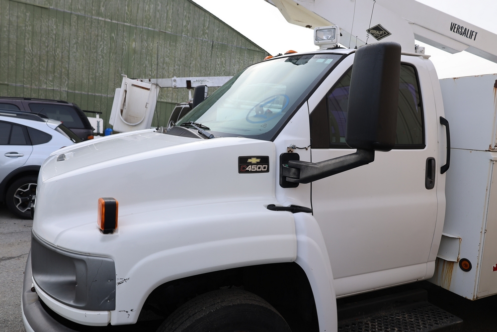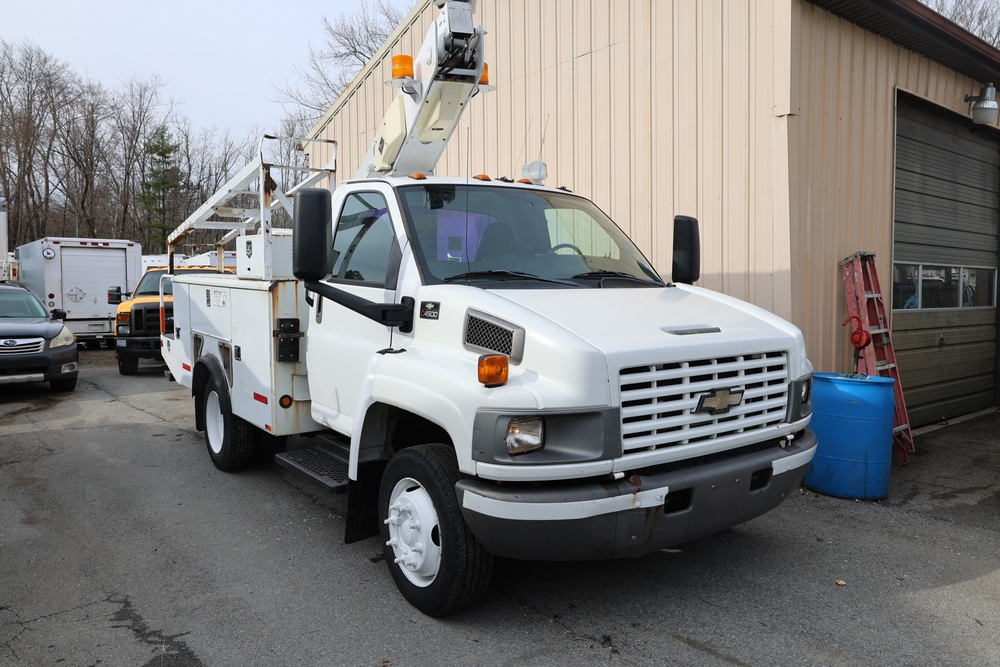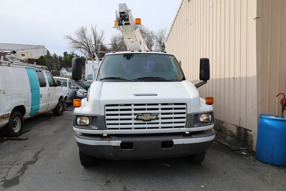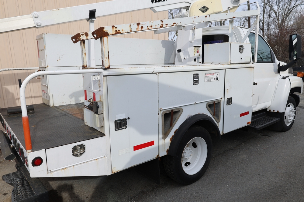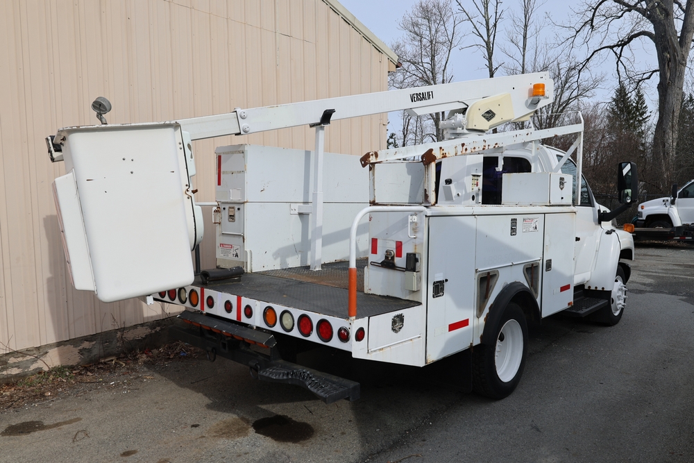 2006 Chevrolet C4C042 bucket truck with a 8.1L V8 OHV 16V engine. VIN: 1GBE4C1G06F424425. Odometer reading: 189880. Body: chassis and cab. Utility body with side compartments, Versalift boom and bucket, rear platform area, dual rear wheels, control panel at rear, interior controls, and dash-mounted control unit. Runs and drives. Transfer will be done through NJ dealership paperwork. May not pass NYS Inspection.