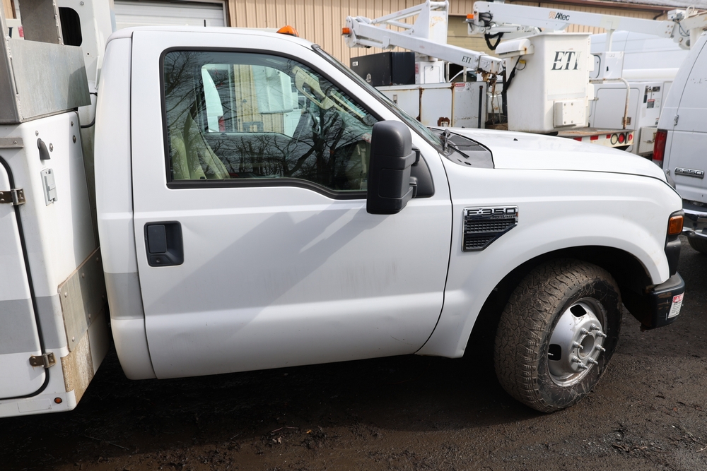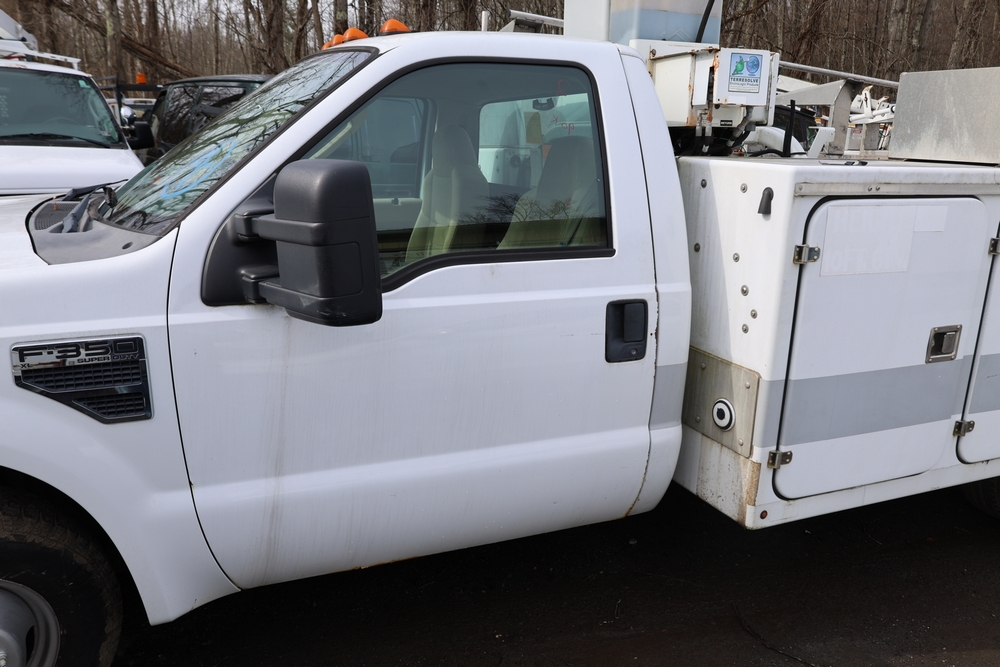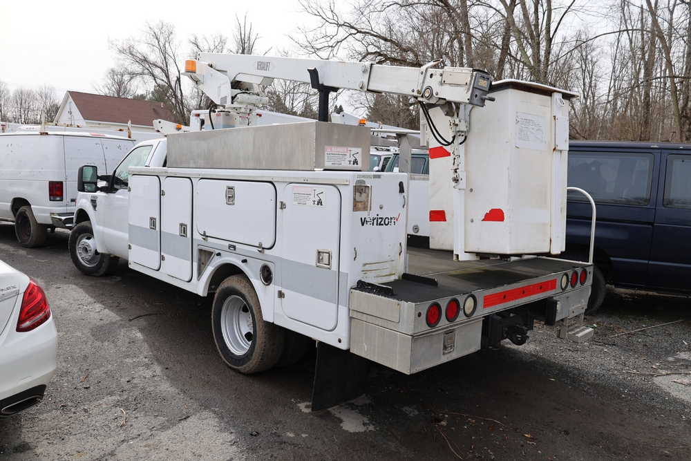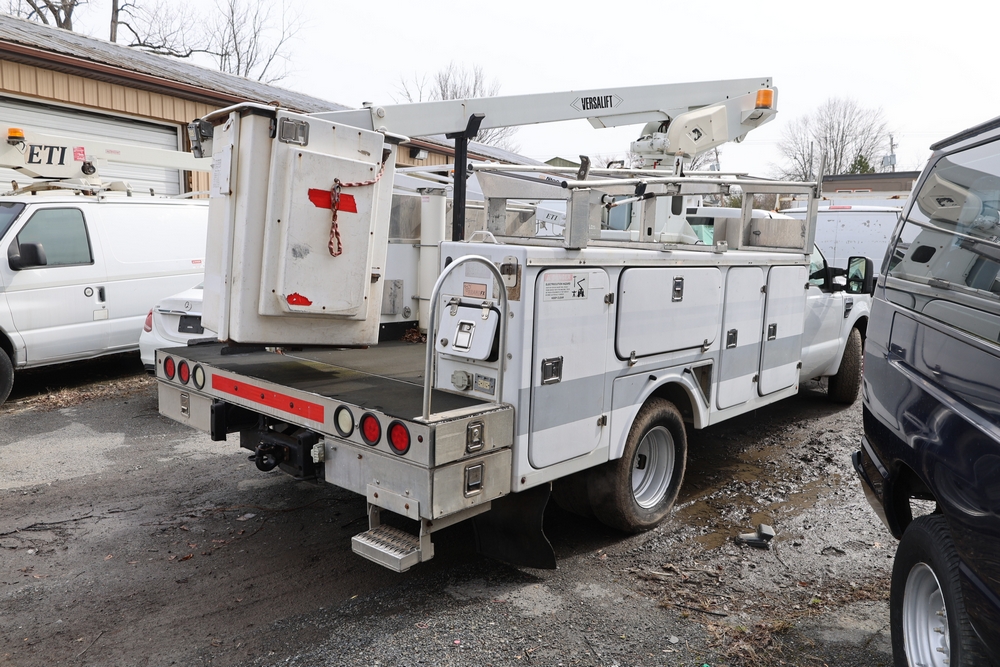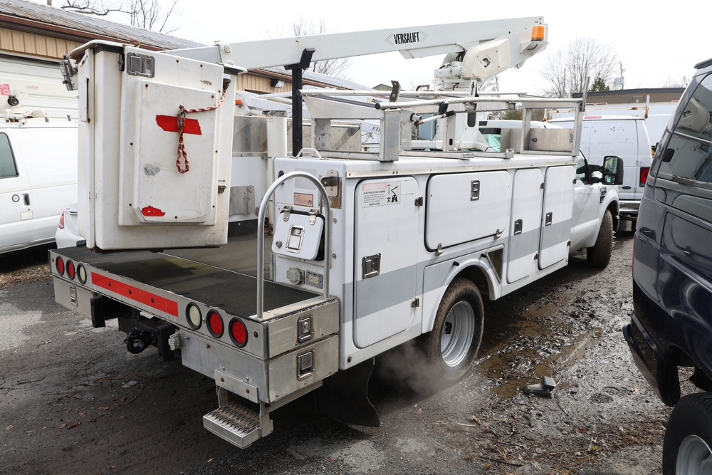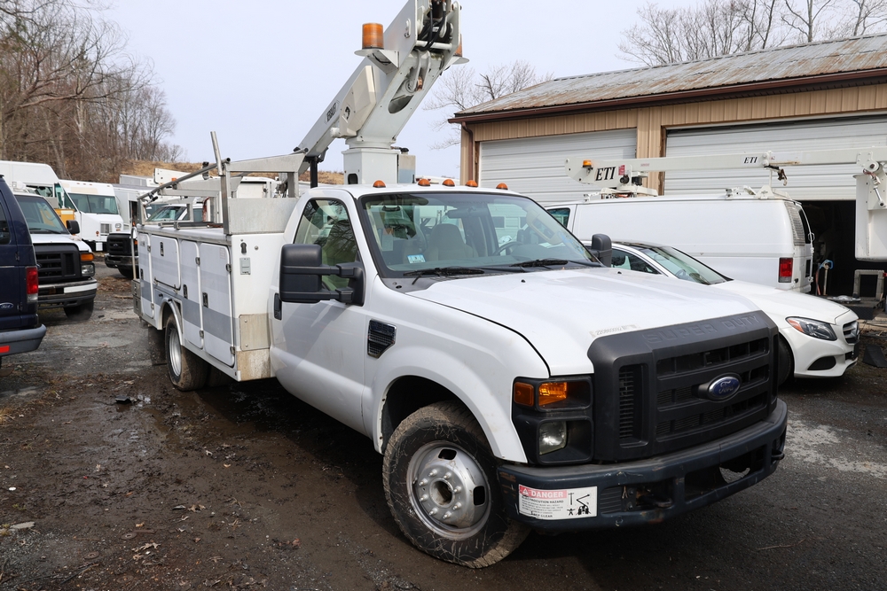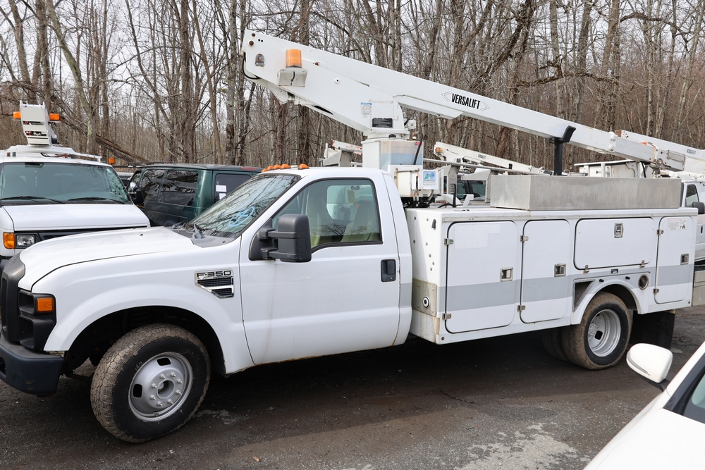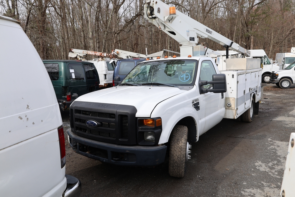 2008 Ford F-350 Super Duty XL DRW 2WD with a 5.4L V8 SOHC 24V engine. VIN: 1FDWF36578EB43826. Odometer reading: 90267.5. Body: chassis and cab. Utility body with side compartments, Versalift boom and bucket, dual rear wheels, rear control panel with Hobbs meter, interior center console, dash-mounted radio, climate control knobs, auxiliary switches Runs and drives. Transfer will be done through NJ dealership paperwork. May not pass NYS Inspection.