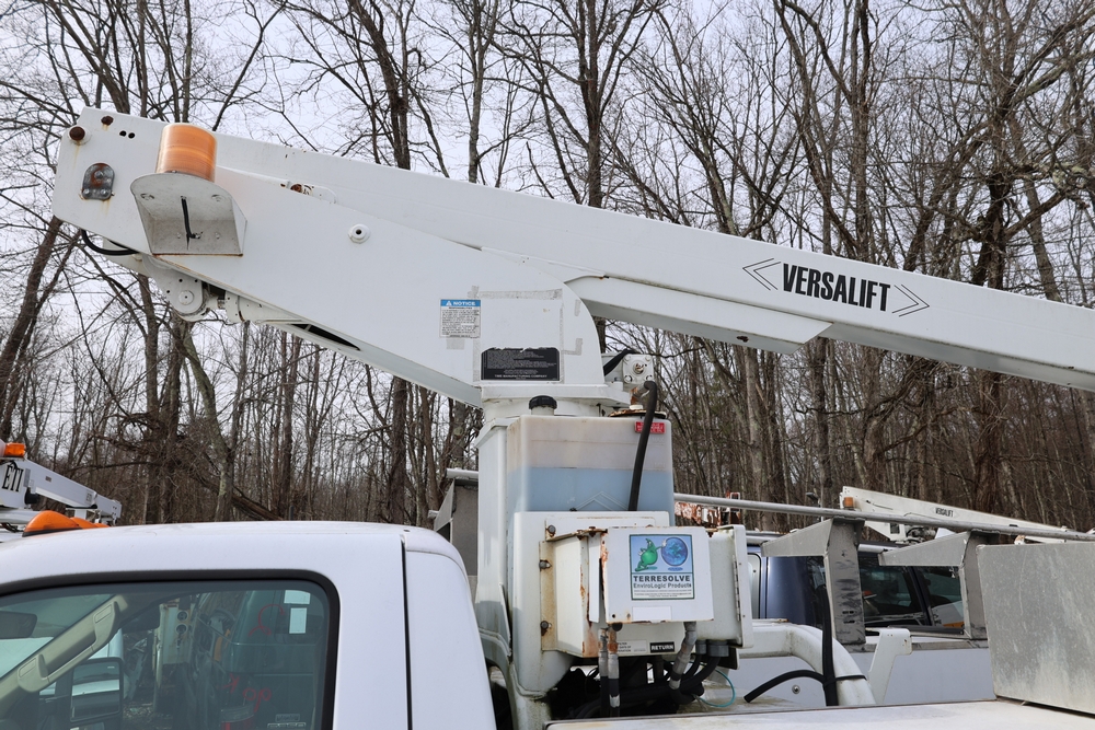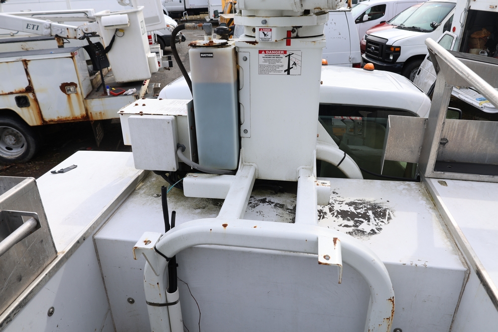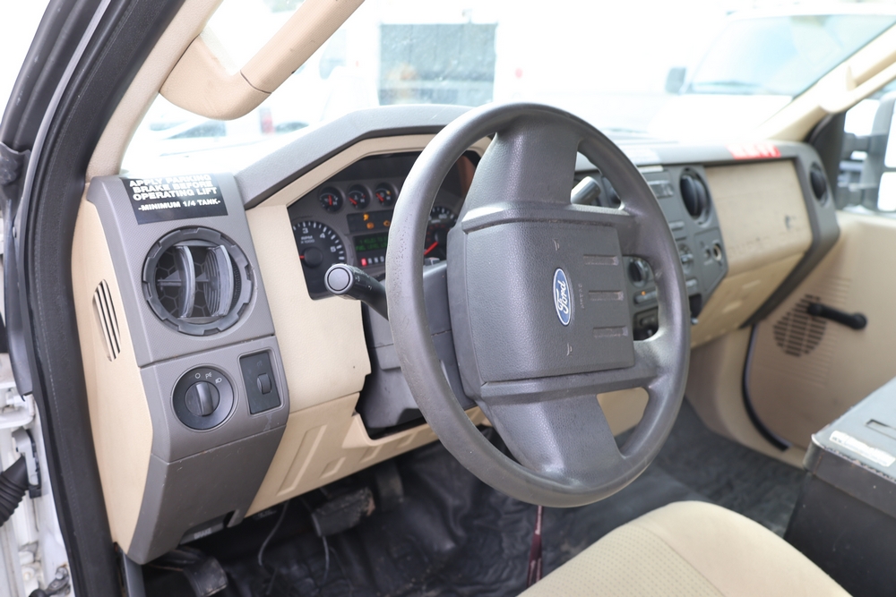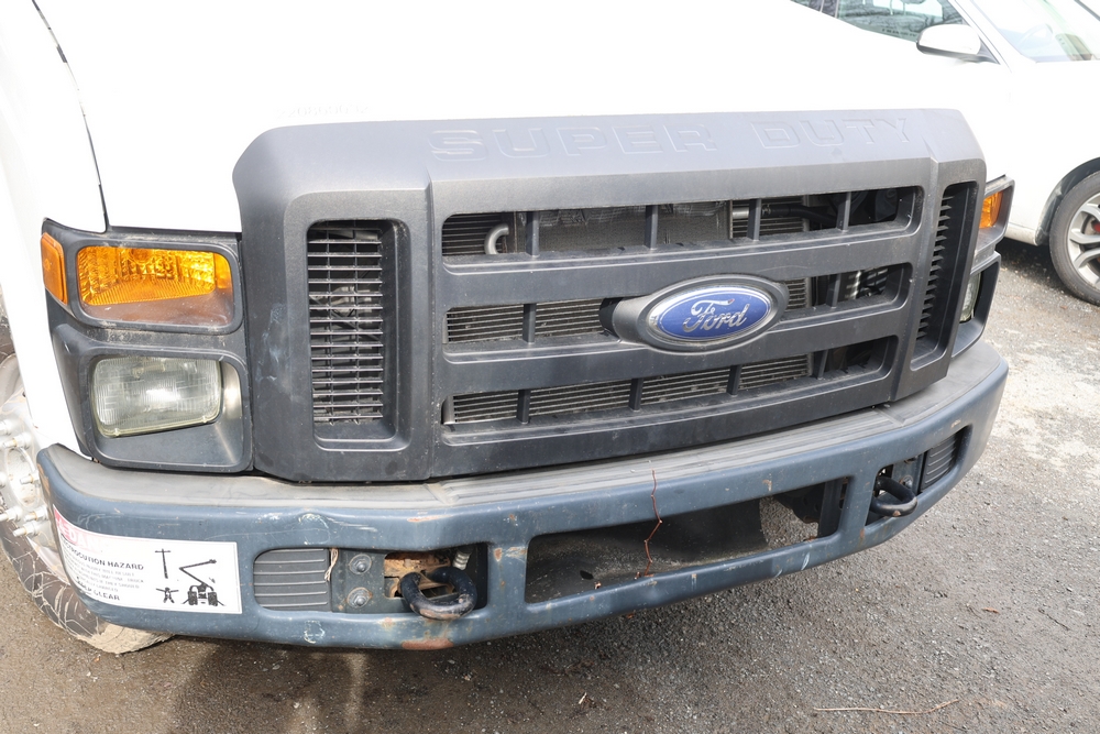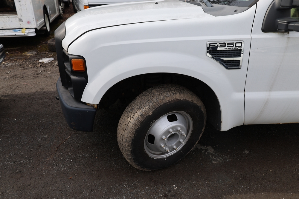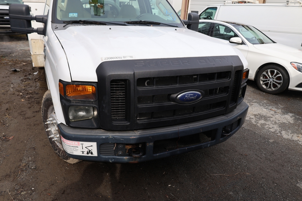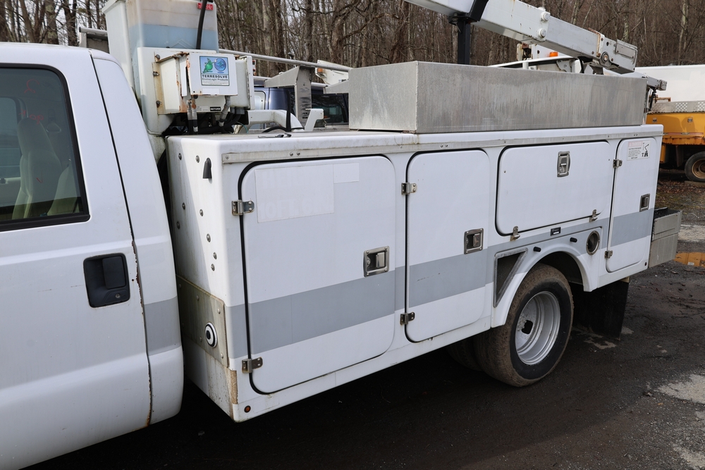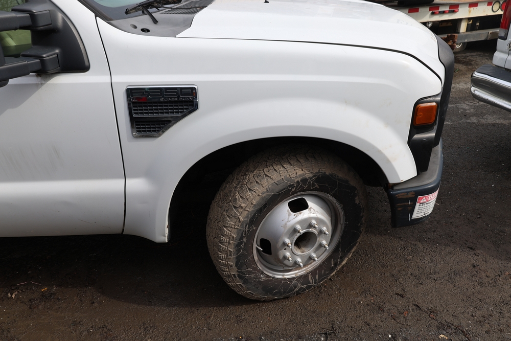 2008 Ford F-350 Super Duty XL DRW 2WD with a 5.4L V8 SOHC 24V engine. VIN: 1FDWF36578EB43826. Odometer reading: 90267.5. Body: chassis and cab. Utility body with side compartments, Versalift boom and bucket, dual rear wheels, rear control panel with Hobbs meter, interior center console, dash-mounted radio, climate control knobs, auxiliary switches Runs and drives. Transfer will be done through NJ dealership paperwork. May not pass NYS Inspection.