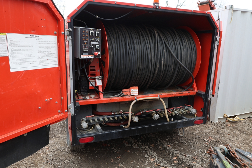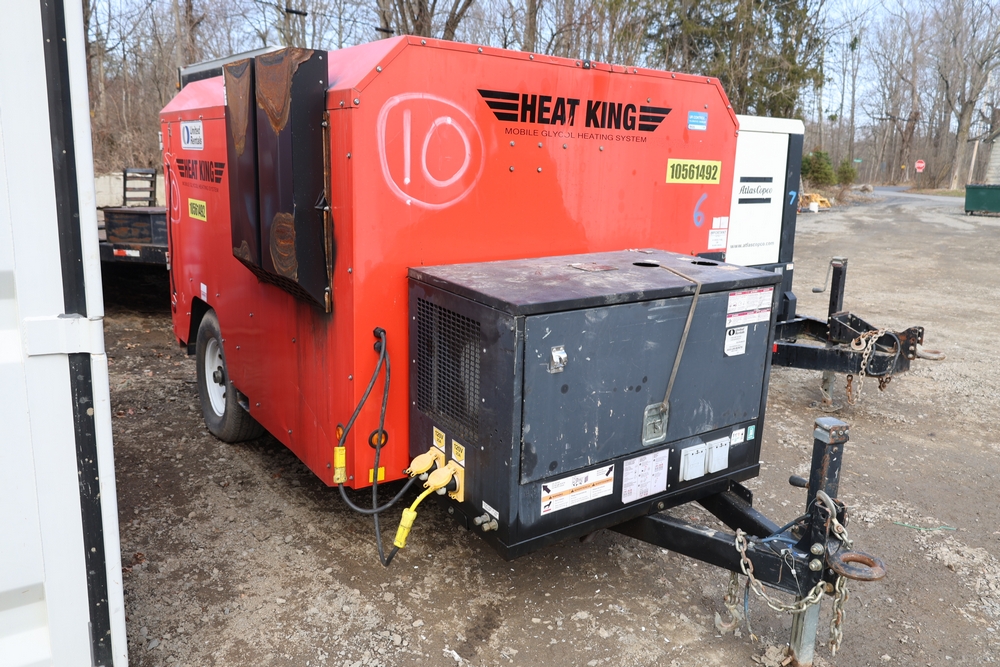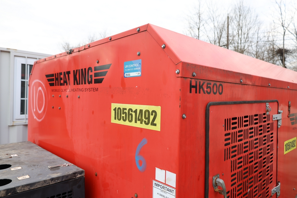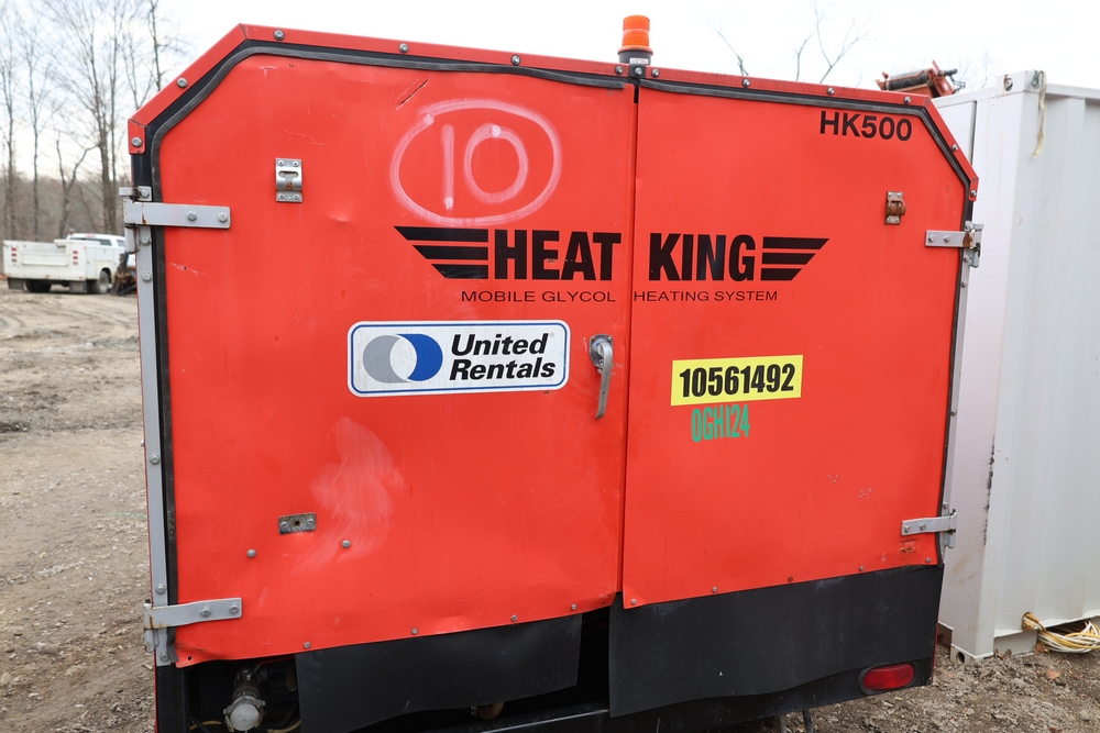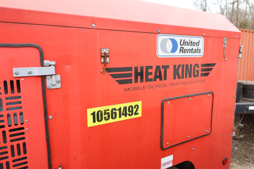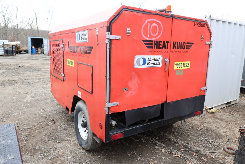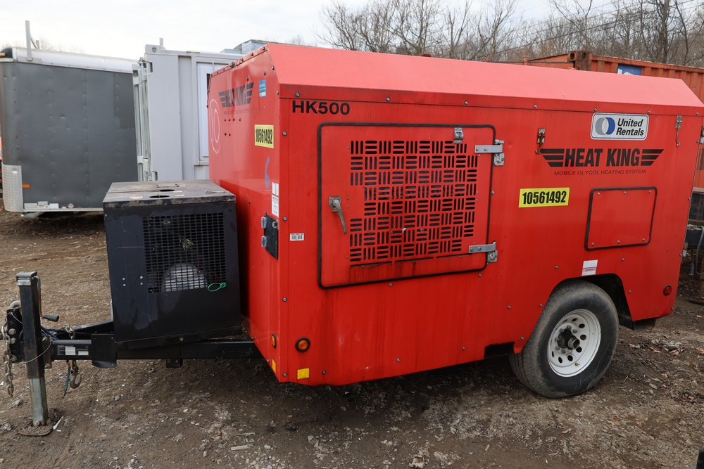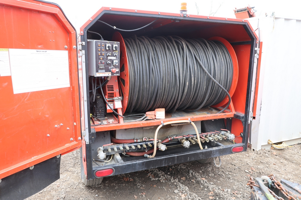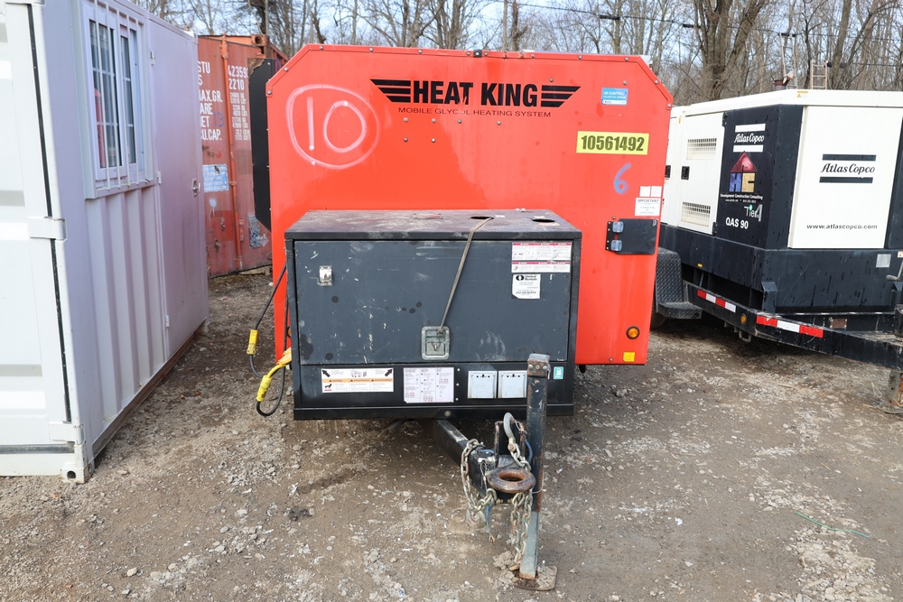 Heat King mobile glycol heating system, model HK500-1, serial number 16295, manufactured December 2016, trailer mounted, single axle, equipped with hose reel, Kubota diesel engine model D1105-BG-EF01, hour meter reading 907.2 hours. With 3000 feet of 1/4" hose, dual burners, eight zones, and 250 gallon fuel capacity. Will run on generator or outlet. Seller reports: Operational.