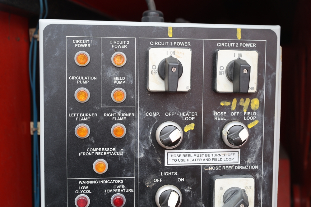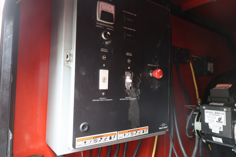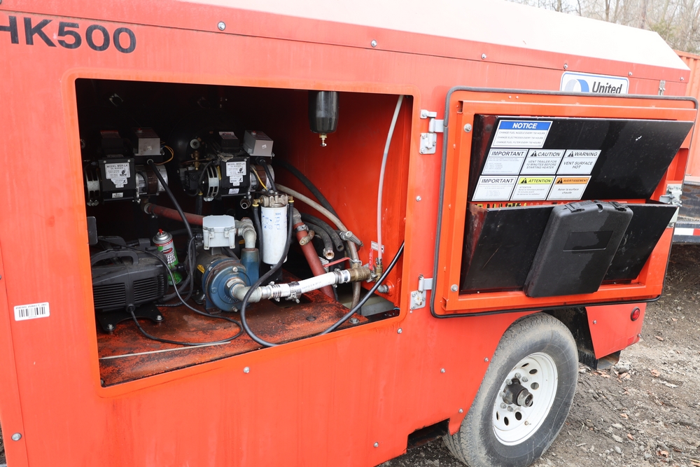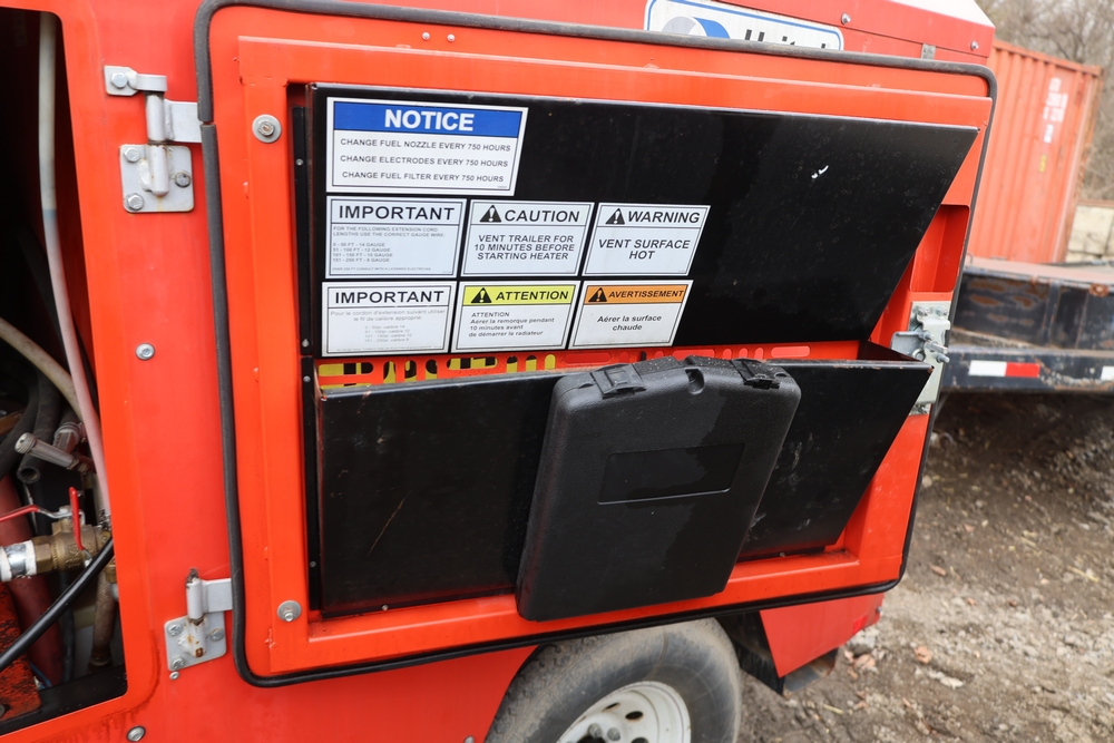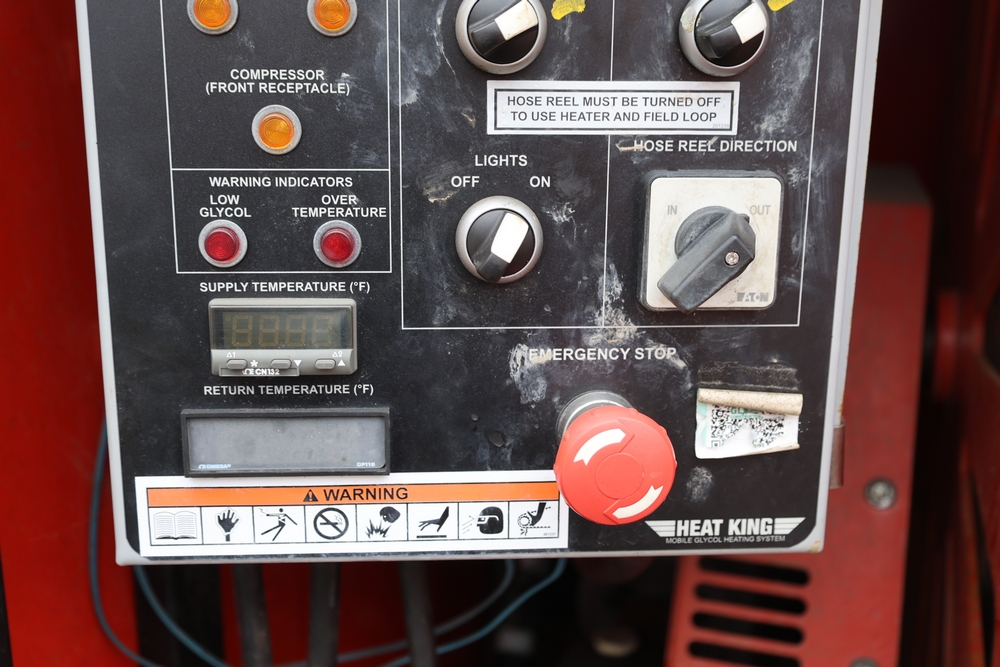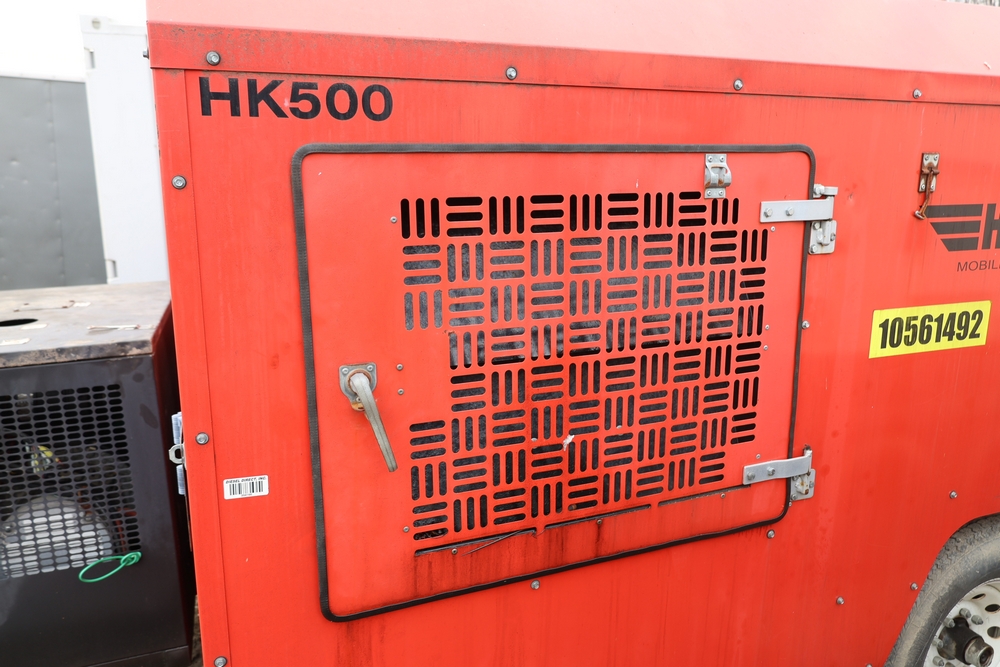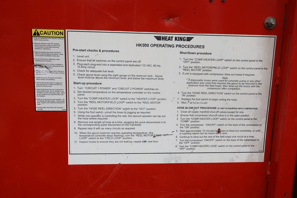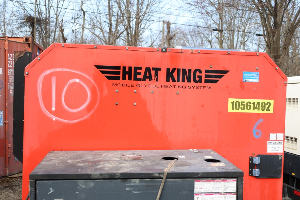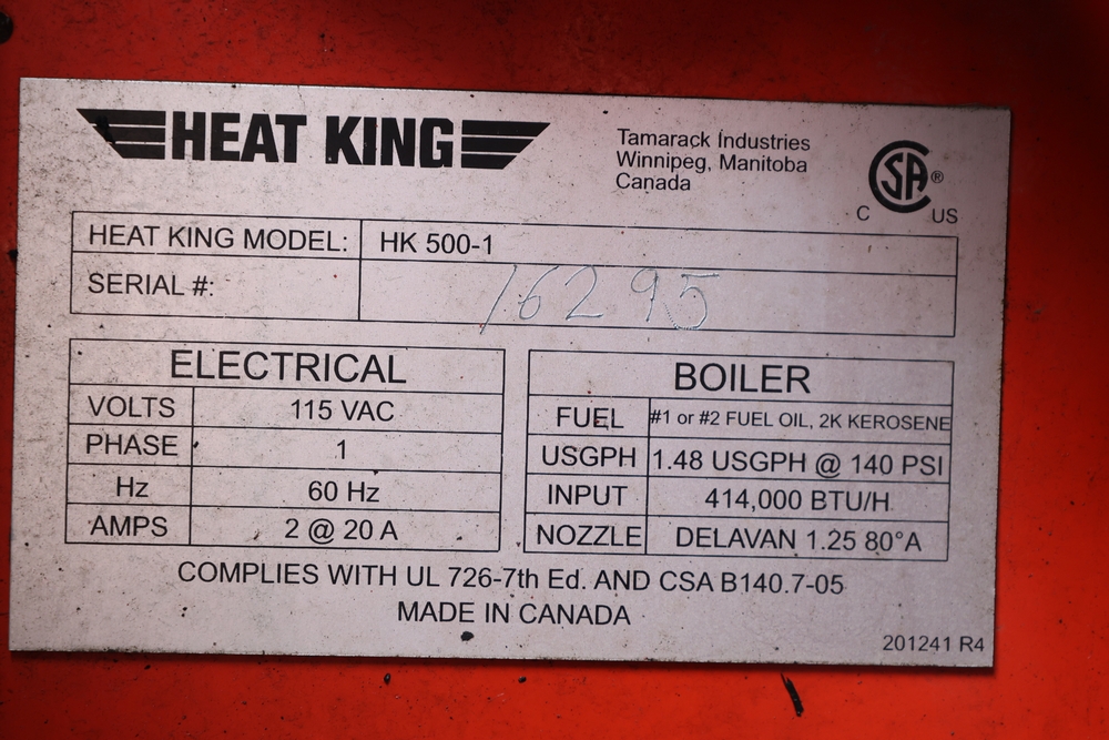 Heat King mobile glycol heating system, model HK500-1, serial number 16295, manufactured December 2016, trailer mounted, single axle, equipped with hose reel, Kubota diesel engine model D1105-BG-EF01, hour meter reading 907.2 hours. With 3000 feet of 1/4" hose, dual burners, eight zones, and 250 gallon fuel capacity. Will run on generator or outlet. Seller reports: Operational.
