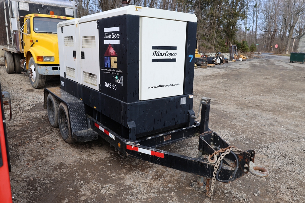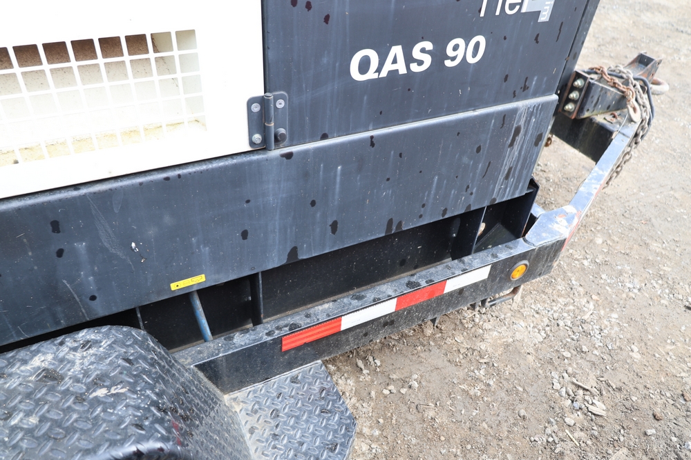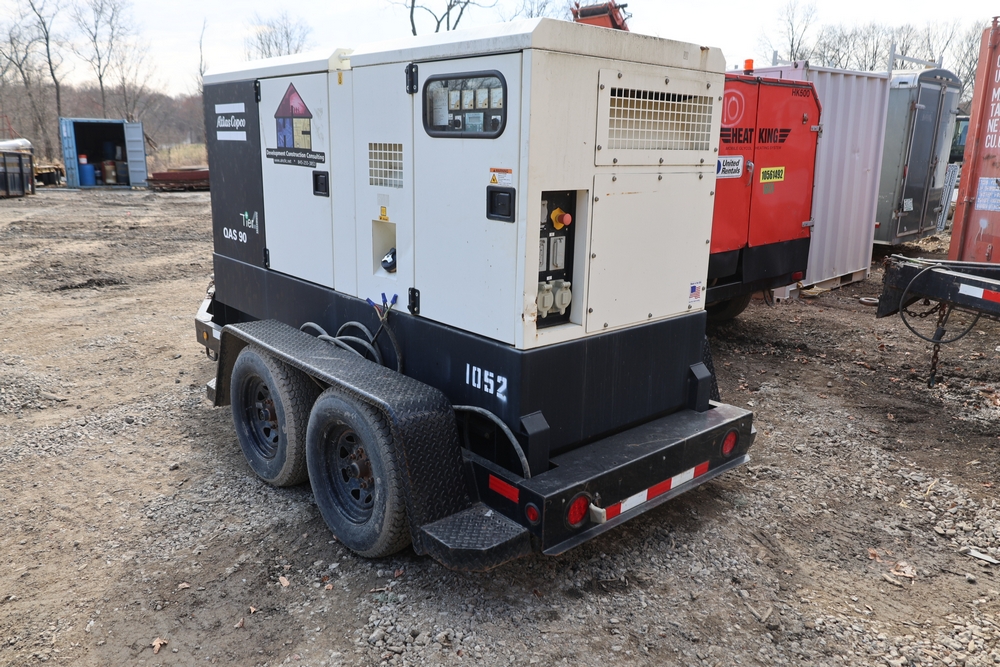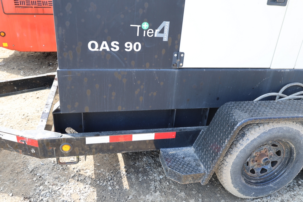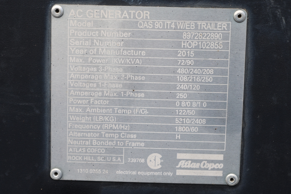 Atlas Copco 60Kw AC generator, model QAS 90 IT4 WEB trailer, product number 8972822890, serial number HOP102855, year 2015, 72 kW / 90 kVA, trailer mounted, tandem axle, hour meter reading 6044.0 hours. 110/220 or 3 phase, 400 Amp breakers, John Deere engine, and 250 gallon fuel capacity. Seller reports: Operational.