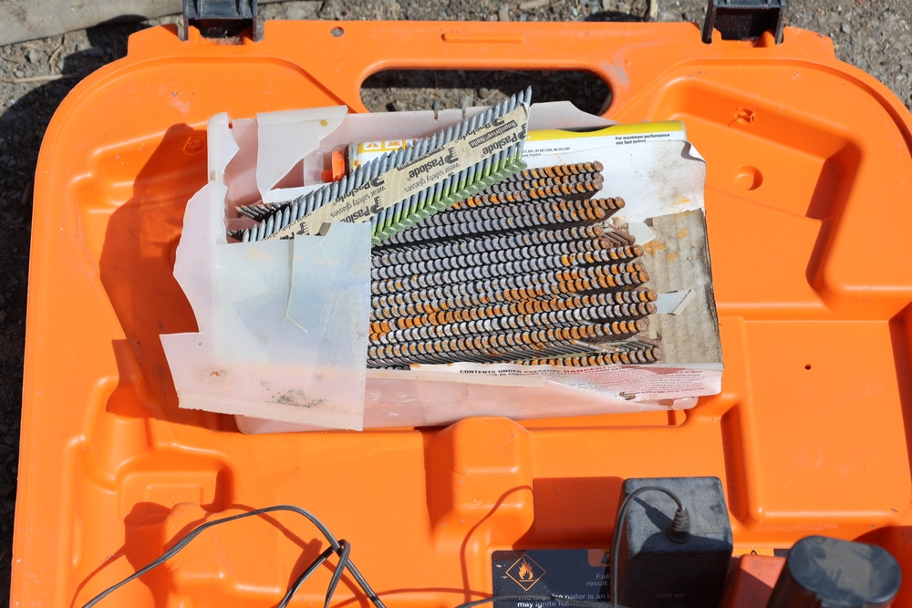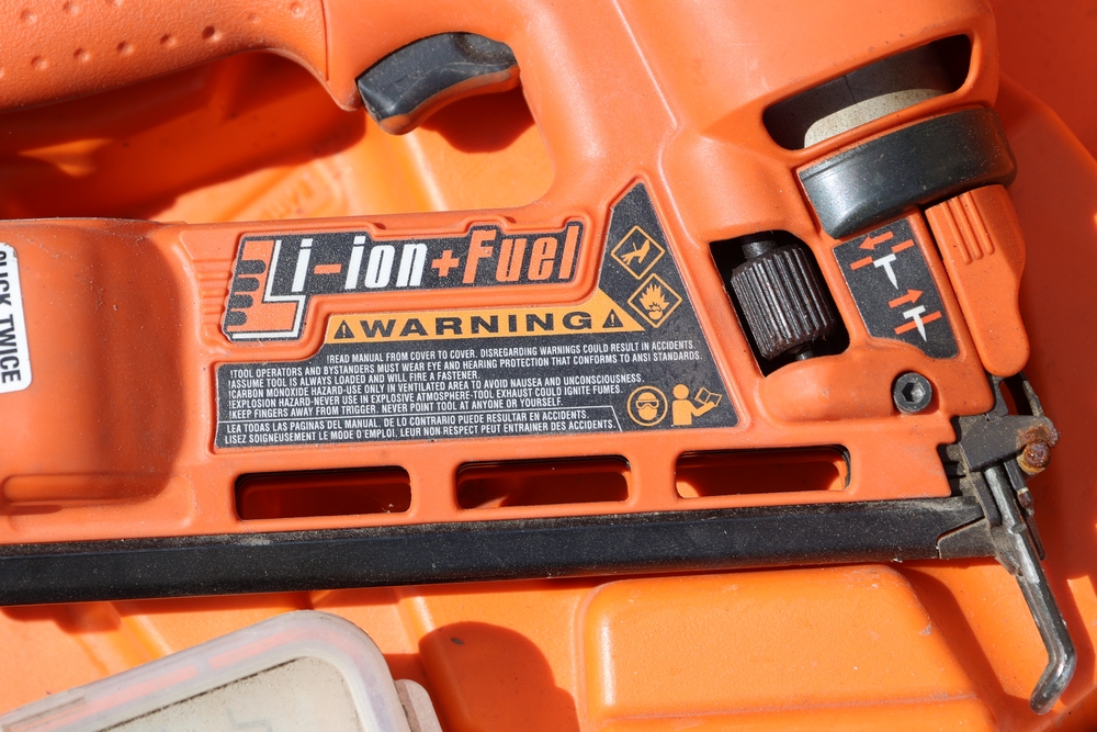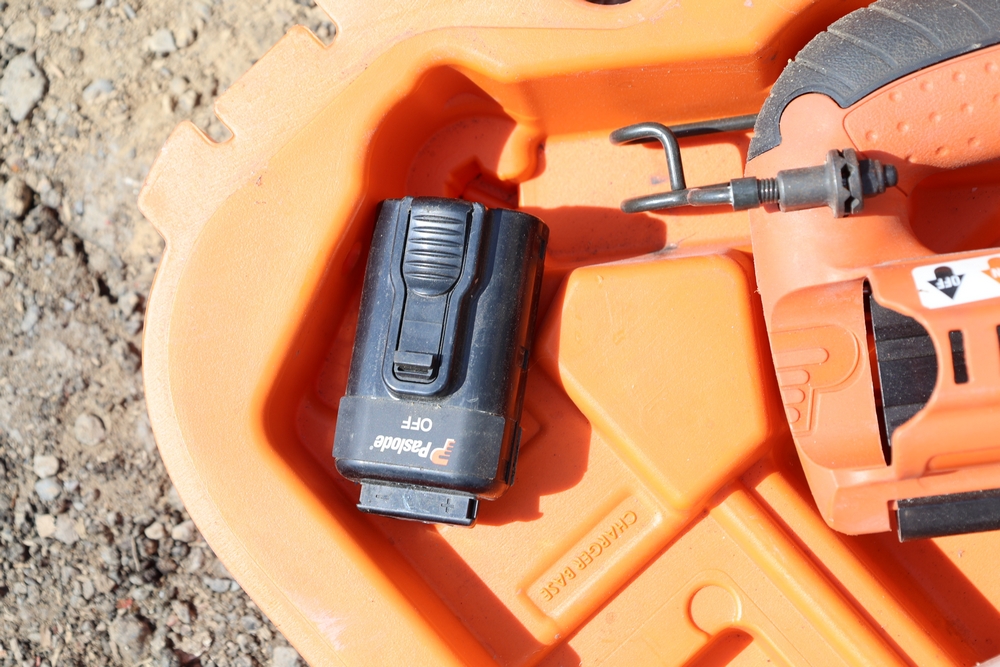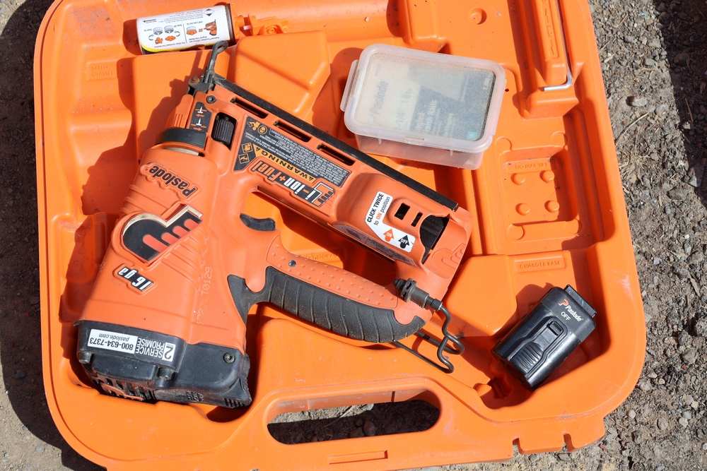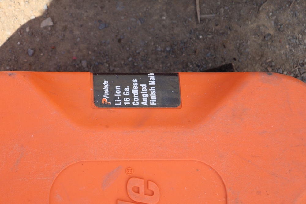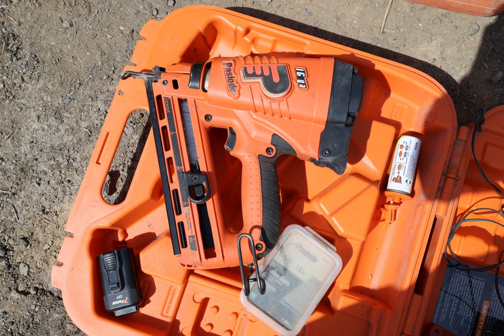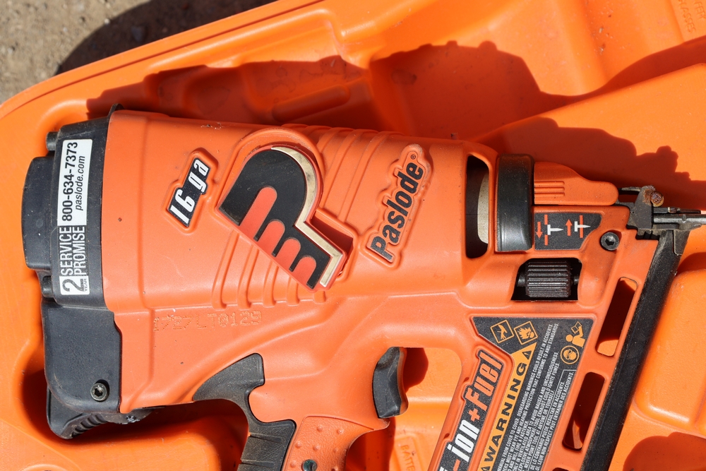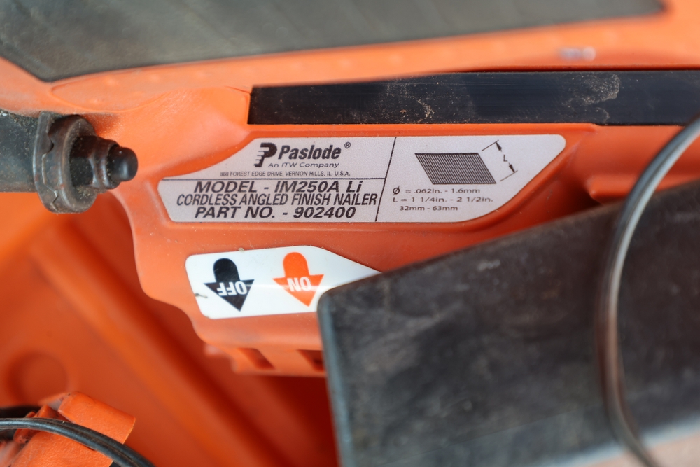 Paslode IM250A Li 16 gauge cordless angled finish nailer with case, charger, battery, fuel cell, and nails.