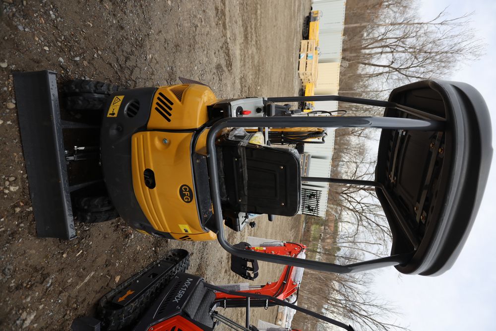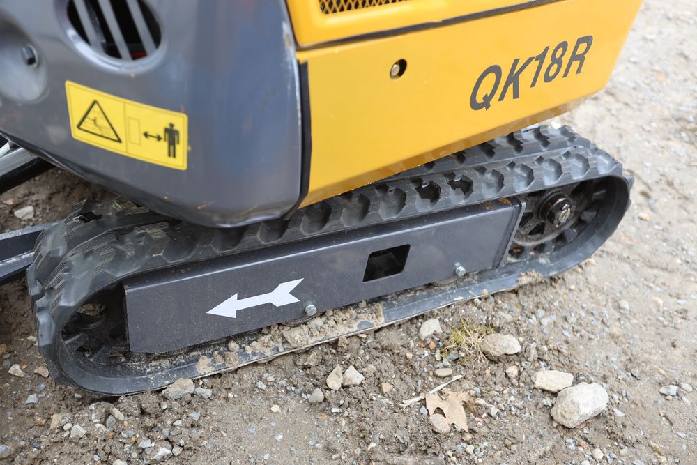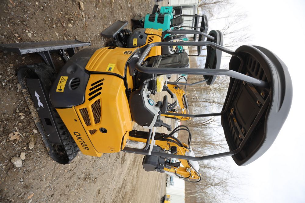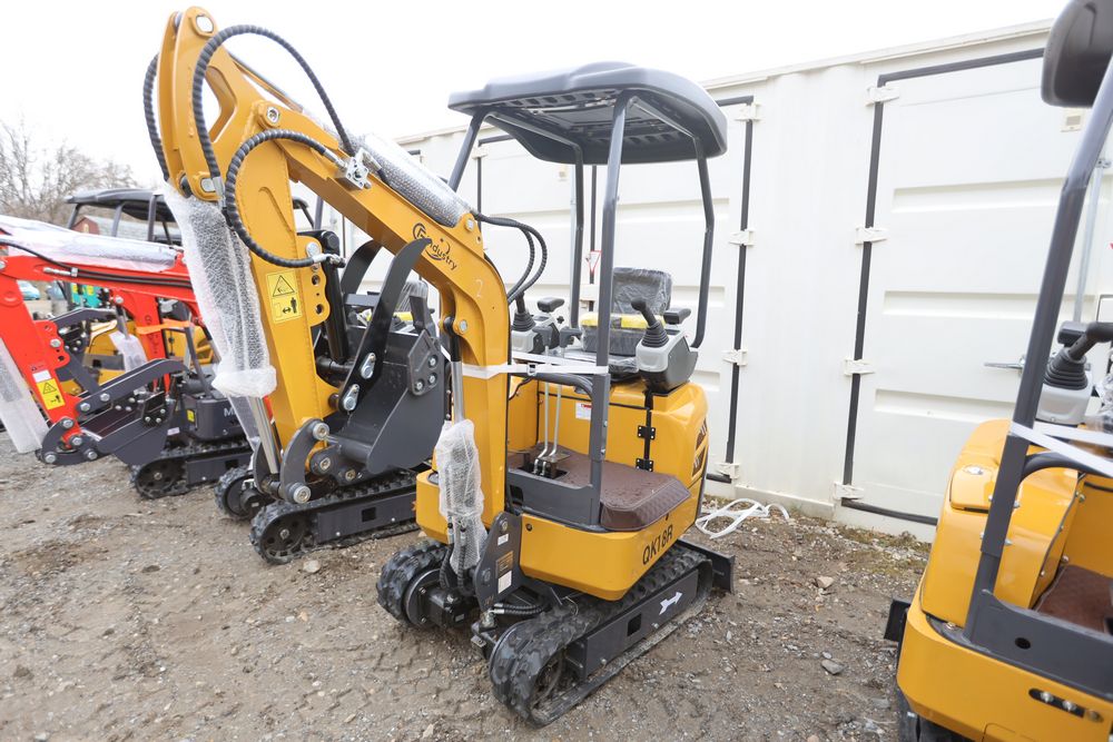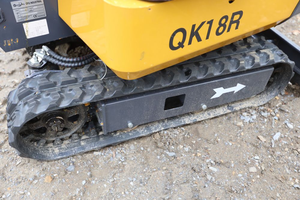 New 2025 CFG mini excavator, model QK18R, RATO, 13.5HP, 8.6KW, with pilot system, hydraulic thumb, rubber tracks, dozer blade, and gasoline engine. Hours reading less than one hour.