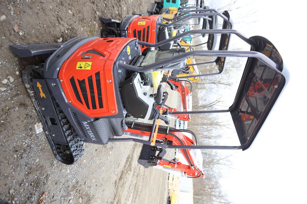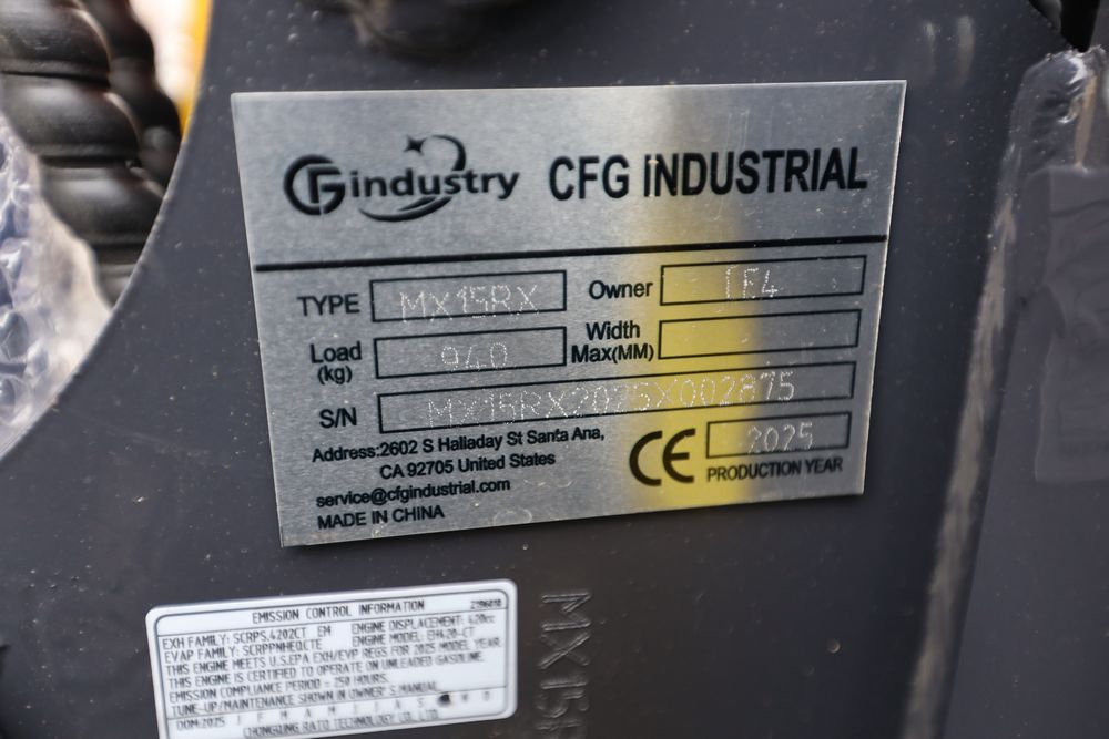New 2026 CFG Industrial MX15RX Mini Excavator with a 420CC gas engine, dozer blade, bucket, pilot controls, and digital gauges. Hours reading less than 1 hour.