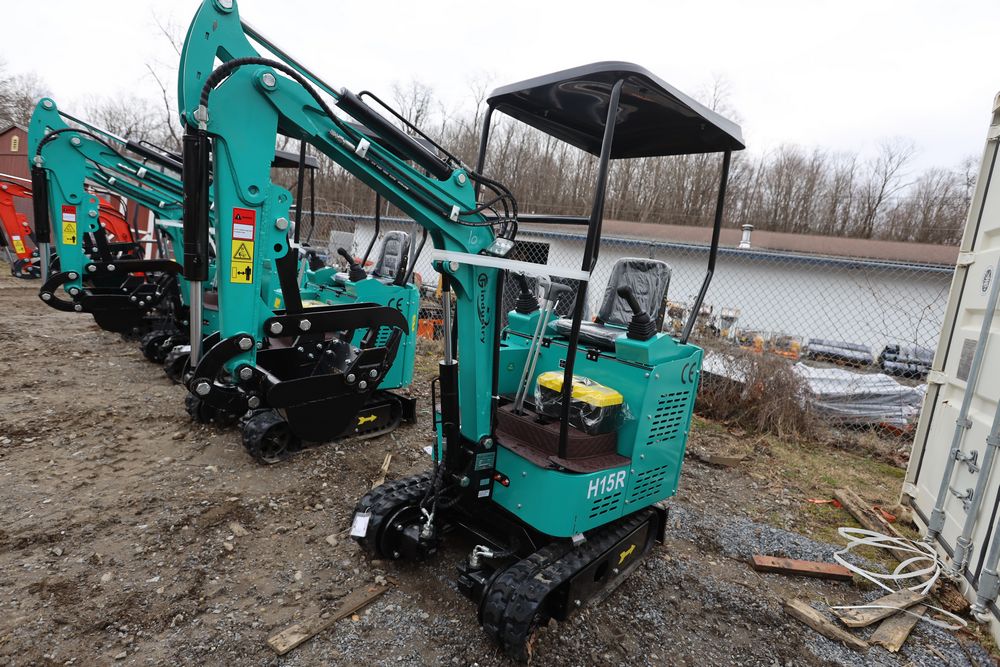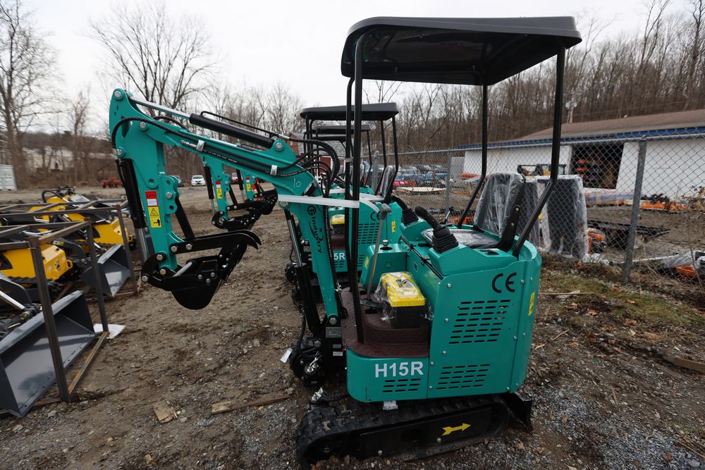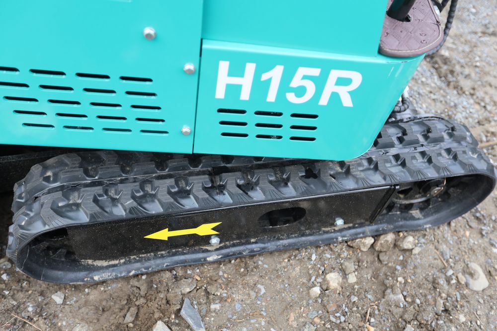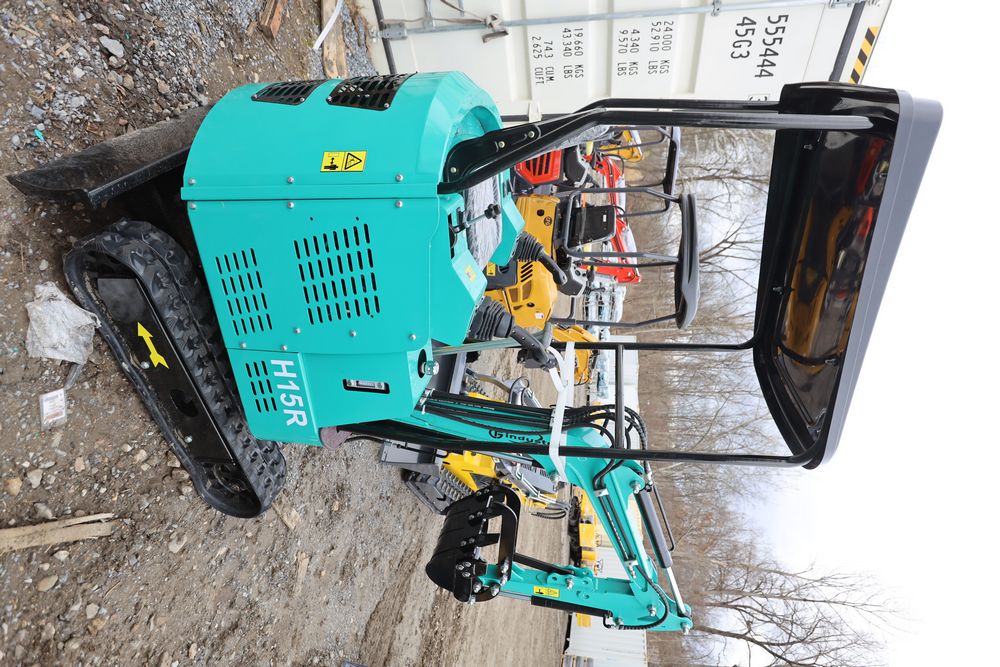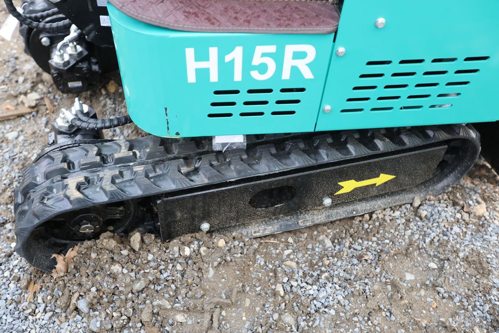 New 2026 CFG Industrial gas powered mini Excavator model H15R with 420cc gasoline engine, bucket, 4' long tracks, 38.5" wide base, 6" wide tracks, canopy, hydraulic boom & bucket controls, pilot system, thumb, dozer blade. Hours reading less than 1 hour.