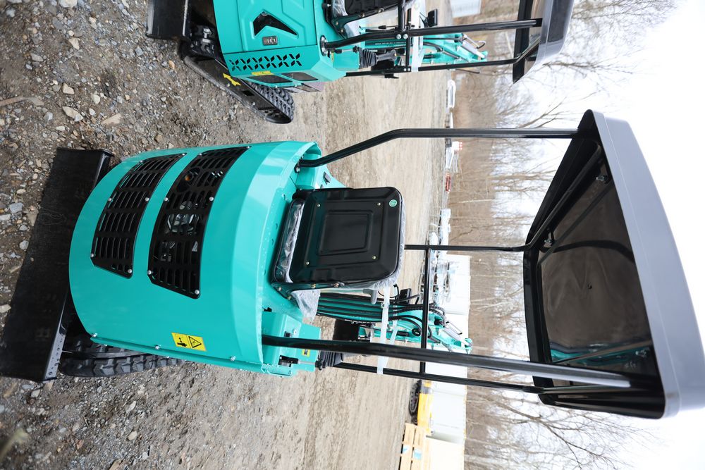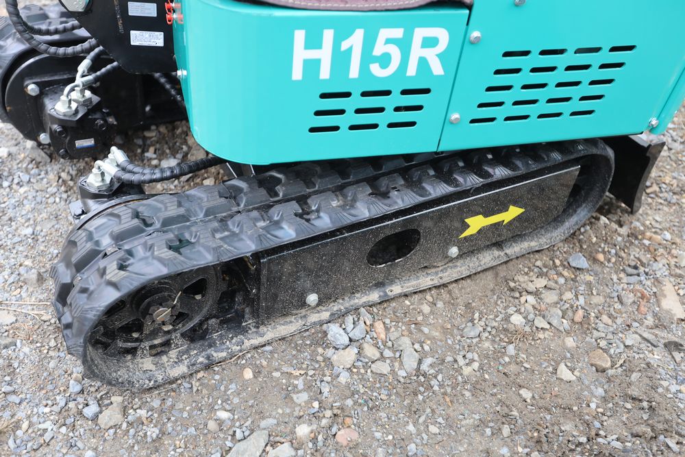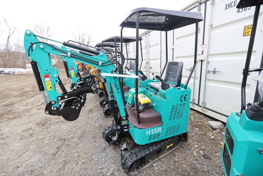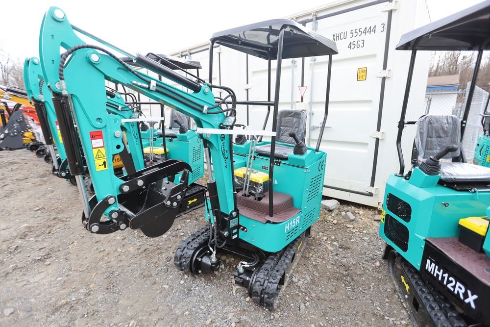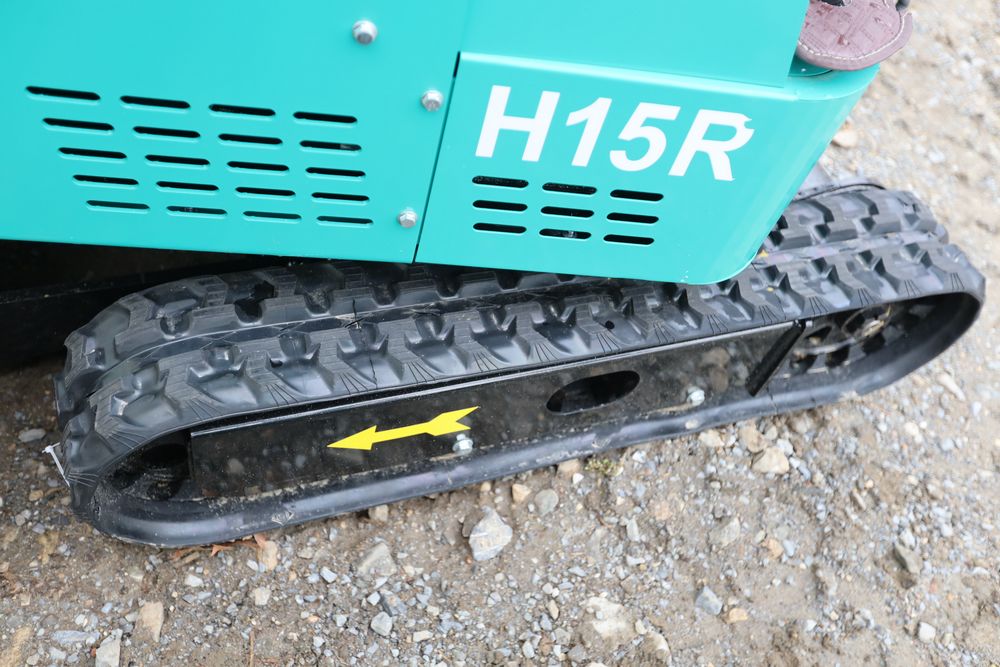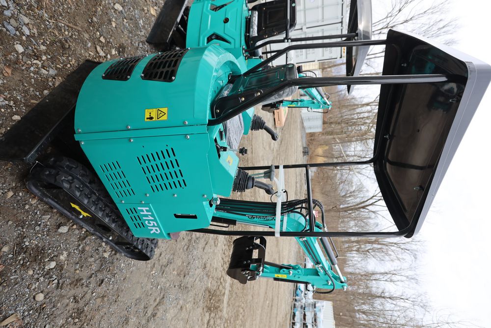 New 2026 CFG Industrial gas powered mini Excavator model H15R with 420cc gasoline engine, bucket, 4' long tracks, 38.5" wide base, 6" wide tracks, canopy, hydraulic boom & bucket controls, pilot system, thumb, dozer blade. Hours reading less than 1 hour.