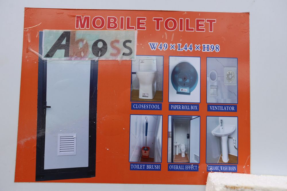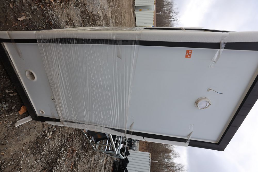 New 2026 Aboss single person restroom wit toilet, sink, lights, and ventilation fan.