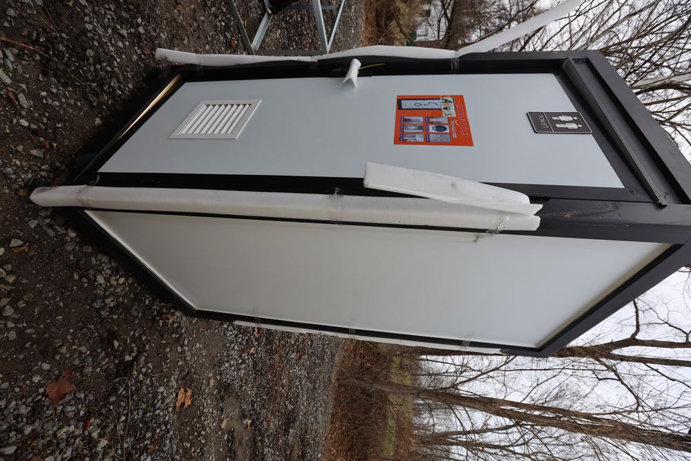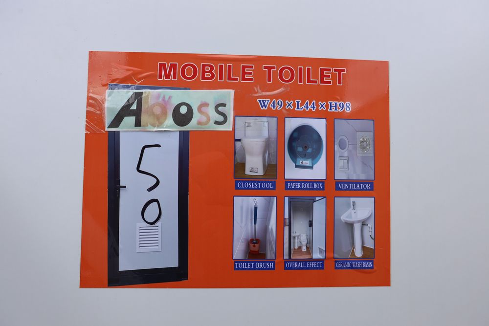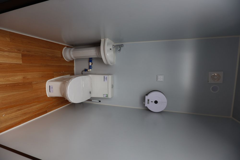 New 2026 Aboss single person restroom wit toilet, sink, lights, and ventilation fan.