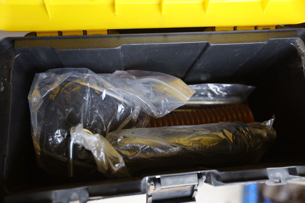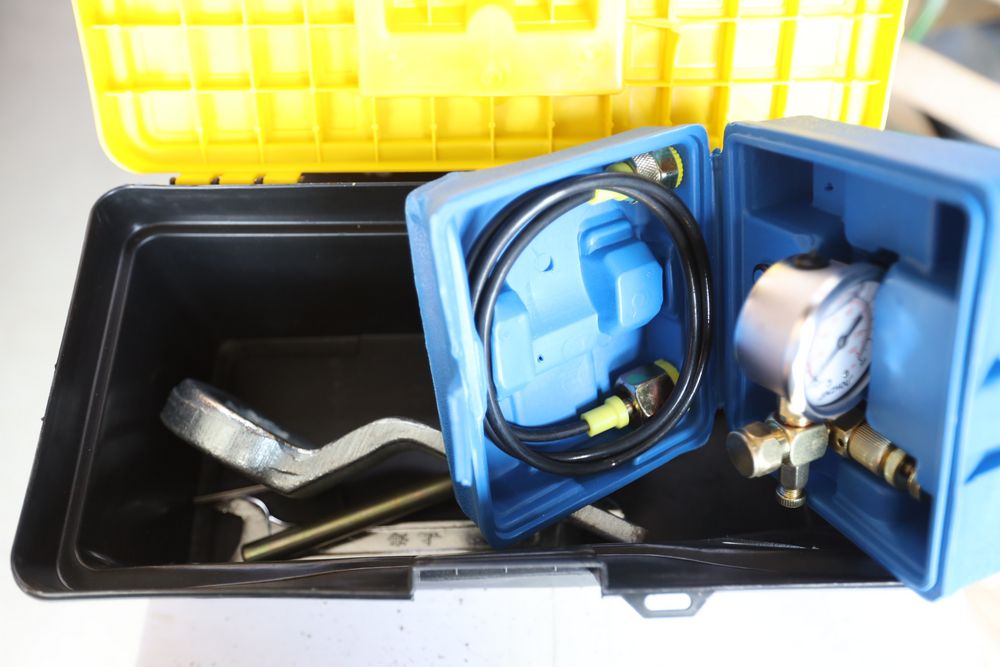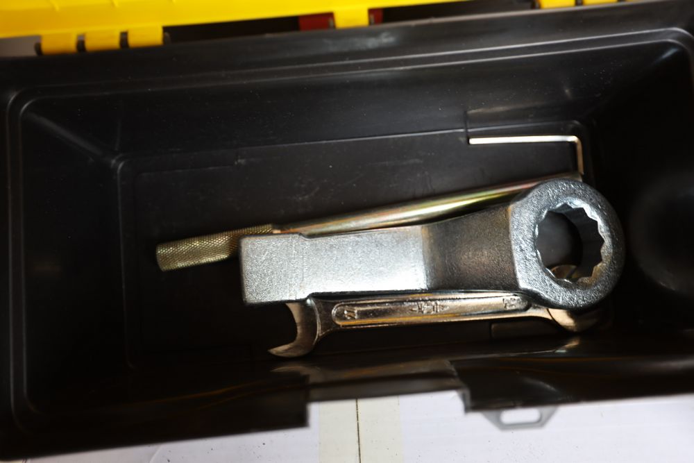 Three plastic tool boxes with assorted tools including spanners, sockets, grease guns, etc.