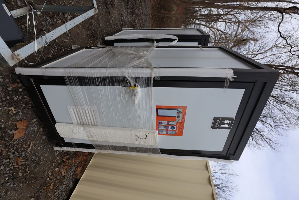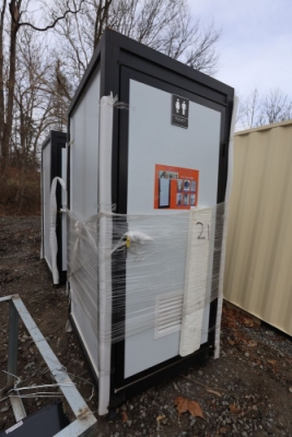New 2026 Aboss single person restroom wit toilet, sink, lights, and ventilation fan.