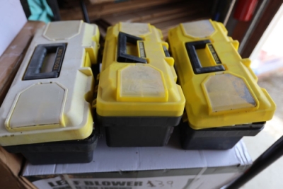 Three plastic tool boxes with assorted tools including spanners, sockets, grease guns, etc.