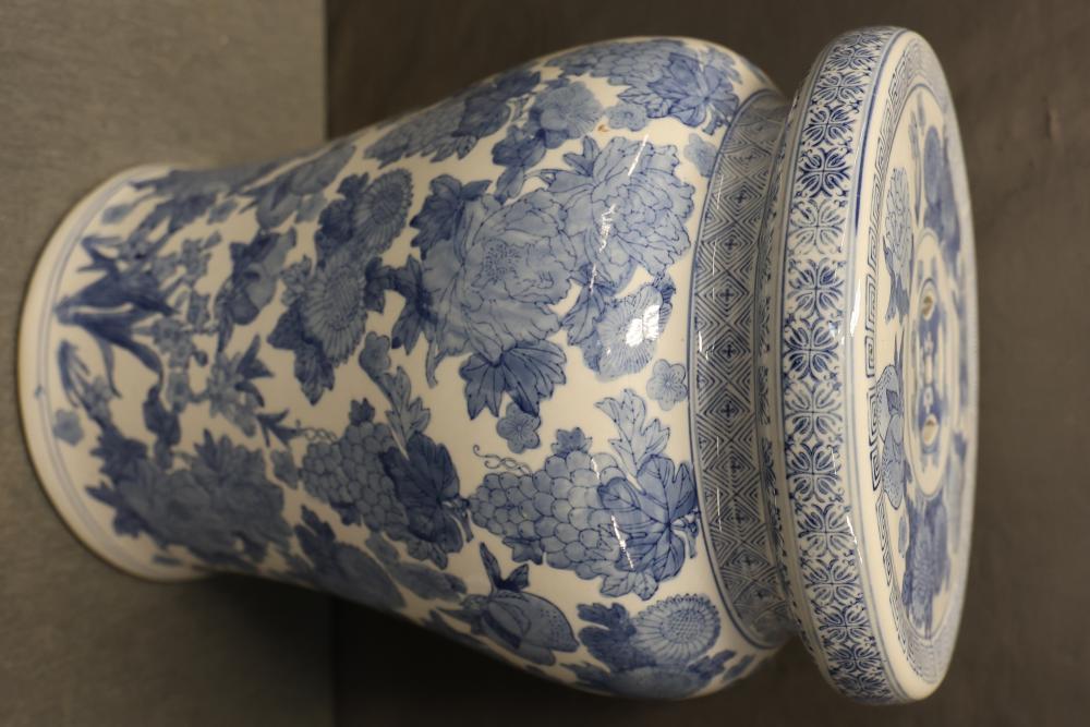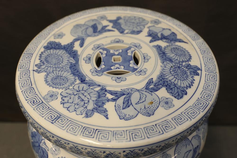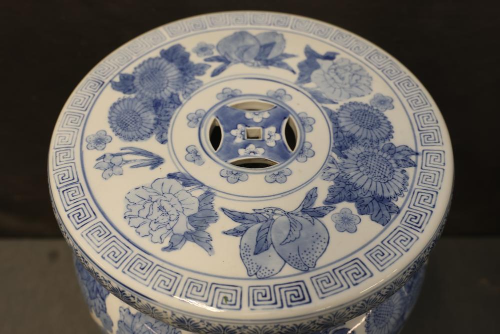 Matching Set Of Blue and white ceramic garden stools with floral pattern. Each stool measures approximately 17 inches high. Pickup only.