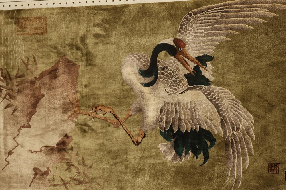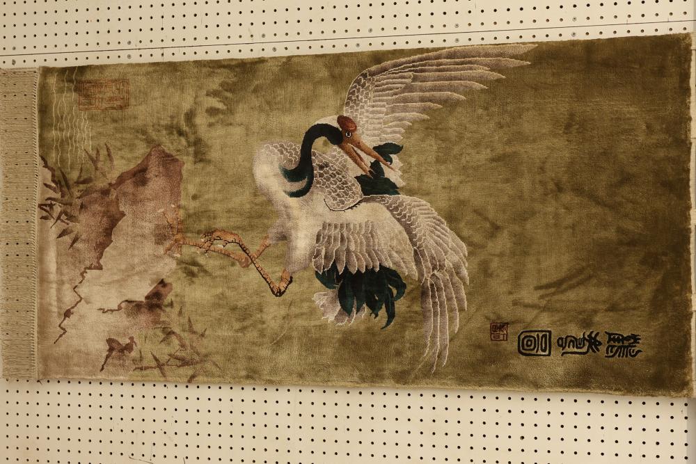 Wall Hanging Tapestry Featuring a Crane with Flowers. Measures approximately 54.25 inches long by 26.75 inches wide.