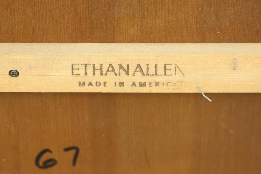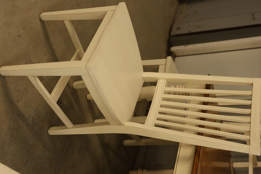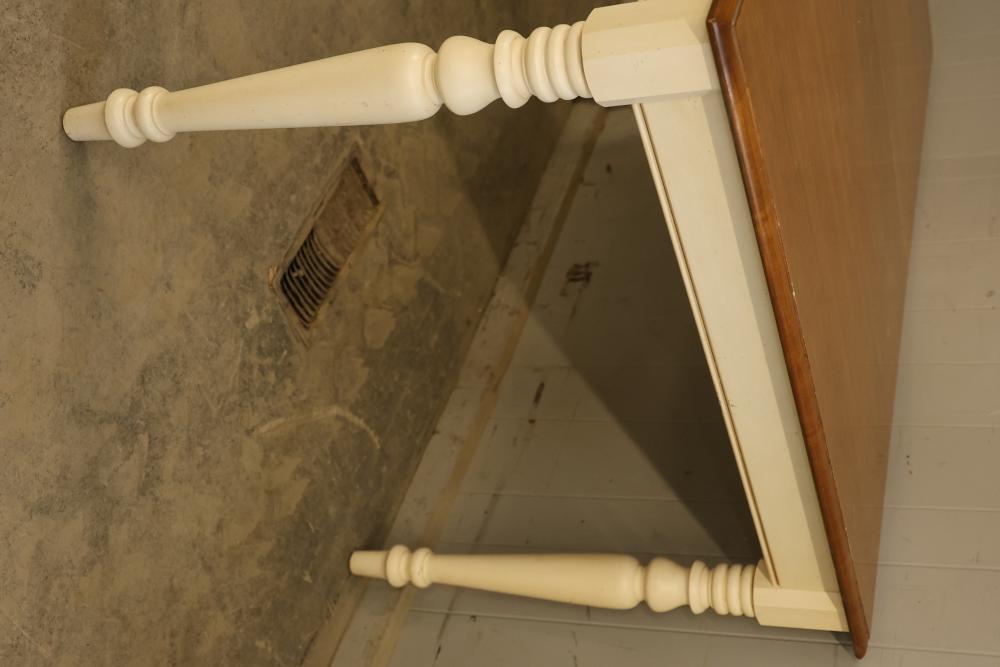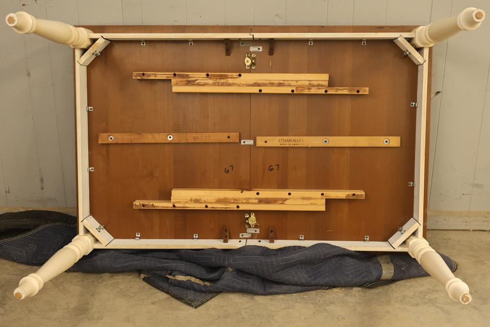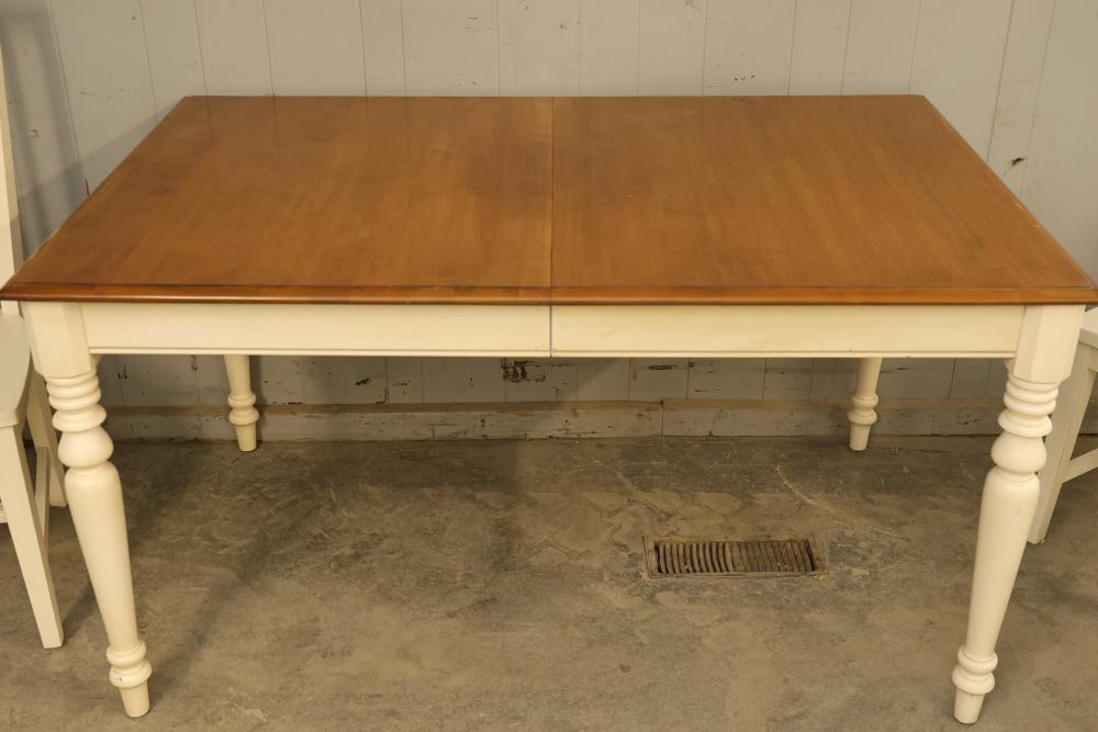 Ethan Allen Expandable Dining Table with One Leaf and 6 Universal Furniture Dining Chairs with Cushions. The table features a wooden top and turned legs with a cream finish and measures approximately 30 inches high, 56 inches wide, and 36 inches deep, with a 36-inch long by 18-inch wide leaf extension. The chairs measure approximately 40 inches high, 19.5 inches wide, and 17 inches deep, featuring slatted backs and cream-colored cushions. Pickup only.