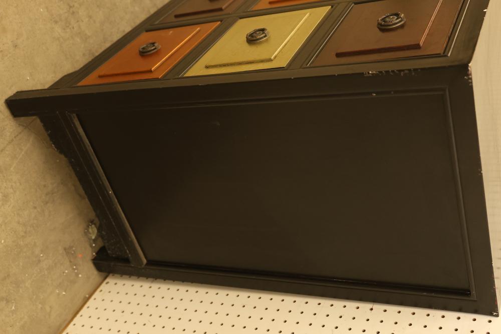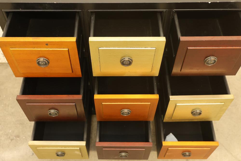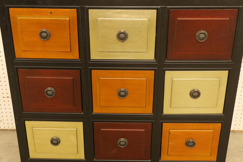 Color Block Accent Cabinet with 9 Drawers and Brass Pulls. Features 9 drawers in a variety of finishes with brass pulls. The cabinet measures approximately 34.5 inches high, 36.5 inches wide, and 18 inches deep. Pickup only.
