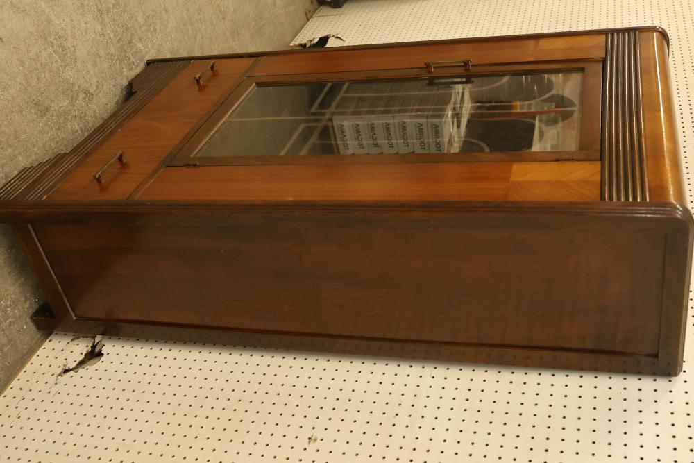 Vintage Art Deco China Cabinet with Patterned Glass and Brass Pulls. Features patterned glass, brass pulls, and a veneer finish. Veneer finish is beginning to peel on the top of the china cabinet. Measures approximately 56 inches high, 32 inches wide, and 14 inches deep. Pickup only.