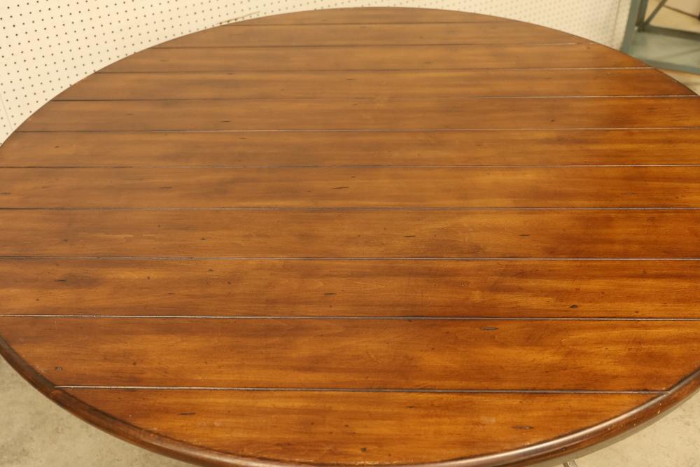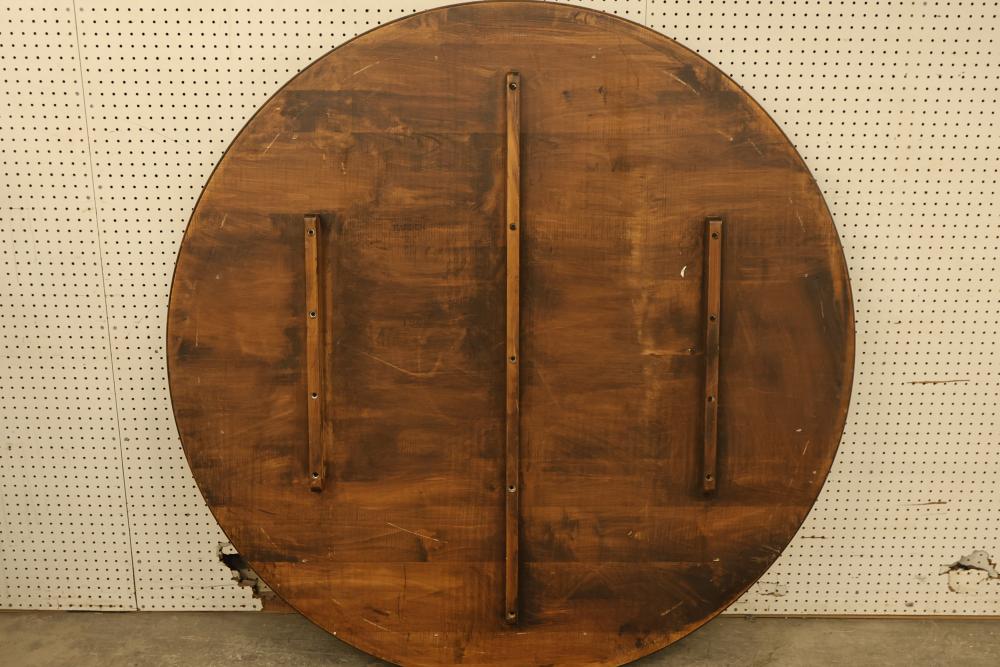 Harden Round Dining Table with Metal Legs. Features wooden finish and metal frame and legs. Hardware is included and attached to the legs. Table measures approximately 30 inches high with a 60 inch diameter. Pickup only.