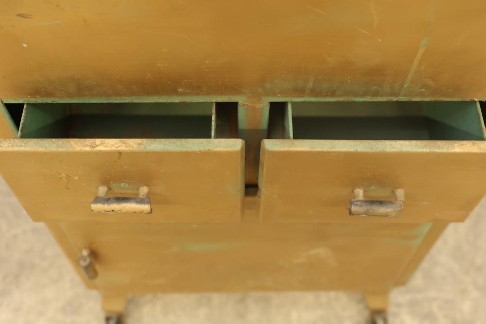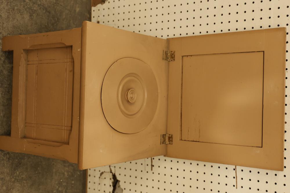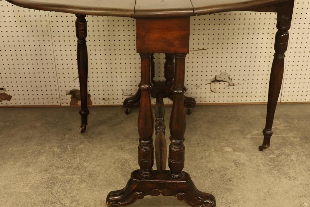 Furniture and accessories including Gateleg Dropleaf Table with Mahogany Finish (approximately 29.5 inches high x 44 inches wide x 36 inches deep), Metal Rolling Medical Cabinet (approximately 34 inches high x 20 inches wide x 16 inches deep), Grange End Table (approximately 37 inches high x 17.5 inches wide x 17.5 inches deep), and Wooden Commode (approximately 16 inches high x 16 inches wide x 16 inches deep). Pickup only.