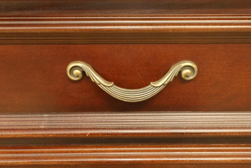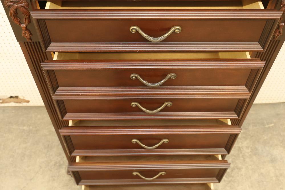 5-Drawer Dresser With Cherry Finish, Bunt Feet, and Applied Carving. Features all-matching metal pulls, a rich cherry finish, decorative applied carving, and bunt feet. Measures approximately 53 inches high, 34.5 inches wide, and 19 inches deep. Pickup only.