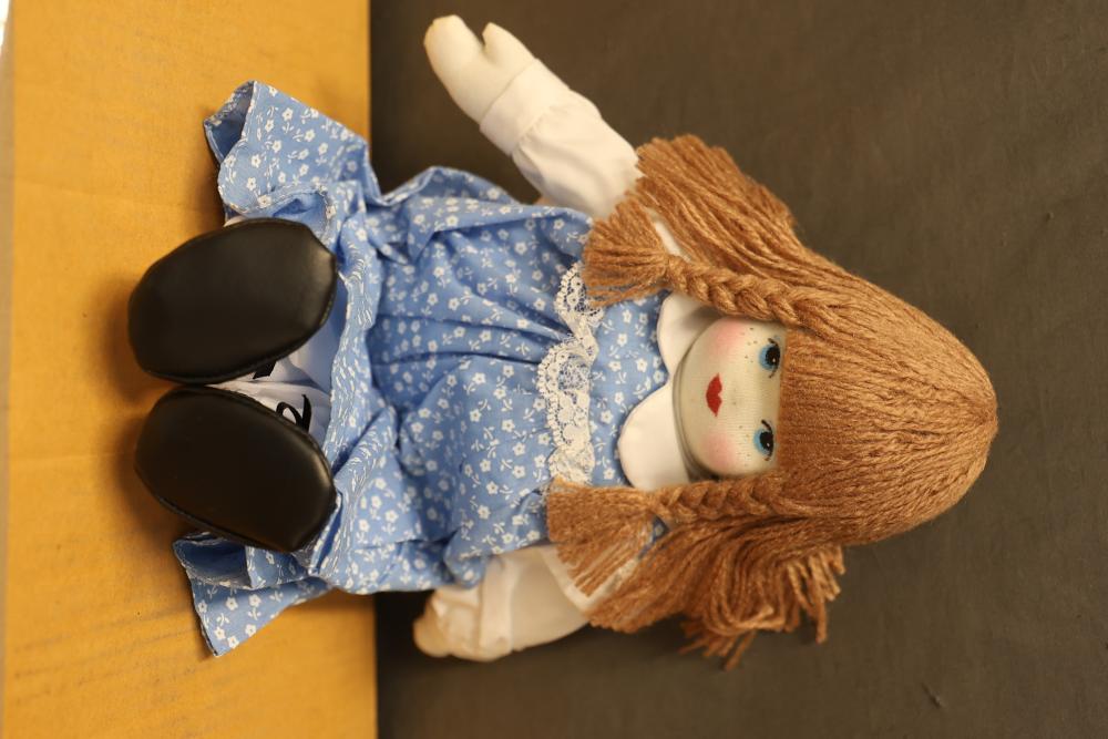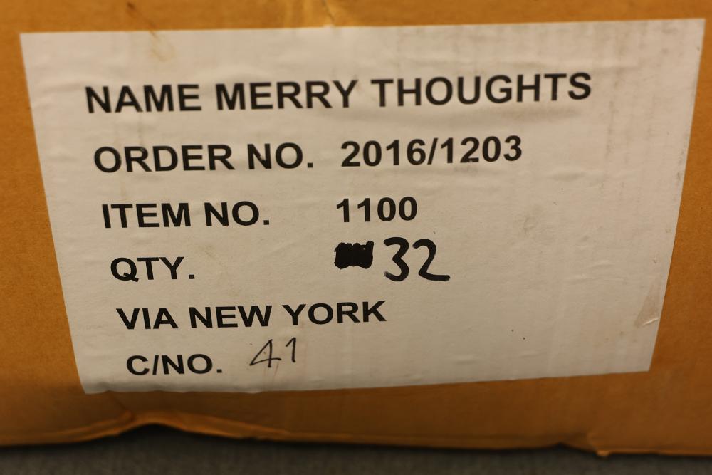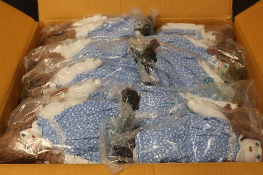 Quantity of 32 Merry Thoughts Dolls in original packaging. Each doll features brown yarn hair, a painted face, and a blue floral dress. Includes a sealed box labeled with the product and quantity details. Pickup only.