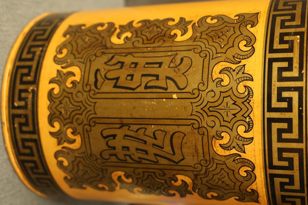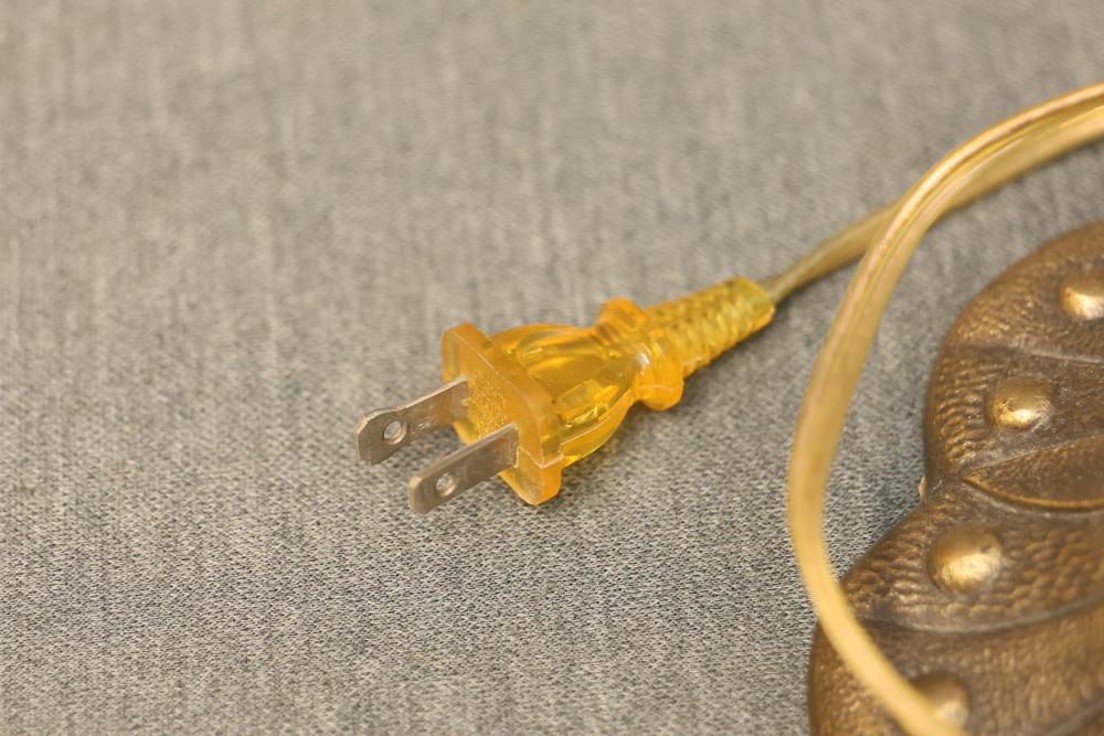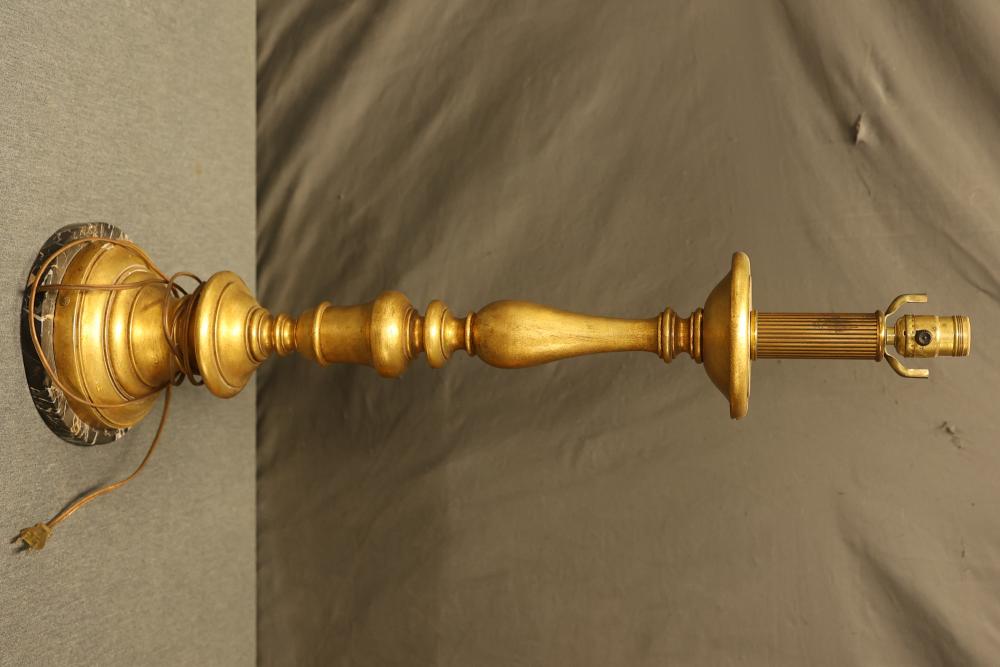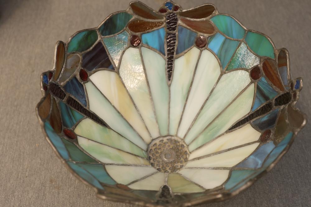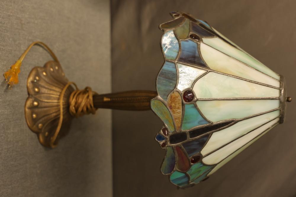 18 Inch Bronze-Toned Lamp with Flared Feet and Leaded Stained Glass Style Lamp Shade featuring a Dragonfly design. Includes a 30.5 Inch Candlestick Brass Lamp with Decorative Base and a Decorative Tea Caddy with Chinoiserie design. Both lamps are functional, but light bulbs are not included. Pickup only.