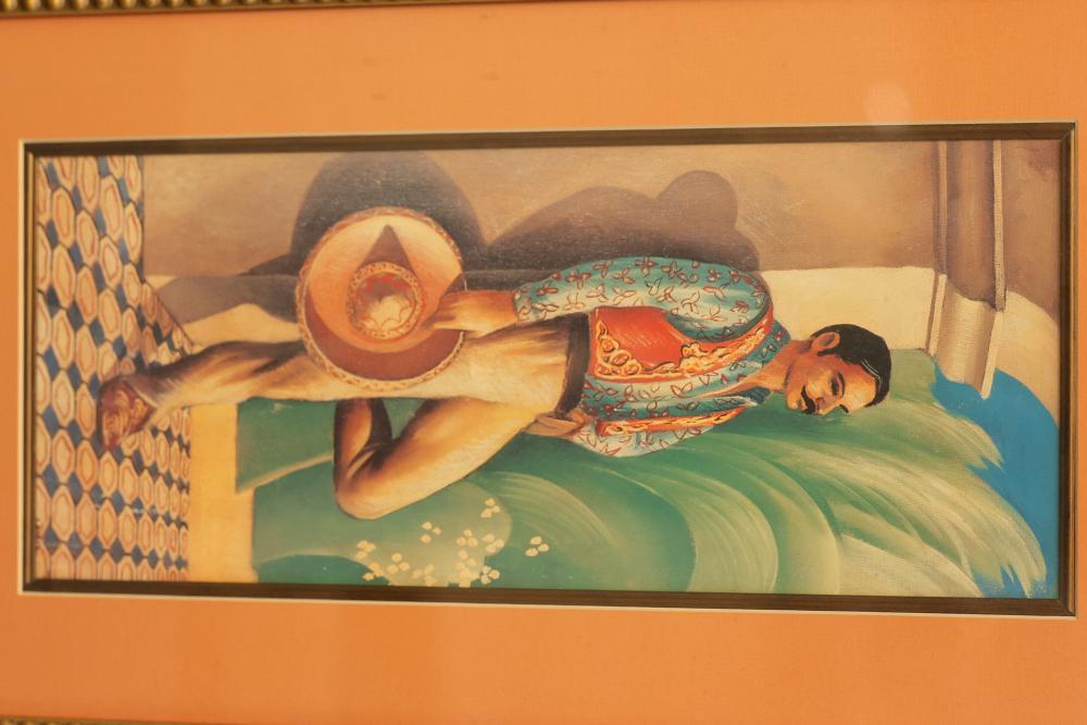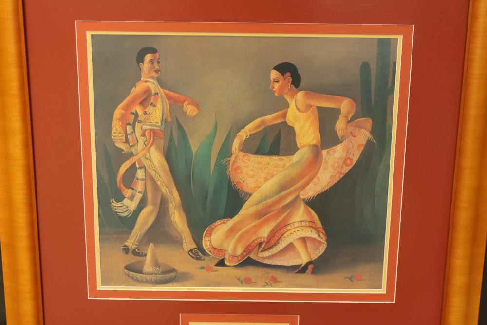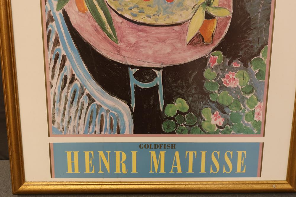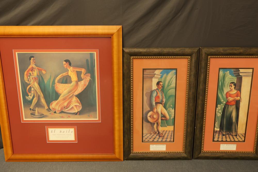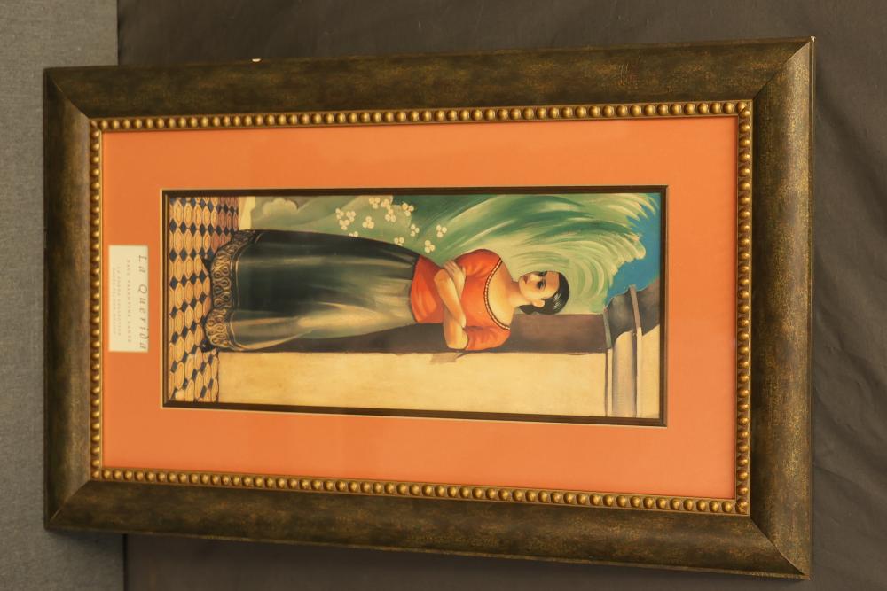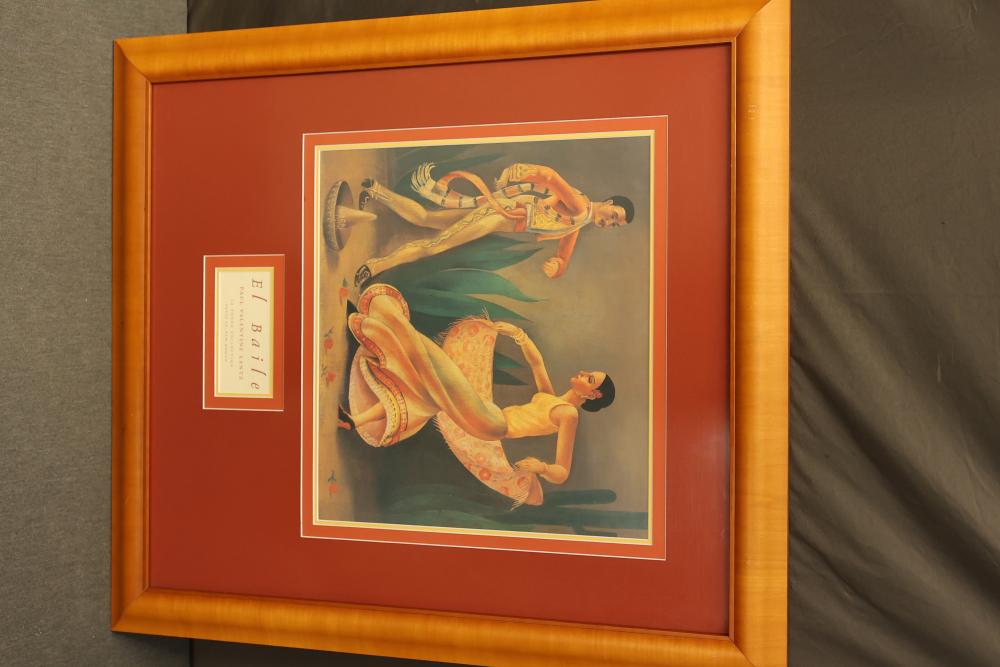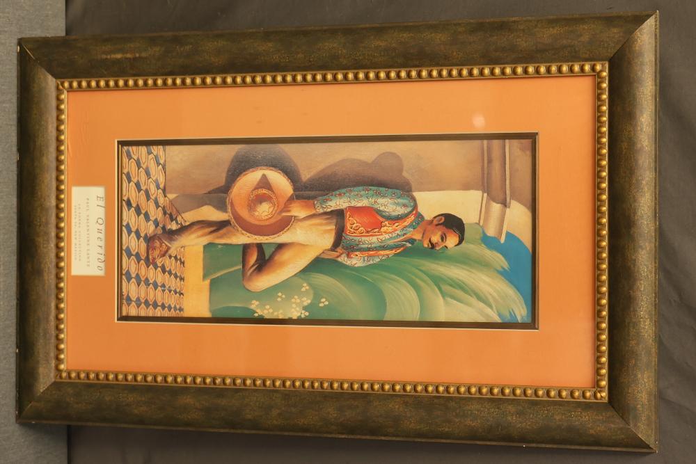 6 Pieces of Framed Artwork Featuring Works by Matisse, Rivera, and Lantz. Includes a framed poster of 'Goldfish'� by Henri Matisse, three framed prints from the La Fonda Collection by Paul Valentine Lantz titled 'El Baile,'� 'El Querido,'� and 'La Querida,'� a framed canvas print of 'The Flower Carrier'� by Diego Rivera with mixed media, and a framed canvas print in the style of Grace Mitchell's 'Jade Garden Birds and Flowers.'� Pieces measure from approximately 46.5 inches long by 34.25 inches wide to approximately 26.25 inches long by 26.25 inches long. Pickup only.