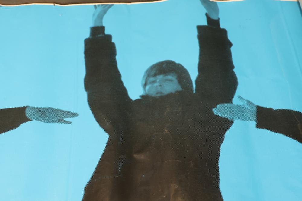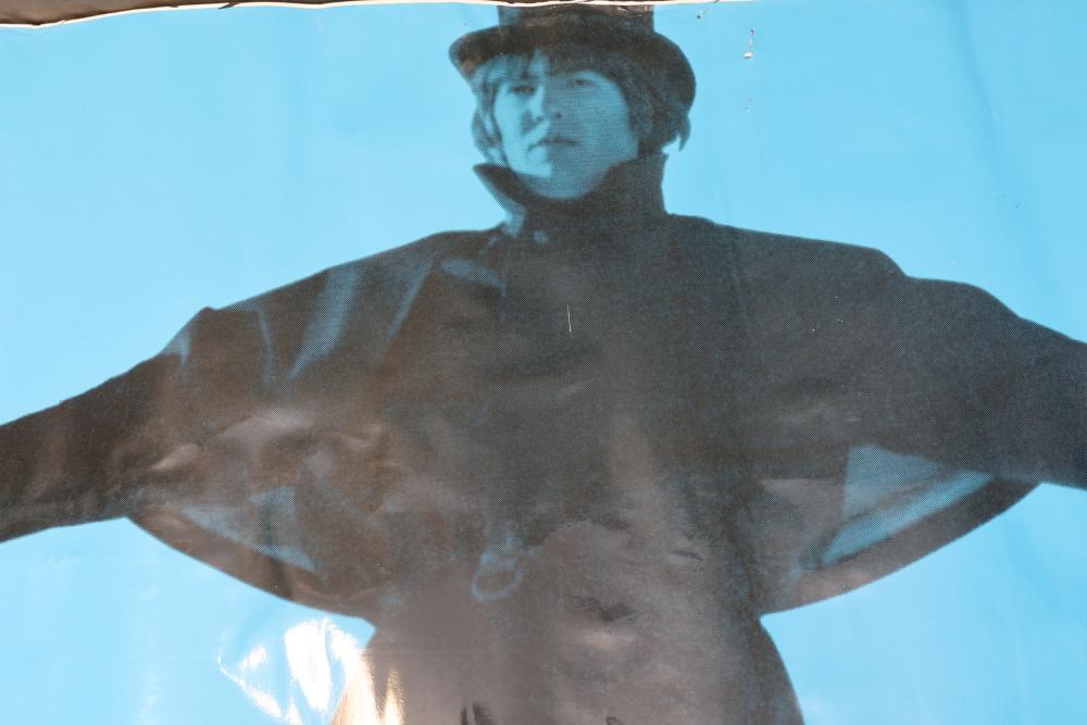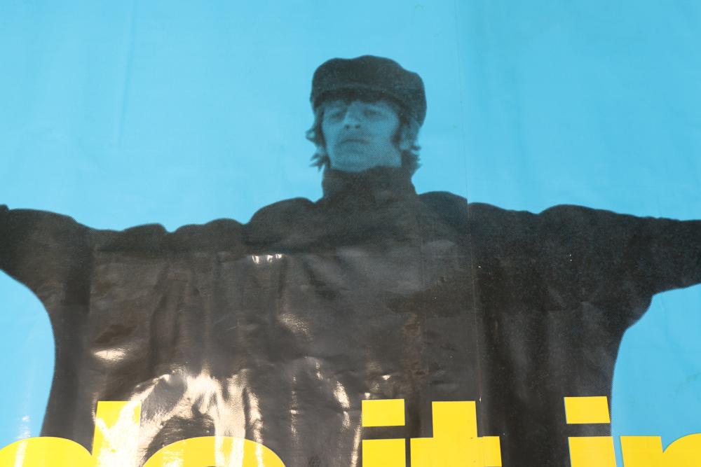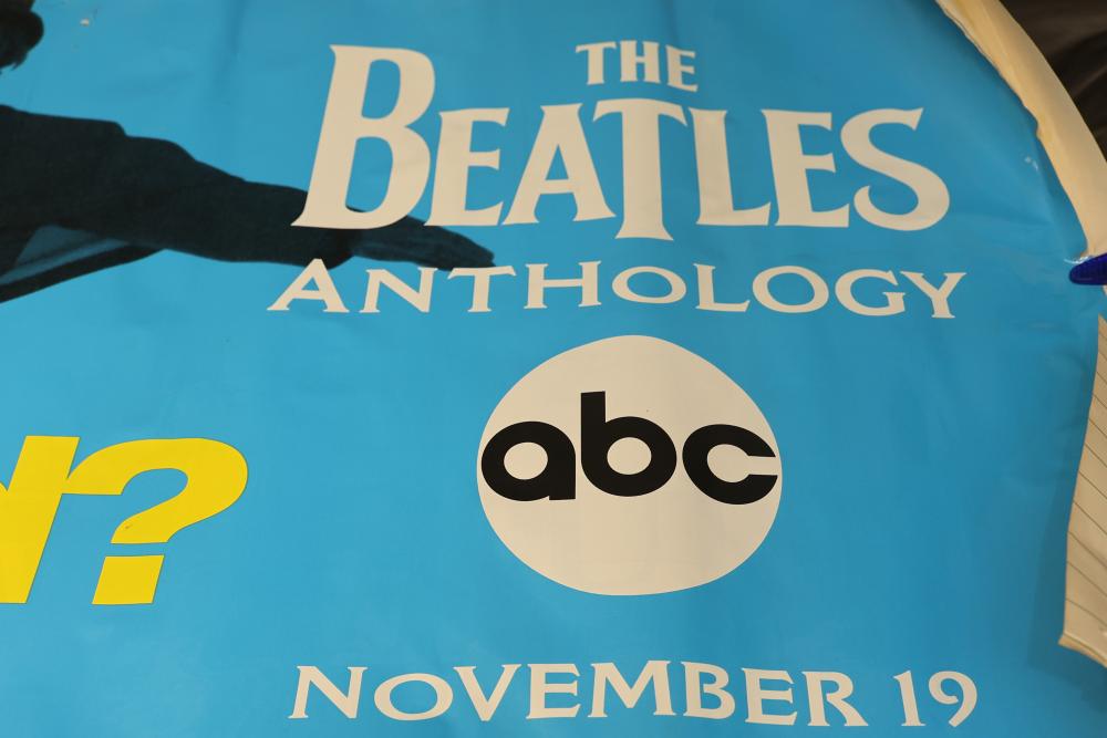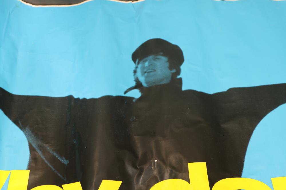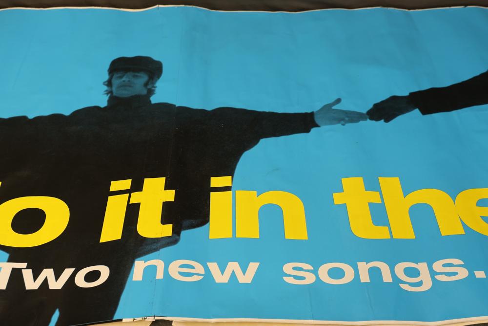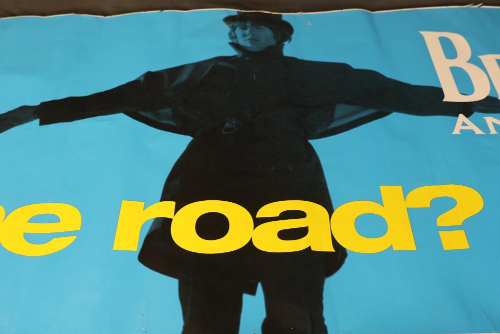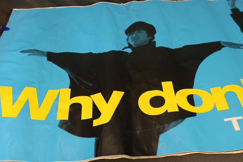 The Beatles 'Why Don't We Do It In The Road?' Promotional Poster. The poster measures approximately 144 inches long and 30 inches wide. It features bold text and imagery related to the Beatles anthology. Condition may feature signs of handling or age-related wear. Pickup only.