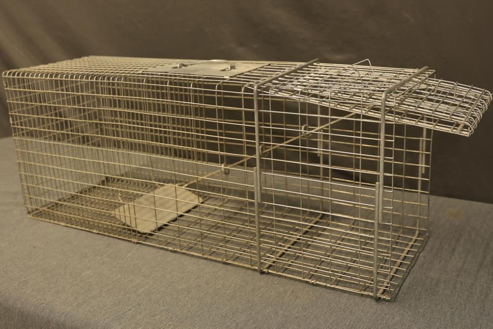 Have-A-Heart Humane Animal Trap, Steel Wiring, 12.5 x 10 x 32 Inches. The trap features a handle on top for easy transport and an opening on one end. Constructed from durable steel wiring. The dimensions from the opening measure approximately 12.5 inches high, 10 inches wide, and 32 inches deep. Pickup only.