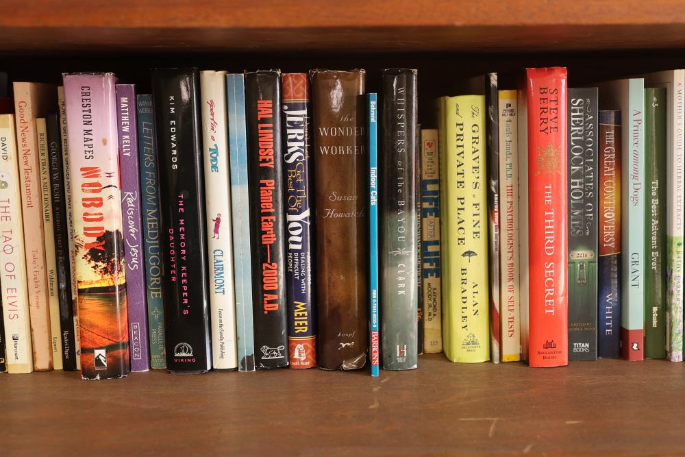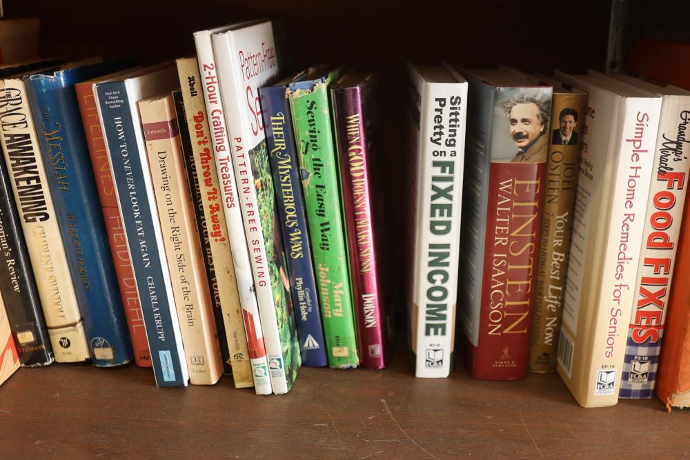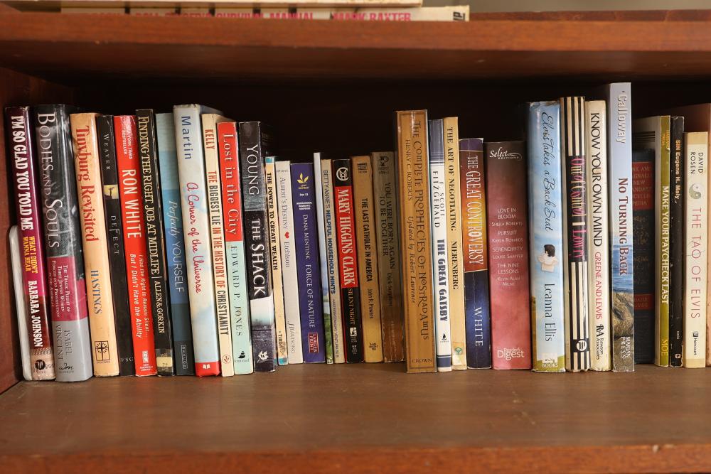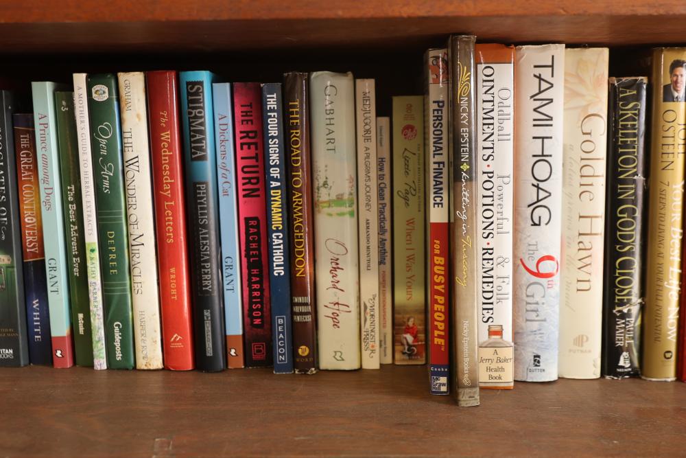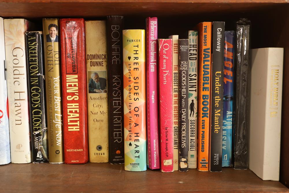Book Collection of 197 Books with Comics, Stamp Collection, and Glassware. Includes works by Joel Osteen, F. Scott Fitzgerald, and James Patterson. Also features comics, a variety of stamps, and assorted glassware and decorative items. Bookshelf not included. Pickup only.