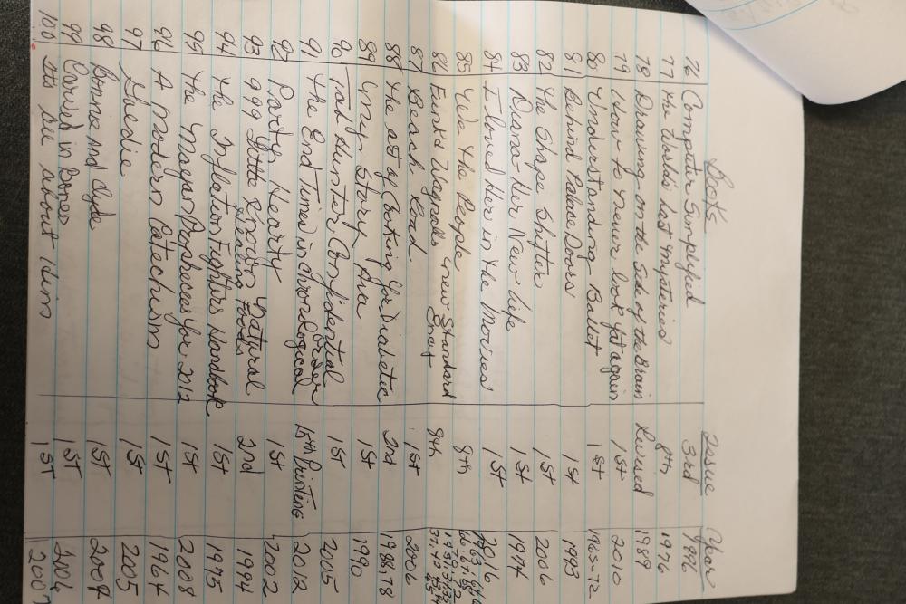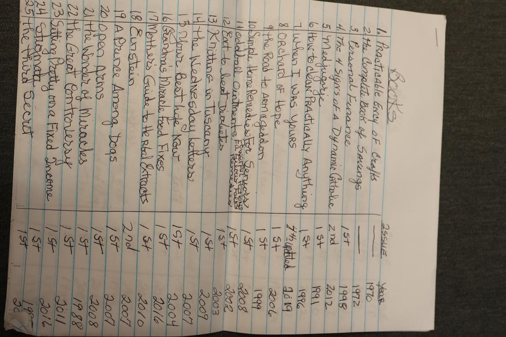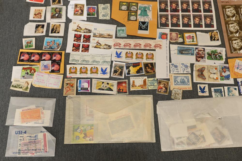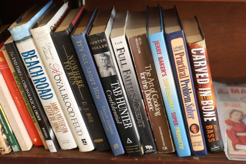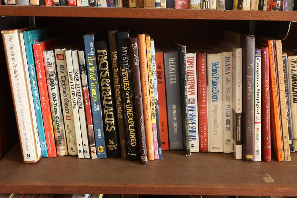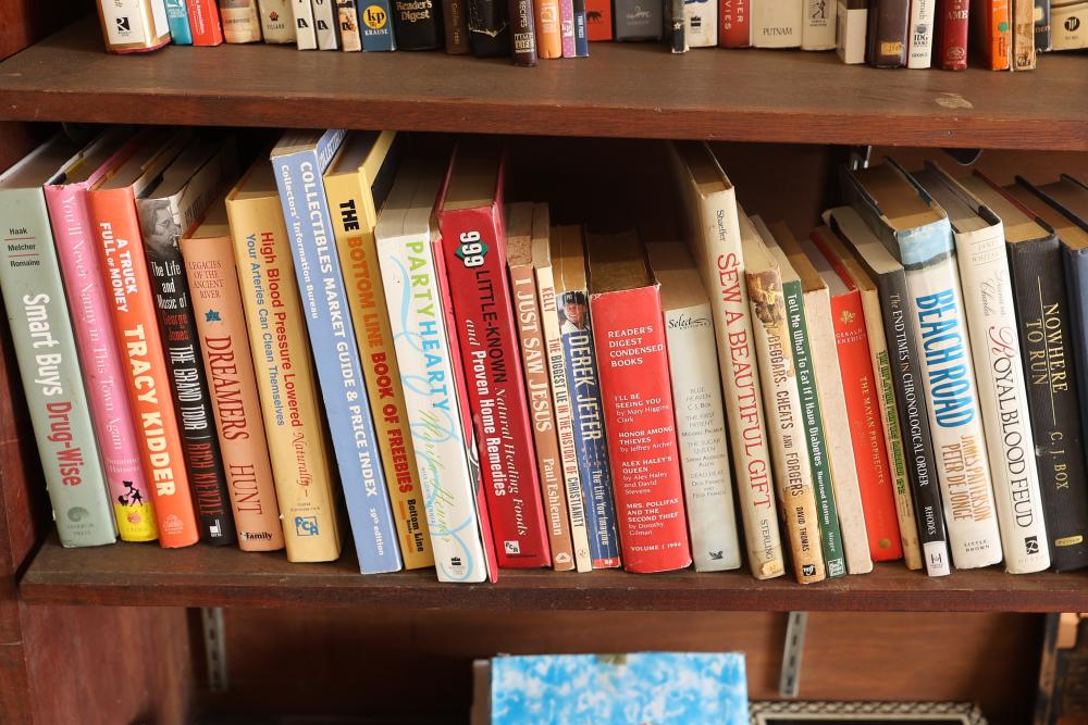 Book Collection of 197 Books with Comics, Stamp Collection, and Glassware. Includes works by Joel Osteen, F. Scott Fitzgerald, and James Patterson. Also features comics, a variety of stamps, and assorted glassware and decorative items. Bookshelf not included. Pickup only.