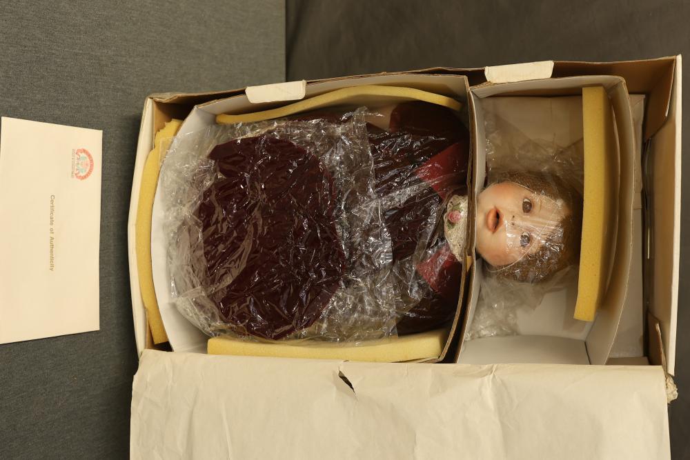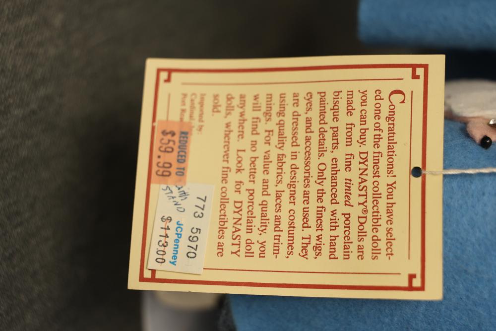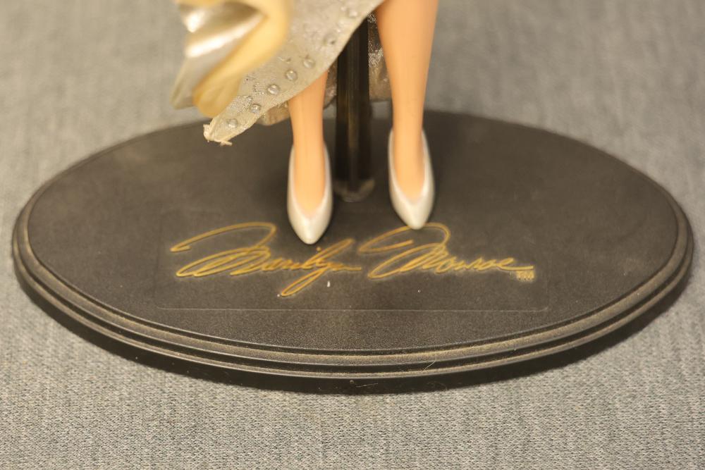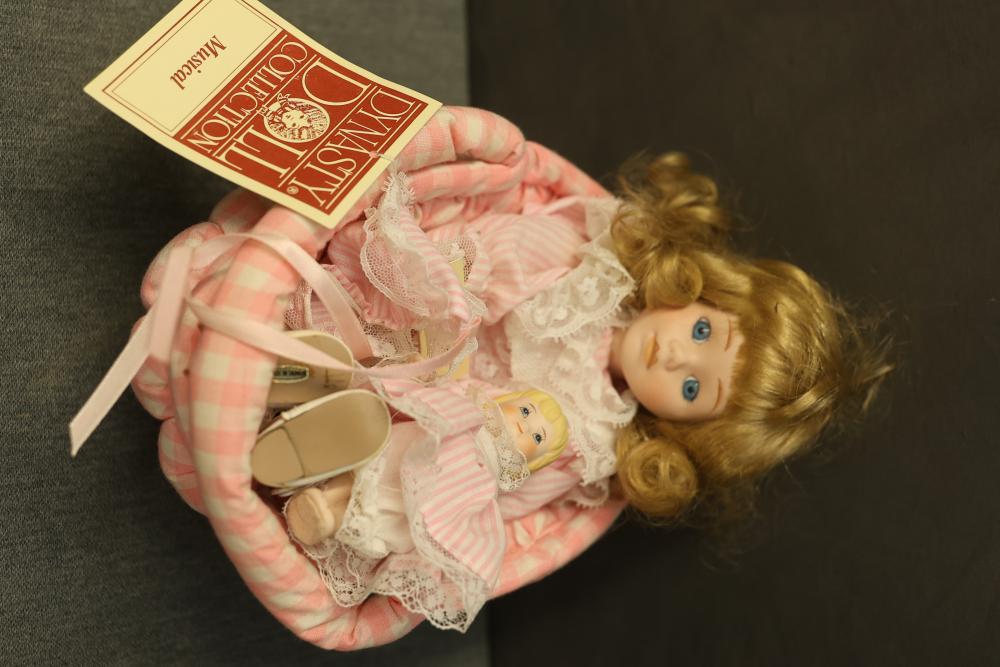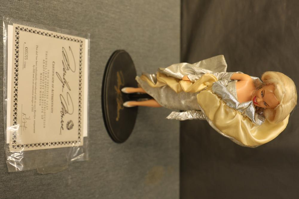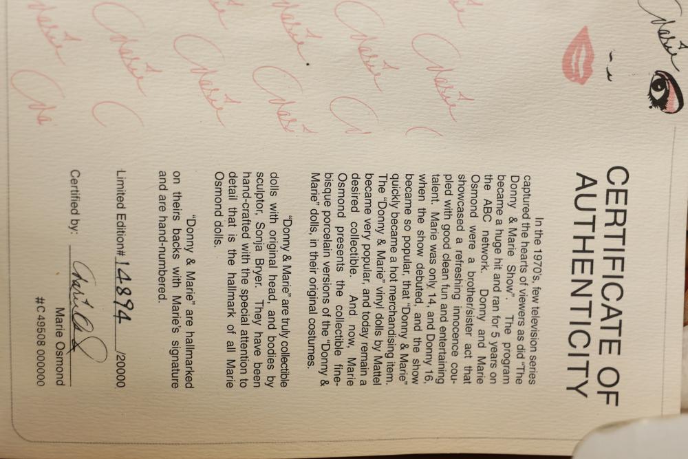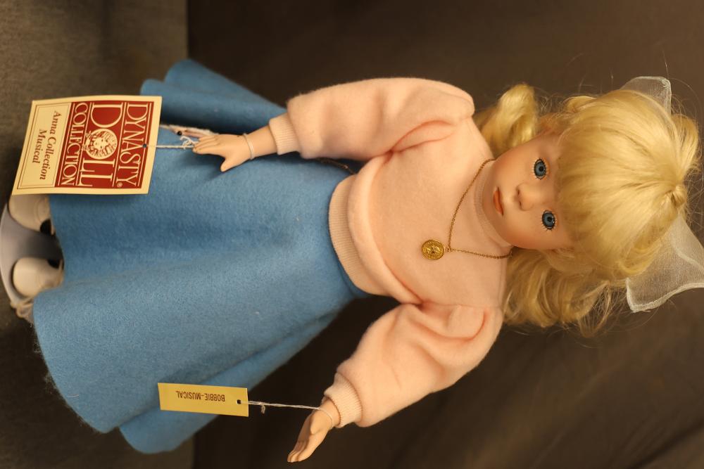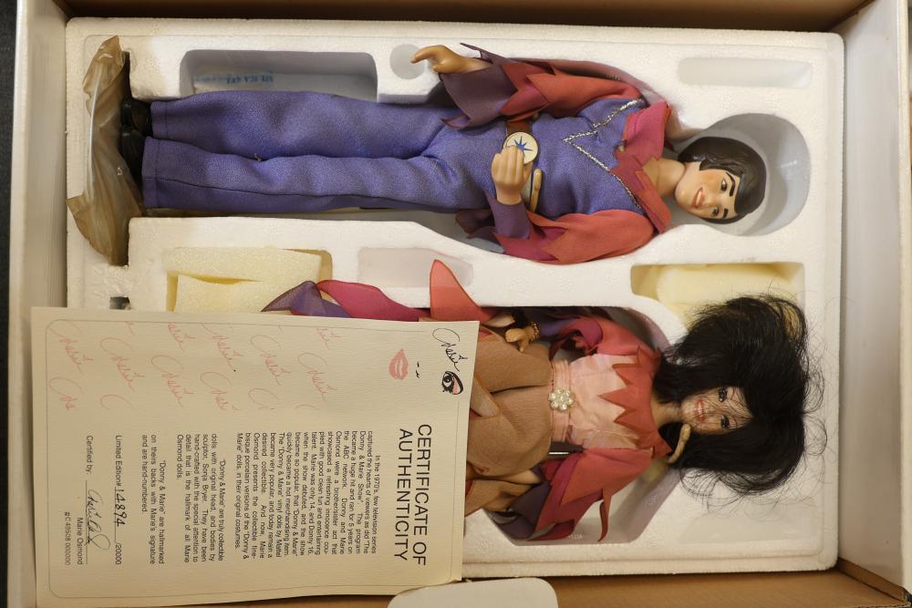 16 Dolls Including Porcelain and Plastic Models. Includes dolls from Dynasty Doll Collection, Marian, World Gallery Dolls and Collectibles, Carol Anne Dolls, and Traditions Doll Collection. Eleven are porcelain, and the rest are plastic. Features fine-bisque porcelain reproductions of Donny and Marie Osmond sculpted by Sonja Bryer, and an official Marilyn Monroe reproduction doll approved by her estate. Pickup only.