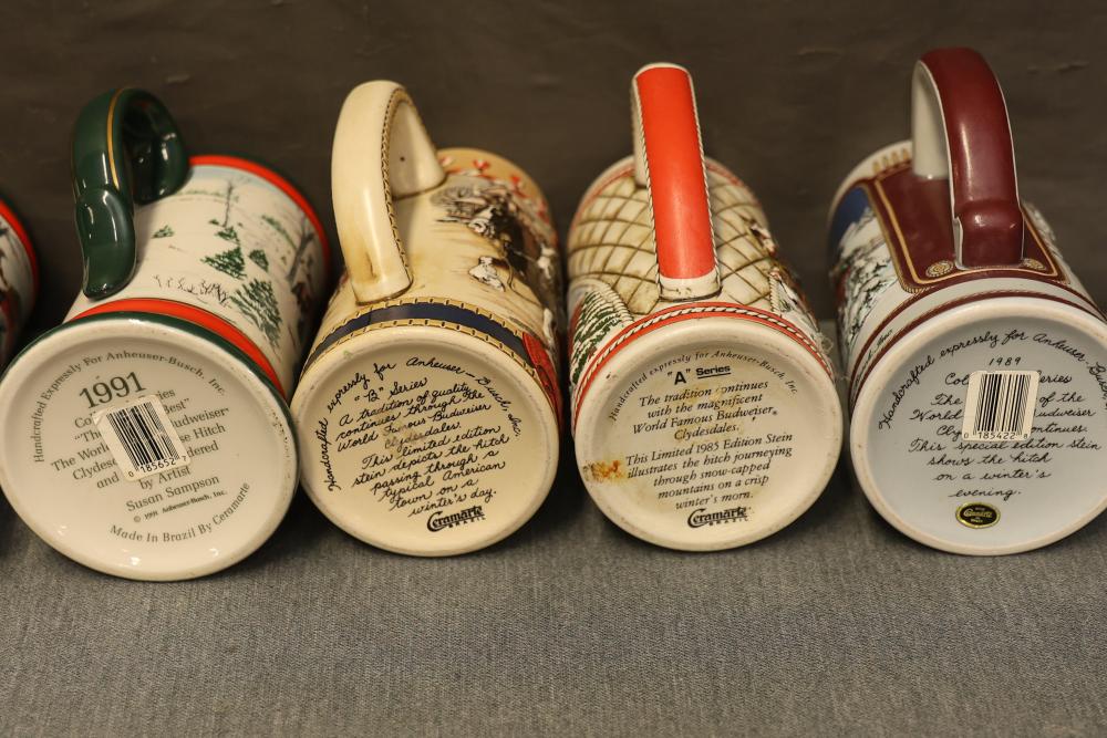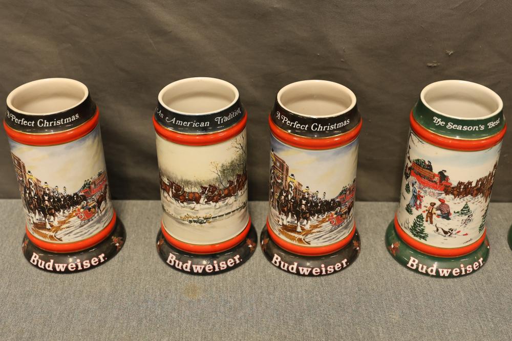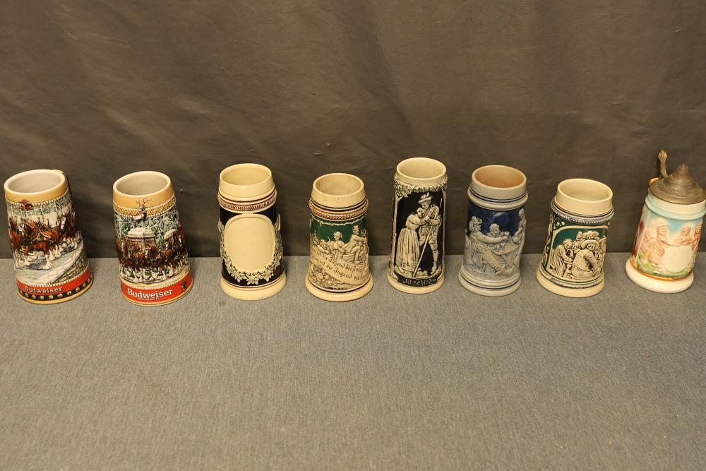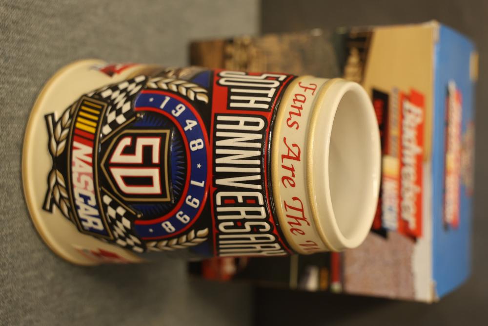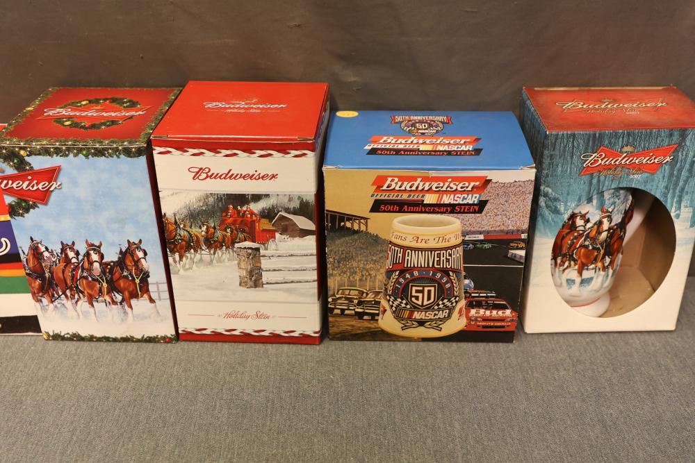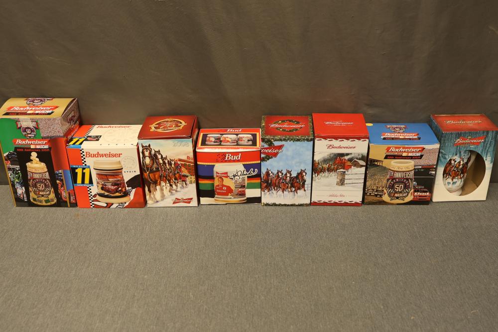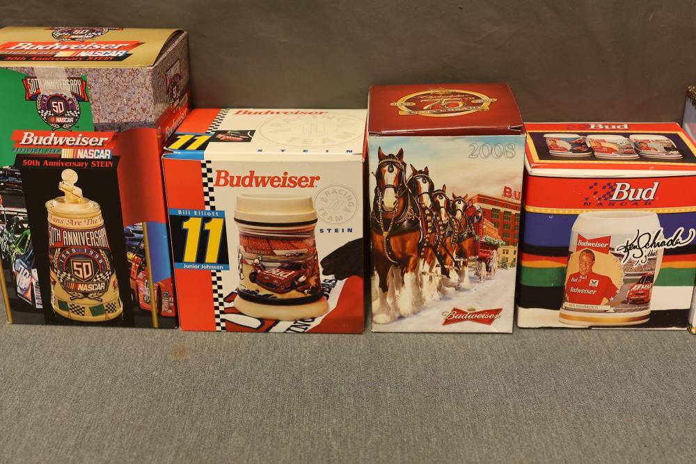 43 Beer Steins With Budweiser, Nascar, And Germanic Designs. Includes 35 unboxed beer steins and 8 new-in-box steins (boxes removed for photography). Features Anheuser Busch steins, Budweiser holiday and anniversary pieces, Nascar-themed commemorative steins, and Germanic-designed steins with phrases. Pickup only.