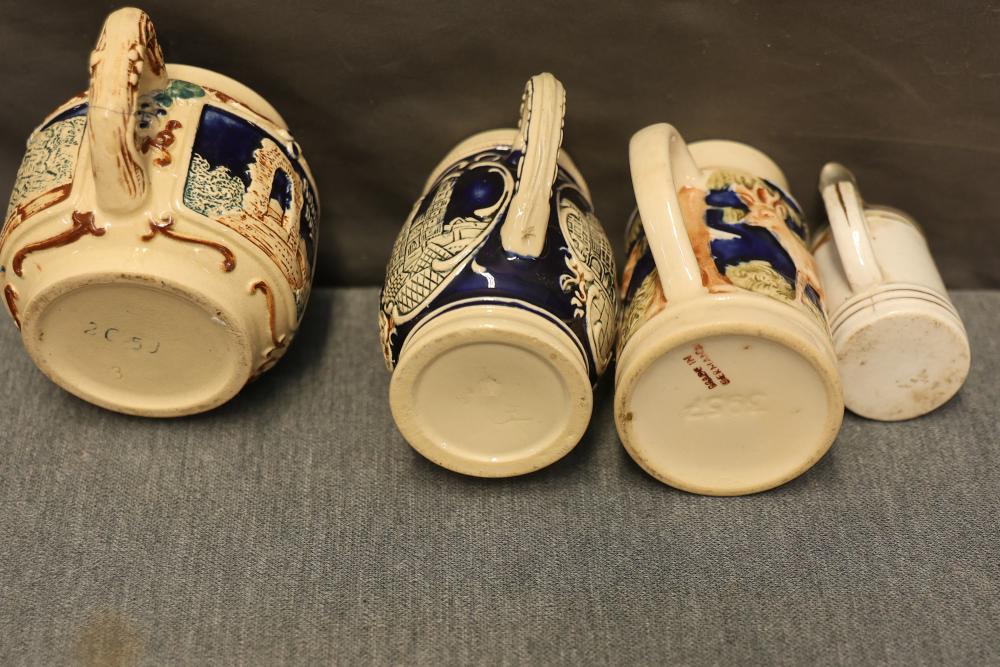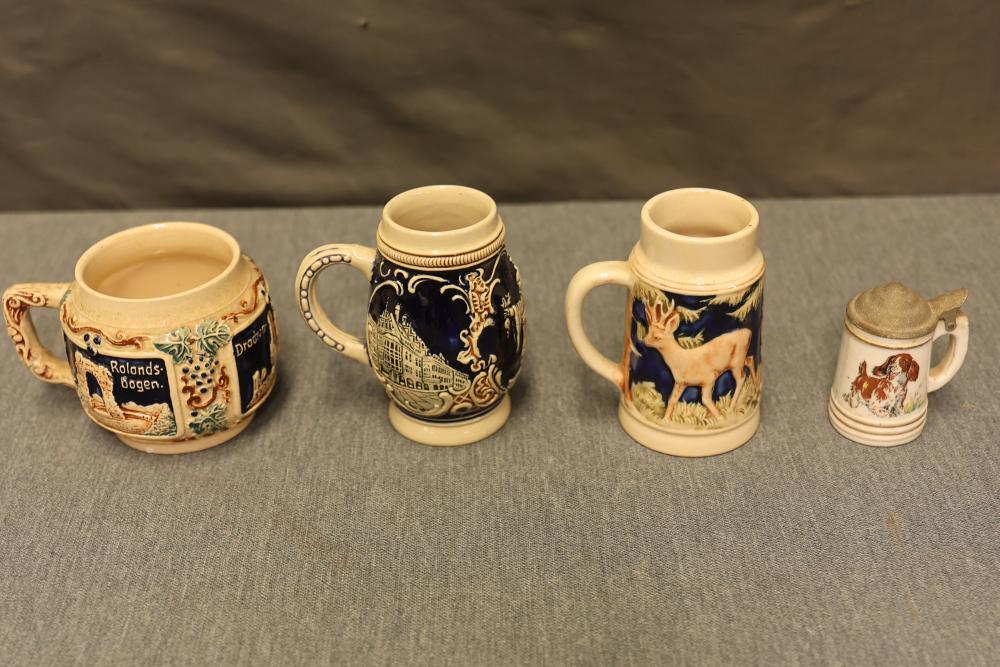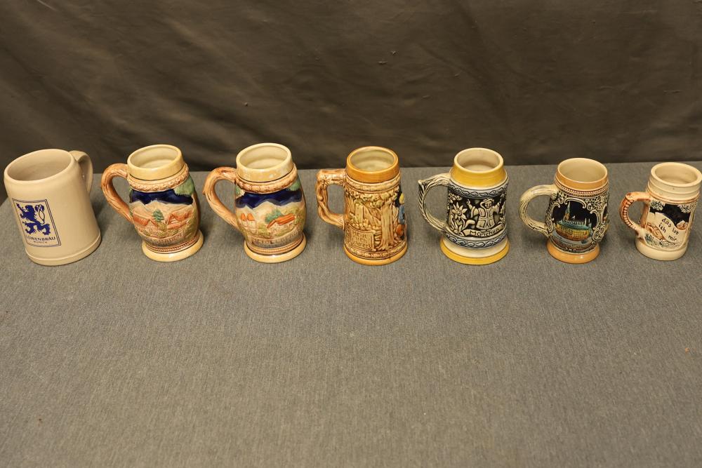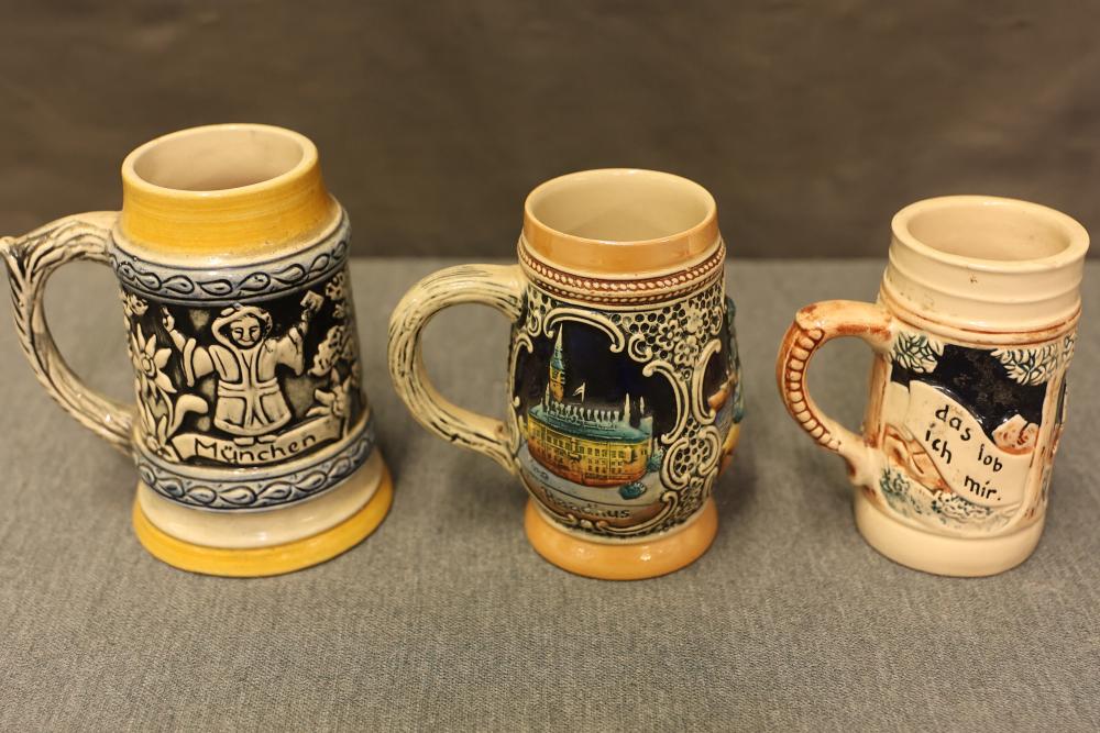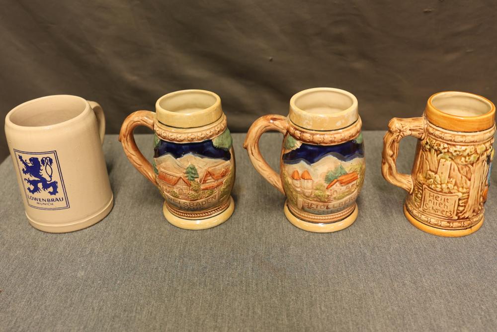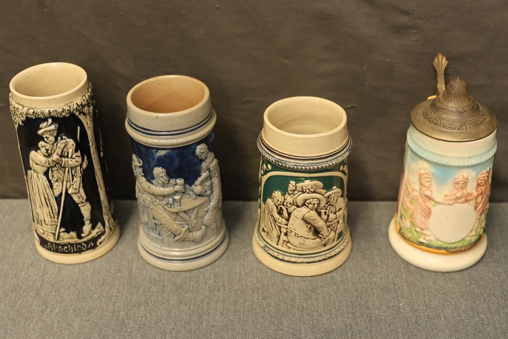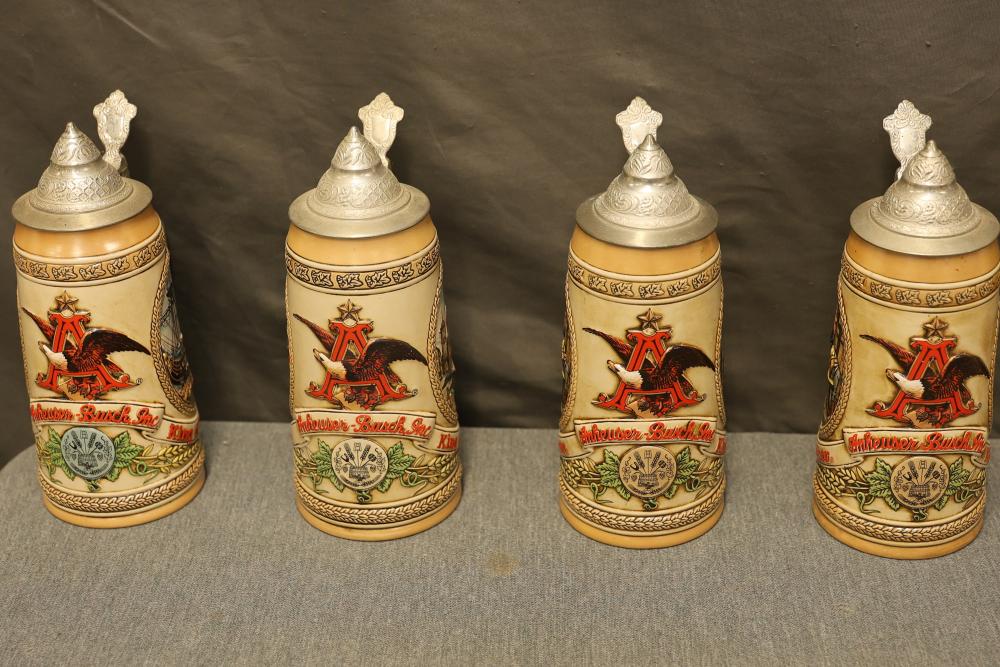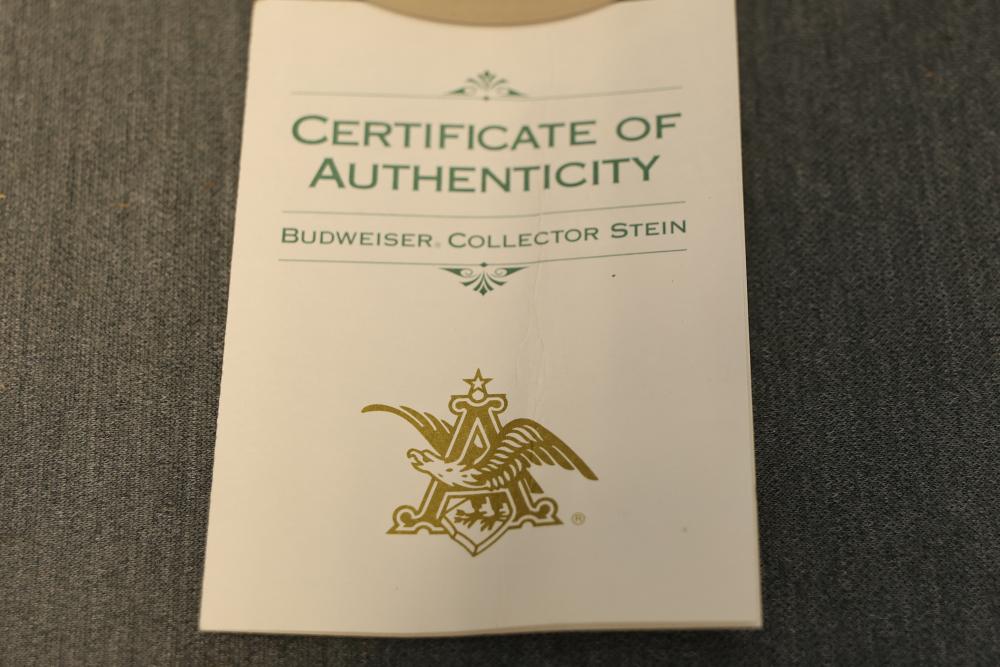 43 Beer Steins With Budweiser, Nascar, And Germanic Designs. Includes 35 unboxed beer steins and 8 new-in-box steins (boxes removed for photography). Features Anheuser Busch steins, Budweiser holiday and anniversary pieces, Nascar-themed commemorative steins, and Germanic-designed steins with phrases. Pickup only.